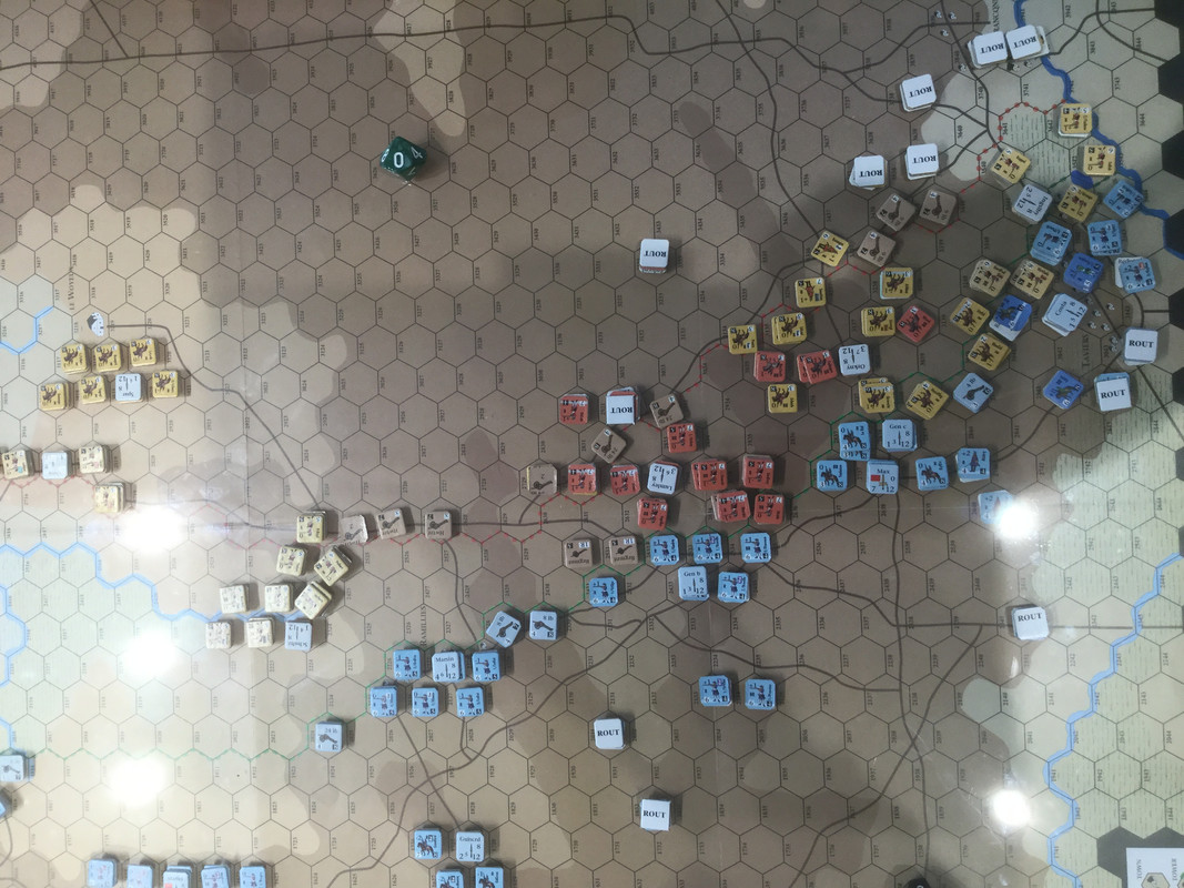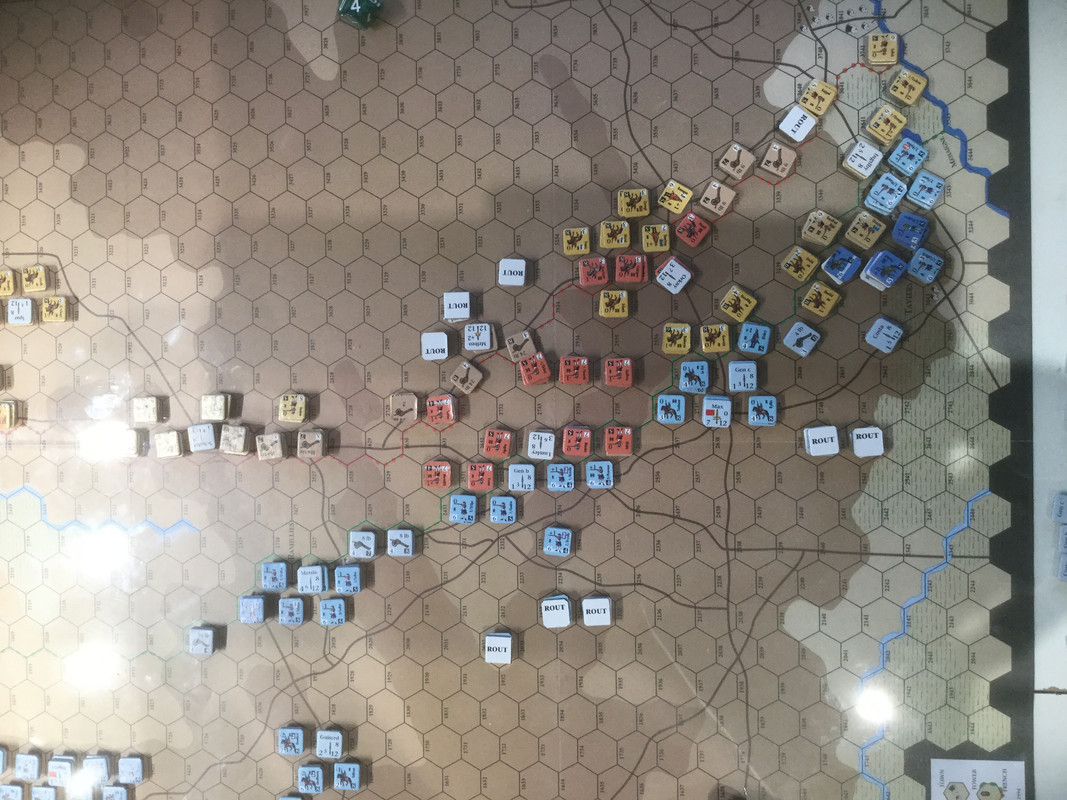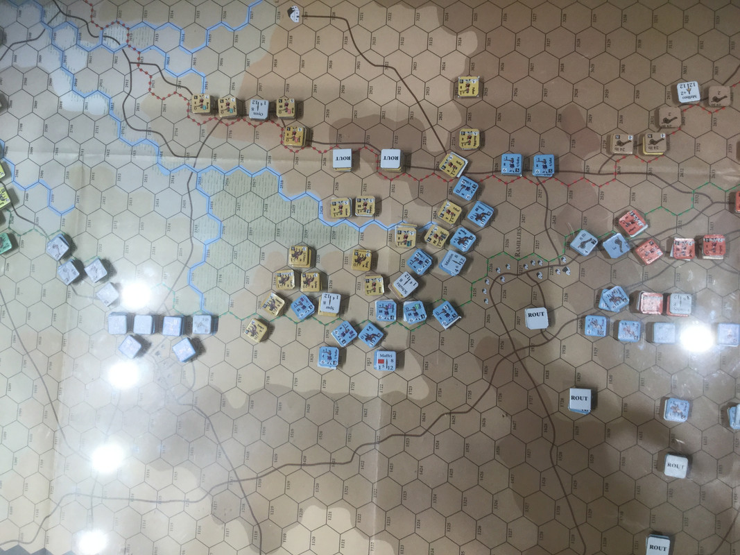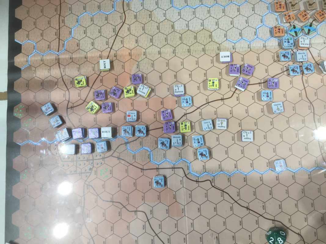 Mina förkrossande förluster, främst på högern, gör framgångar i centern akademiska. Jag passerar sammanbrottsnivån.  Slaget är över. Mitt elitkavalleri, det klart bästa i spelet kvalitativt , men ganska fåtaligt, so nu finns framför det brittiska infanteriet, kommer få fördröja hans förband på min höger (min egen höger avskrivs). I skydd av det avser jag dra ur åt nordväst. Inte helt enkelt med hans holländska kavalleri på offensiven i min center, och en potential ogynnsamma utveckling med dansk-tyskarna på vänstern.