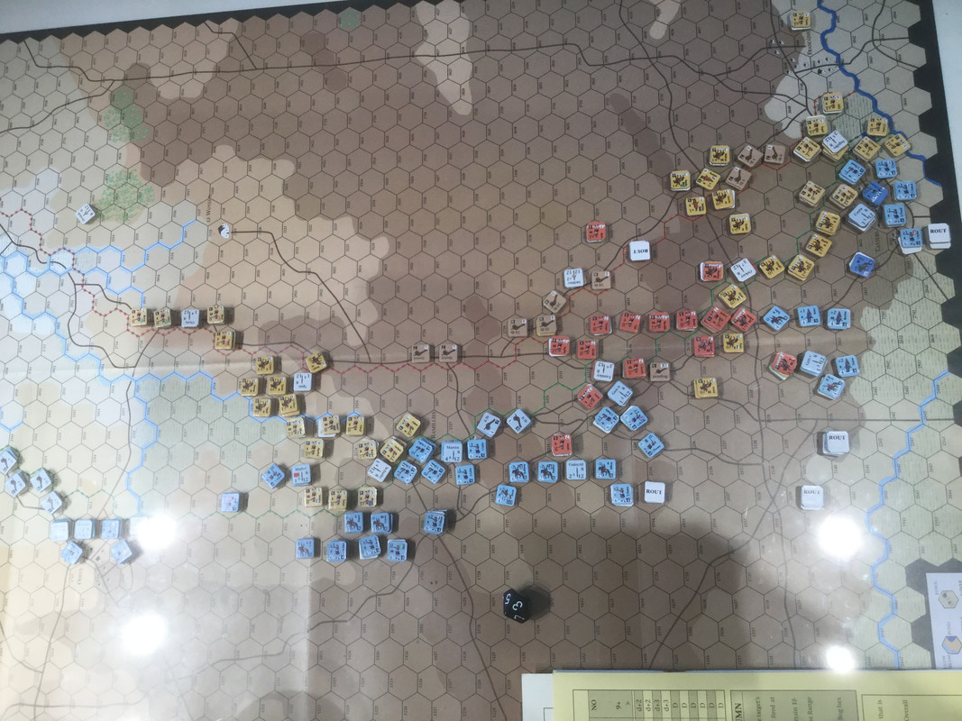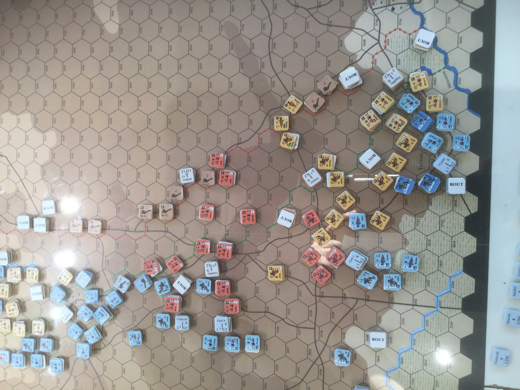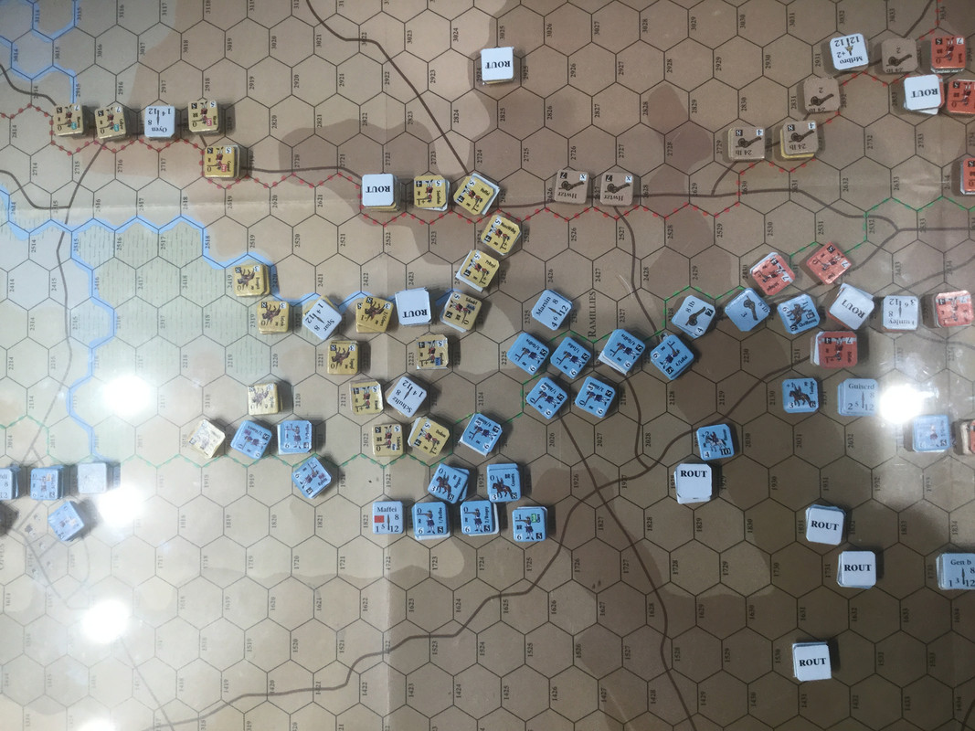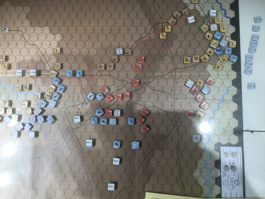 Mina förkrossande förluster, främst på högern, gör framgångar i centern akademiska. Jag passerar sammanbrottsnivån.  Slaget är över. Mitt elitkavalleri, det klart bästa i spelet kvalitativt , men ganska fåtaligt, so nu finns framför det brittiska infanteriet, kommer få fördröja hans förband på min höger (min egen höger avskrivs). I skydd av det avser jag dra ur åt nordväst. Inte helt enkelt med hans holländska kavalleri på offensiven i min center, och en potential ogynnsamma utveckling med dansk-tyskarna på vänstern.