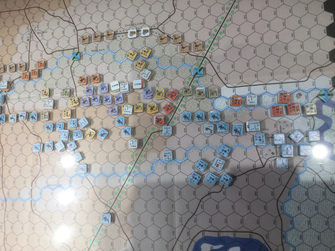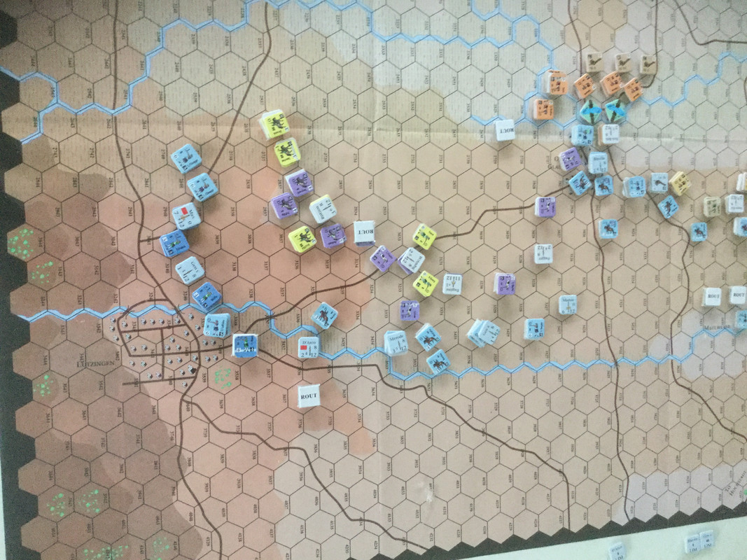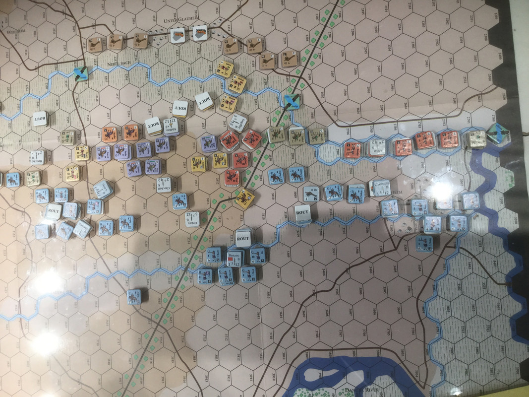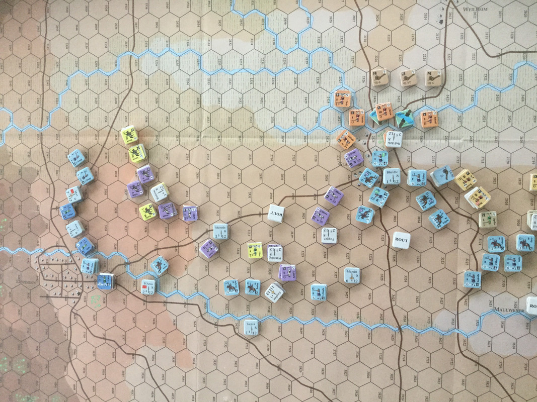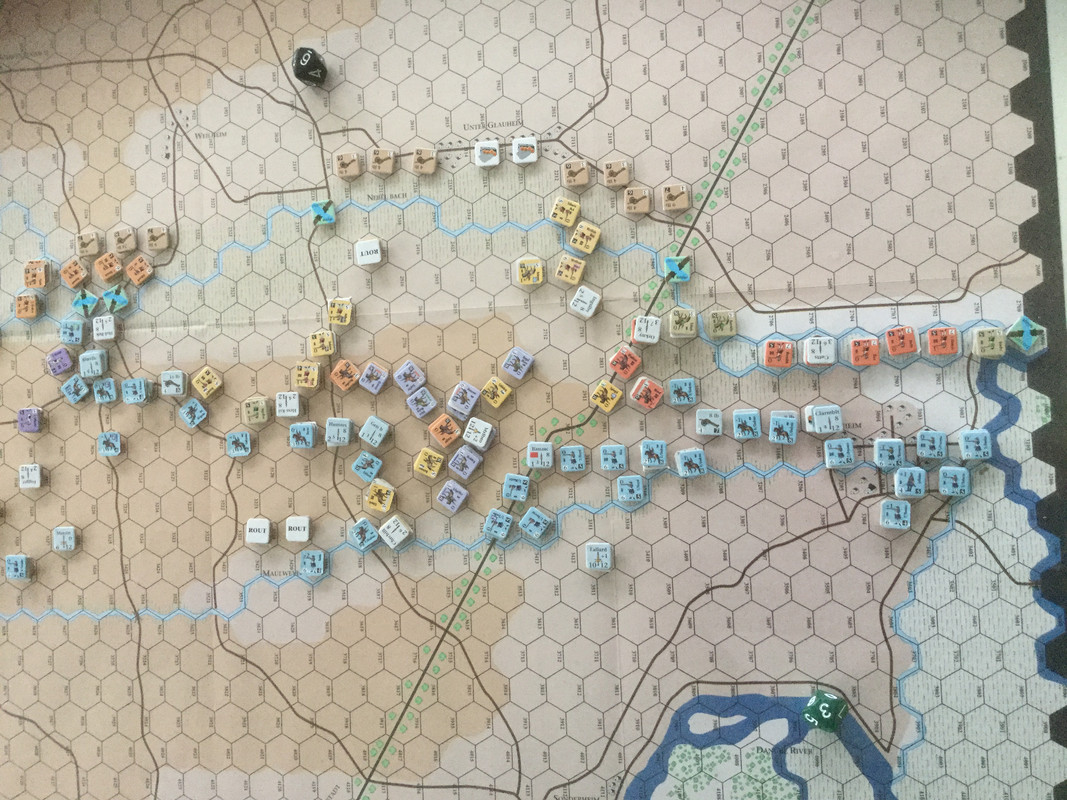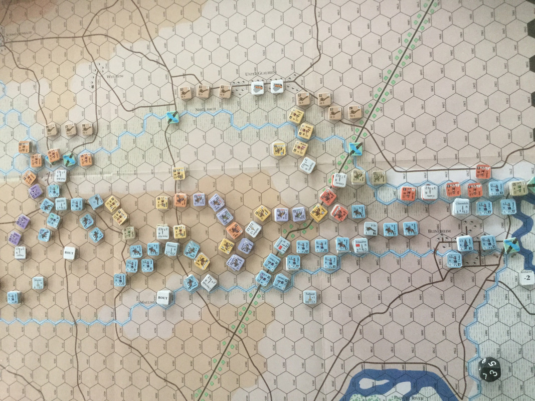 I väster håller den anglo-allierade dubbla omfattningen av Oberglau på att lyckas, men jag inleder en urdragning. Eugens infanteri är splittrat efter framgångarna mellan Oberglau och Lutzingen och kan inte med kraft avgöra. Rantzaus kavalleri är i ordning men skyddar flanken mot den avancerande franska yttersta infanterivänstern.