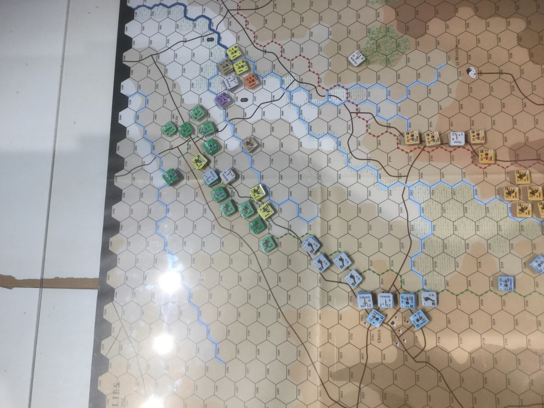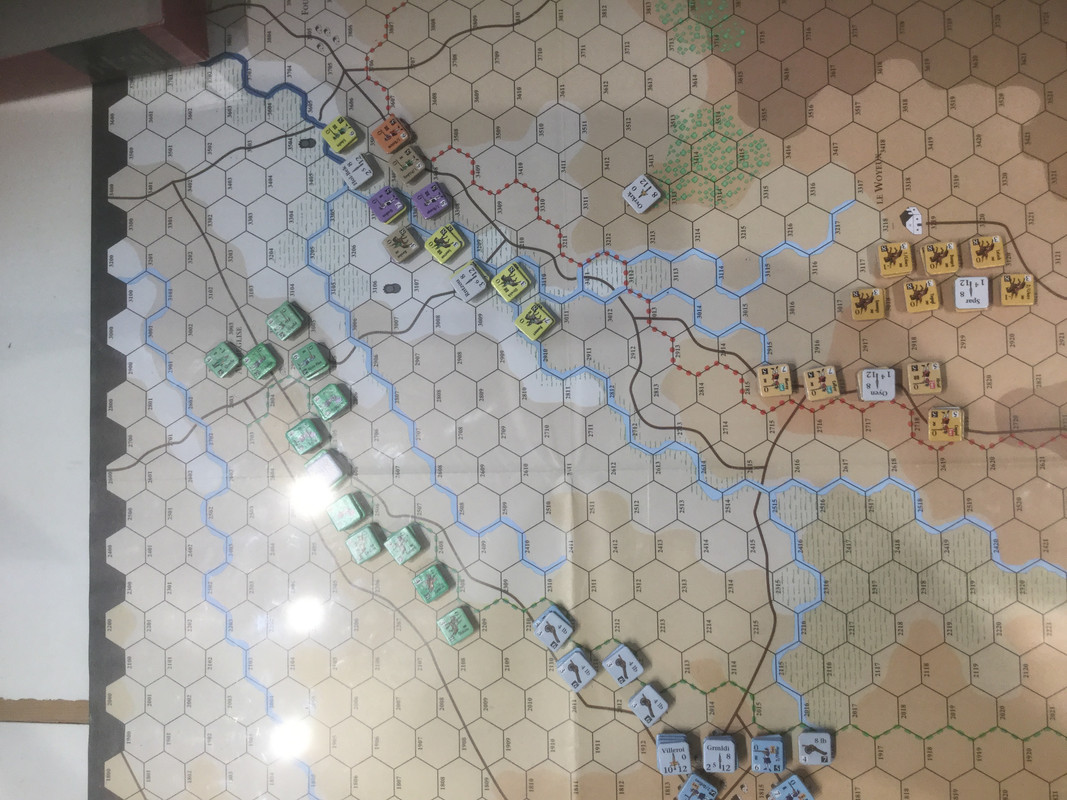 De angl-allierade pressar på med sin vänster mot min höger. Min yttersta infanterihöger håller byn och lyckas även ta tillbaka terräng på den yttersta yttersta högern. Även mitt infanteri som anfalls av det brittiska infanteriet  lyckas hålla, och till och med få till en ordnad front. Det brittiska infanteriet presterar klart undermåligt. Längre till vänster i bild har det holländska infanteriet i centern påbörjat framryckning över ån. Om britterna kan knäcka sina motståndare skulle en dubbel omfattning av det starka elitförbanden i den franska centern i byn Ramillies vara möjlig.
