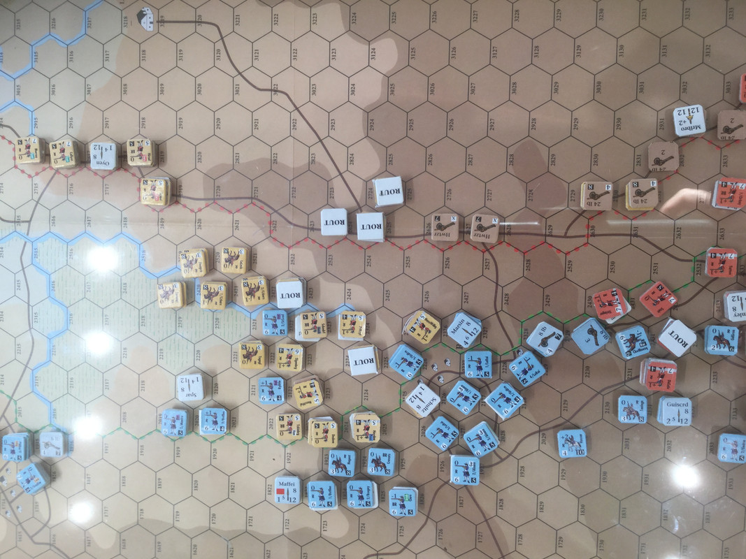 Förintandet av min höger fortskrider. Frågan är om det anglo-allierade kavalleriet kommer anfalla åt väster, mot centern, nu, eller mot höger och delta i krossandet av den yttersta högern. Svaret är inte solklart mot centern för att bryta den också. Det kanske går snabbare att slå ut styrkepoäng på högern och få min armé över sammanbrottsgränsen?