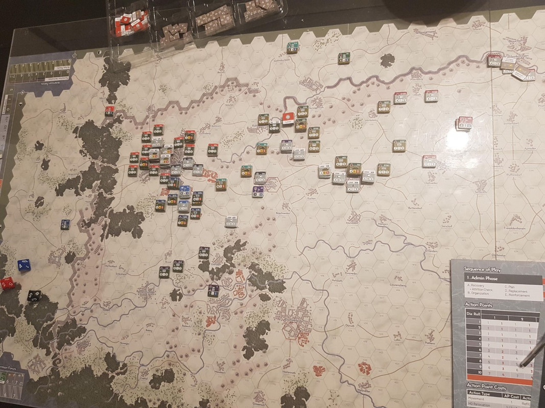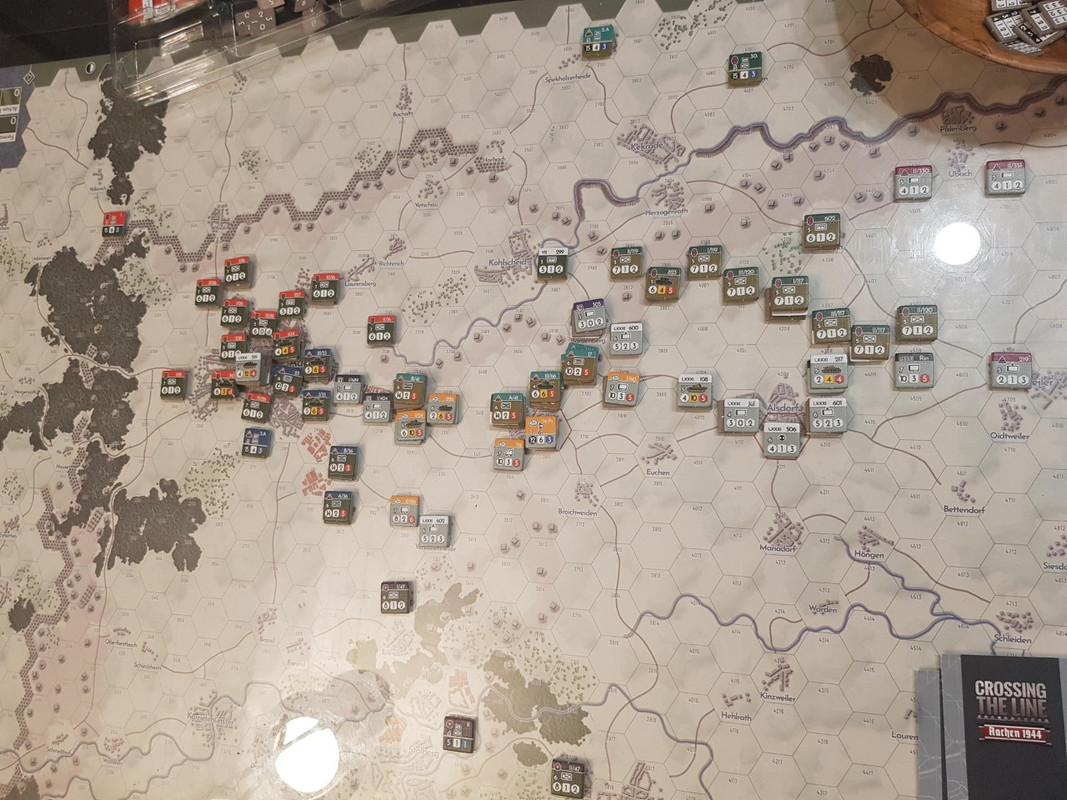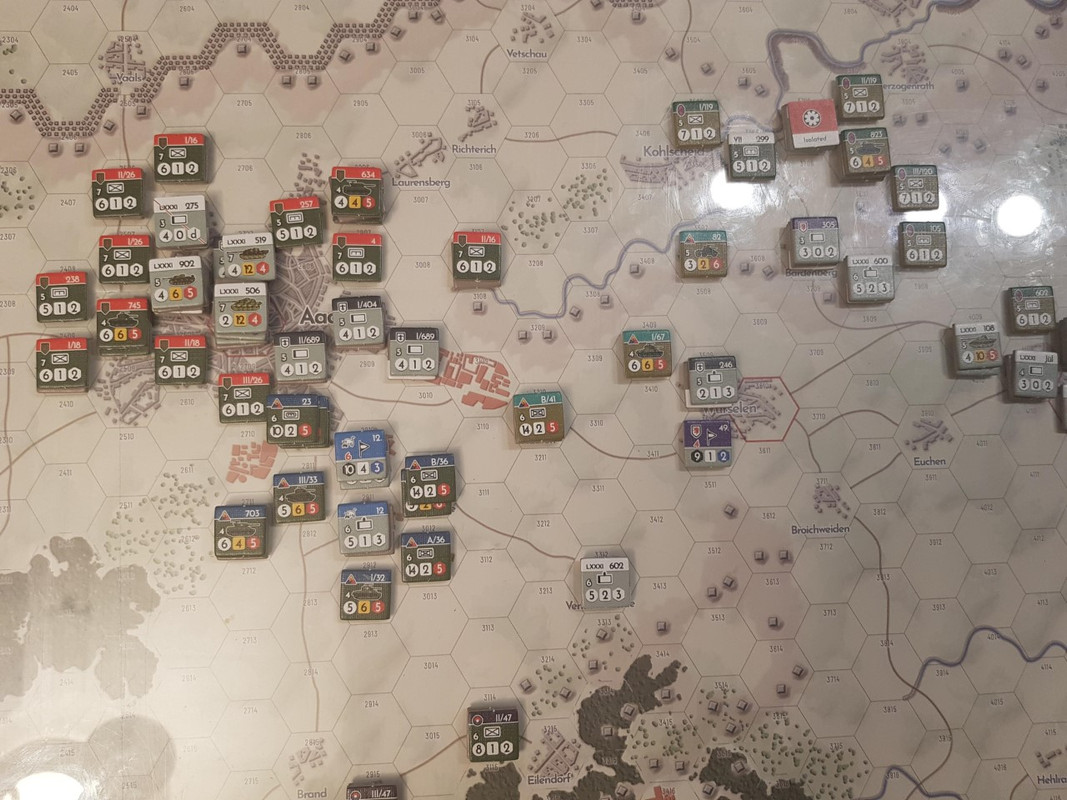Turn 6. I Aachen håller tyskarna en enda ruta i stadskärnan. Det var länge sedan deras sista hopp försvann, staden kommer att falla nästa turn. Längs korridoren som leder mot staden har det varit mer dramatiskt. Den tyska 116 Pz har slagit sig fram mot Aachens förorter, men fast de tagit sig framåt så går det alltför sakta. Deras motståndare är den nu fulltaliga 2nd Arm och fast tyskarna har bättre stridsvagnar så är jänkarna många och tillräckligt starka för att inte behöva vika ner sig.