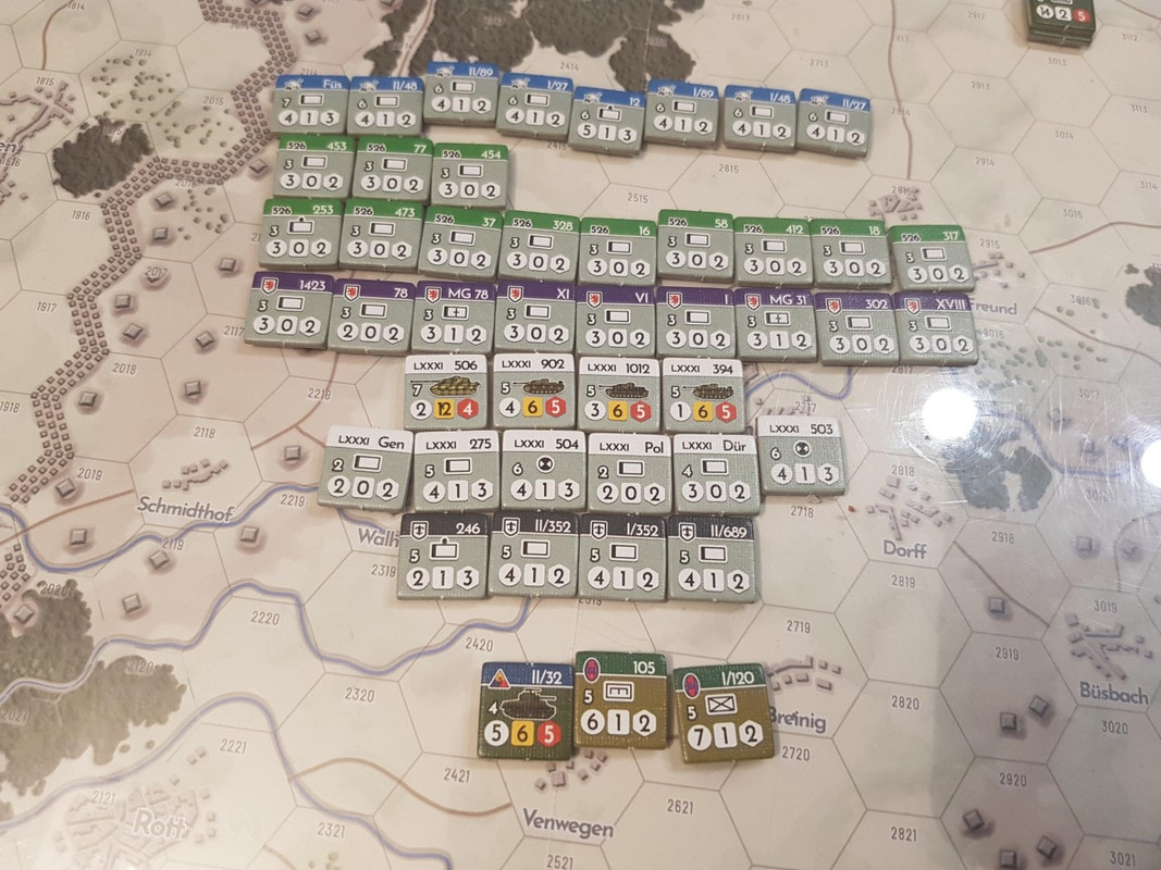 Det ska till en masochist för att spela tyskarna den här rundan, dom är i det närmaste helt tandlösa och får skyffla runt svaga förband för att stå i vägen en impuls eller två.  Den 30 inf-divisionen längst i öster stoppades (ish) av tyska ad-hoc förband som kastades fram i sista sekunden. En tysk KG lyckades slå ut en hel bataljon. men försvarsstridens huvudsakliga uppgift syftade till att ge den snart ankommande 116 Pz grupperingsutrymme för ett motanfall mot staden.
