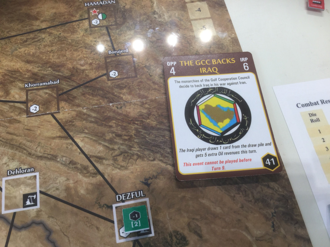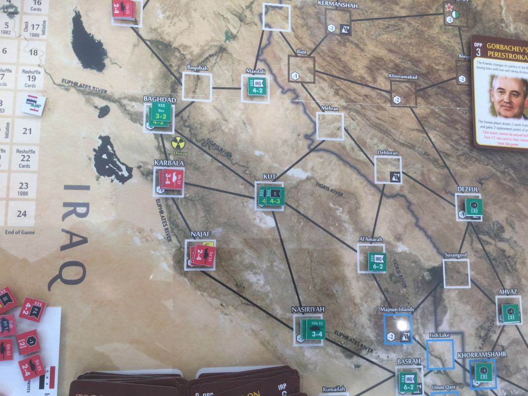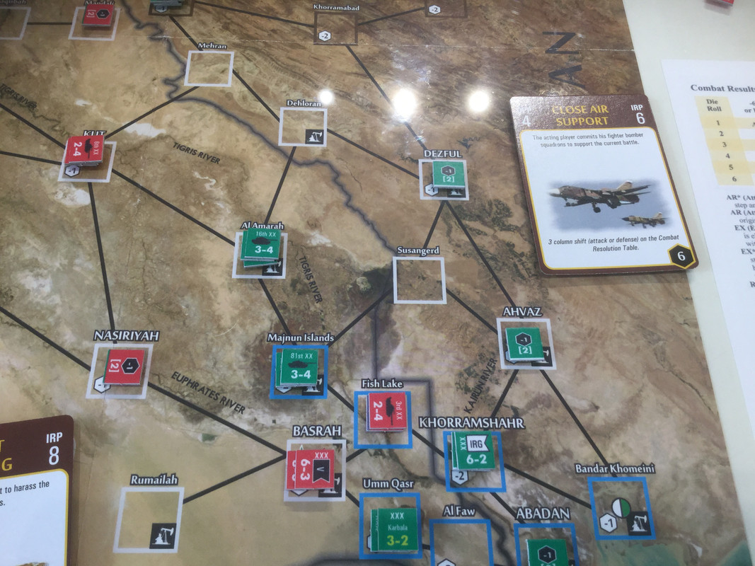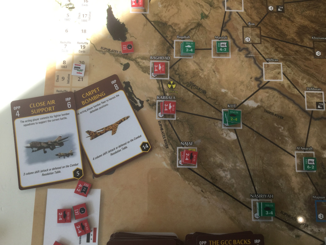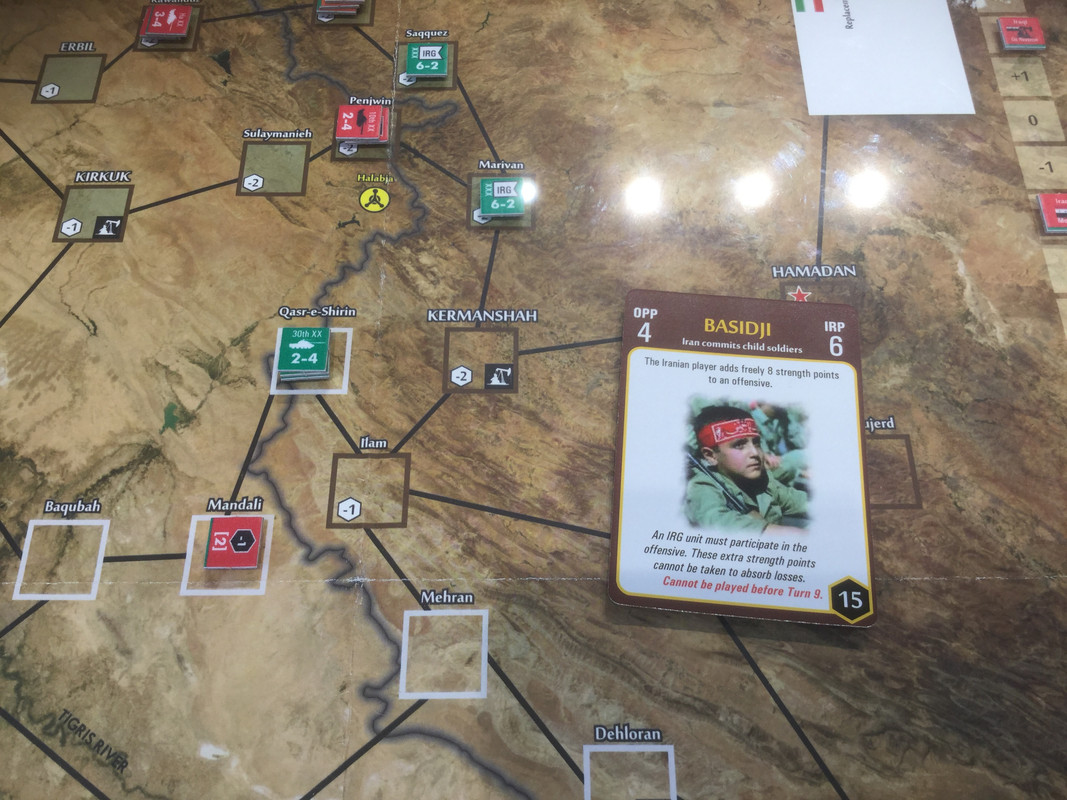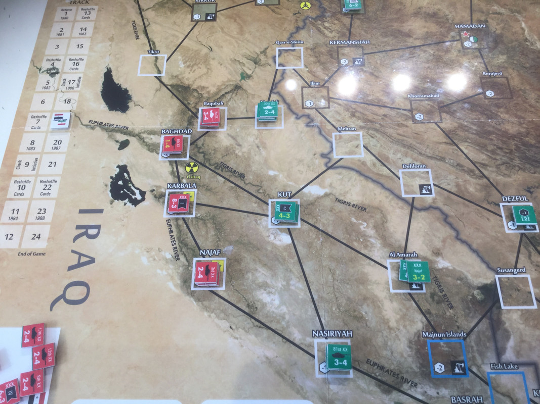 Med sina bristande resurser, jag sitter nu på nästan alla oljefält, lägger irakierna resurserna på ett ersätta förluster och hamstra bra stridskontakt. En händelse spelas dock. Kanske för sent? Det finns ett antal kort som gör att USA blir allt mer gramse påIran och vidtar åtgärder som sänker Irans moral och vilja till krig. Nu kommer de lite sent...