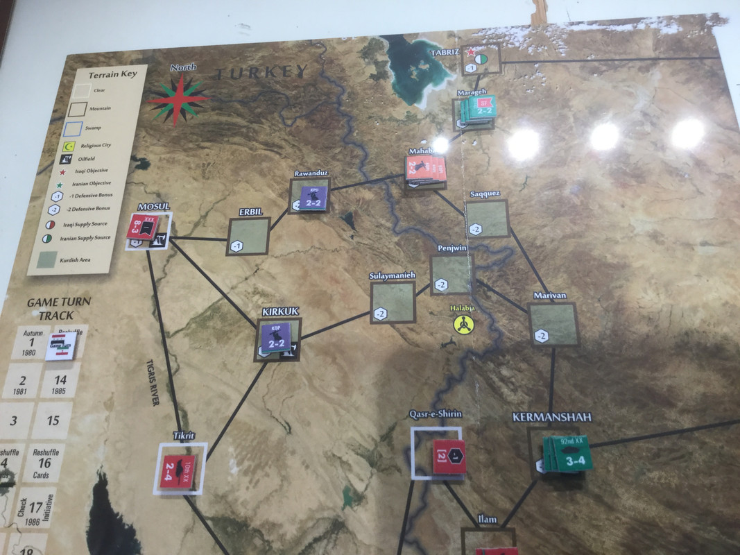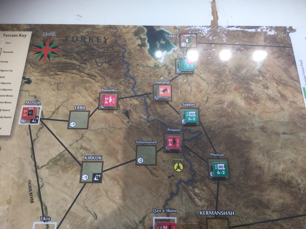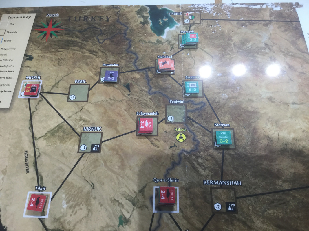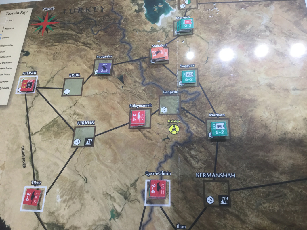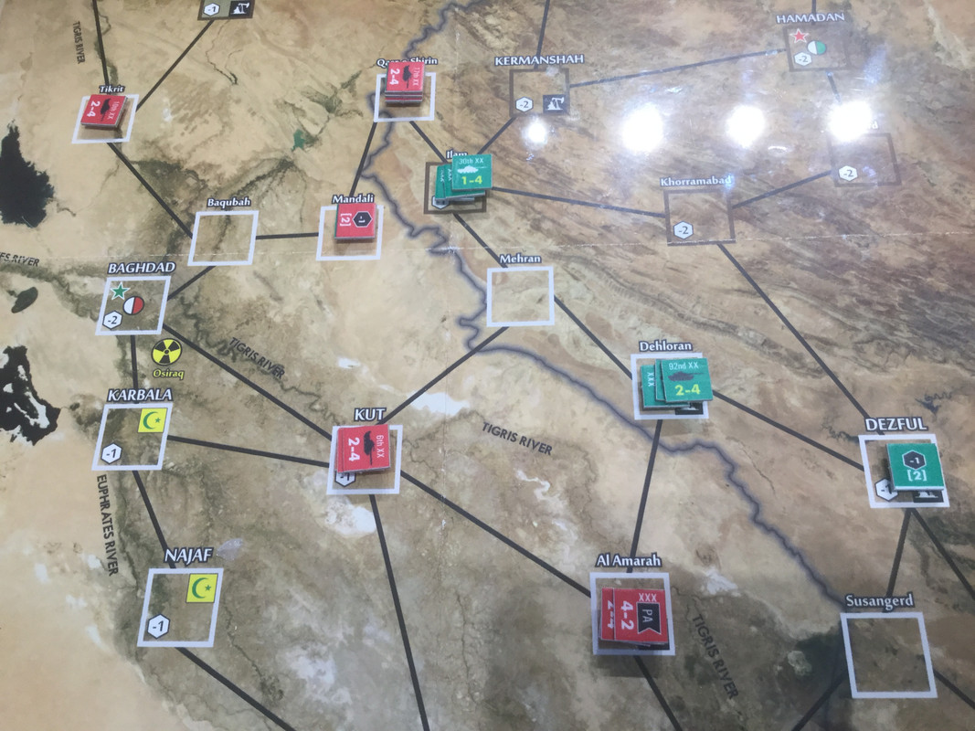 När min omgång är klar står jag i Kut i söder och kan nå Baghdad, som har lite samma roll som Berlin i VK2, och i centern närmar sig det islamiska revolutionära gardet också Baghdad. Nedan bilden efter irakierns omgång. TT försvar av Baghdad byggs upp.