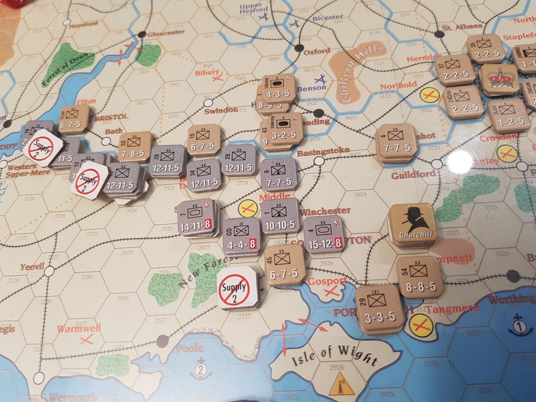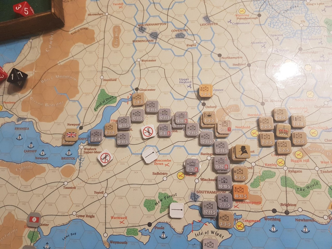 Turn 15. Vädret blir naturligtvis fint. Royal Navy tillåter tunga kryssare i kanelen, så tyskarna avstår från att skicka underhåll. Ett par divisioner på kritiska ställen underhålls från luften. Kriegsmarine är så nära undergång att varje förlust påverkar påtagligt. Tyskarna rycker fram i sakta mak och britterna håller sina positioner. Det vi ser på bilden är spelets slutläge.