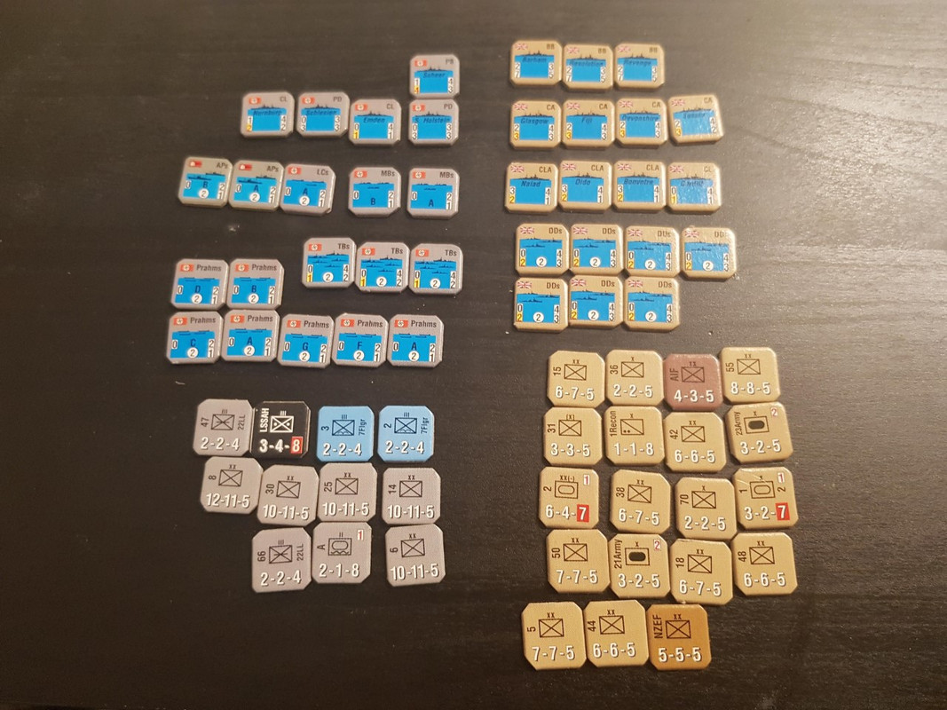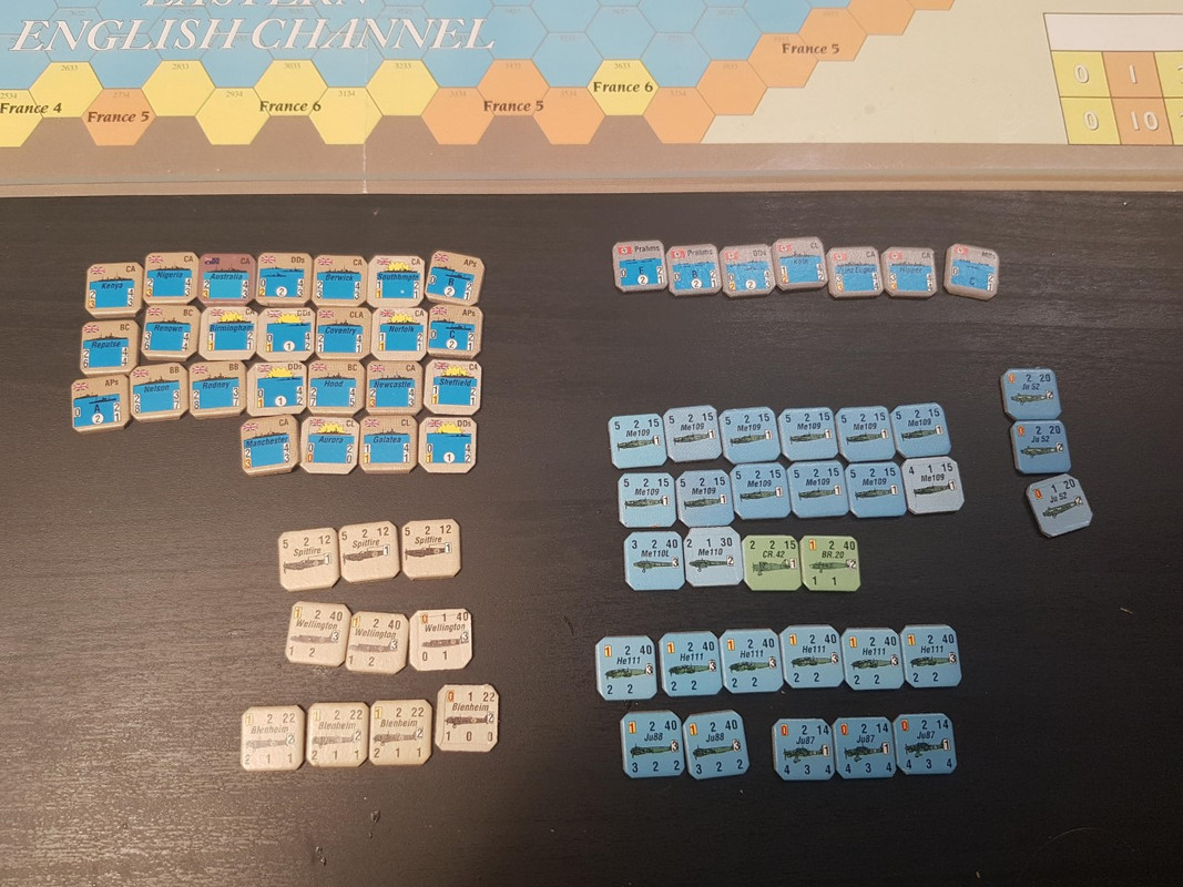 Royal Navy är ordentligt decimerat. Tre slagskepp på en turn sved ordentligt. Sedan är det några tunga kryssare och ett betydande antal lätta kryssare och jagare (de brickorna representerar flera skepp).  Kriegsmarine är i praktiken utplånat. Det finns tre kryssare kvar i hela flottan; inga jagare, inga slagskepp och inga torpedbåtar.  Några pråmar finns kvar, alla transportfartyg av värde är sänkta. Dom är helt slut.