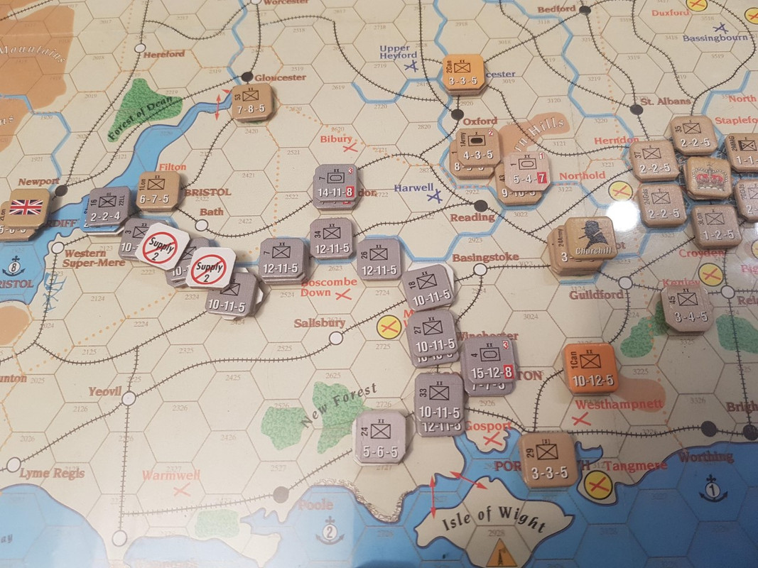 Tyskarna får över underhåll till mer än hälften av förbanden, delvis tack vare ett tillskott av Ju-52:or. Göring förklarar mellan inskyfflandet av strömmingssnittar att hans Luftwaffe förmodligen kunnat vinna kriget själva. Southampton erövras och ett anfall norrut skapar ett brohuvud över floden. Britterna faller tillbaka och täcker London så gott det går.