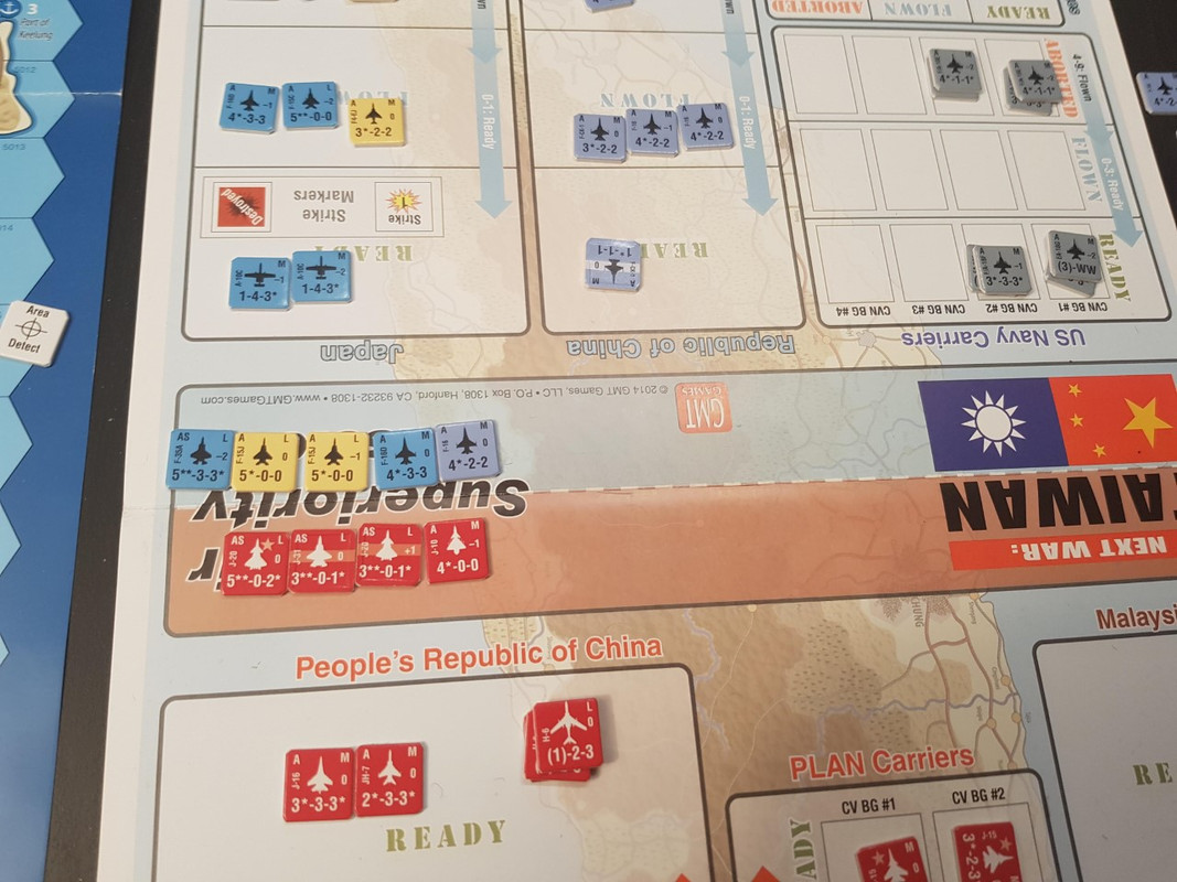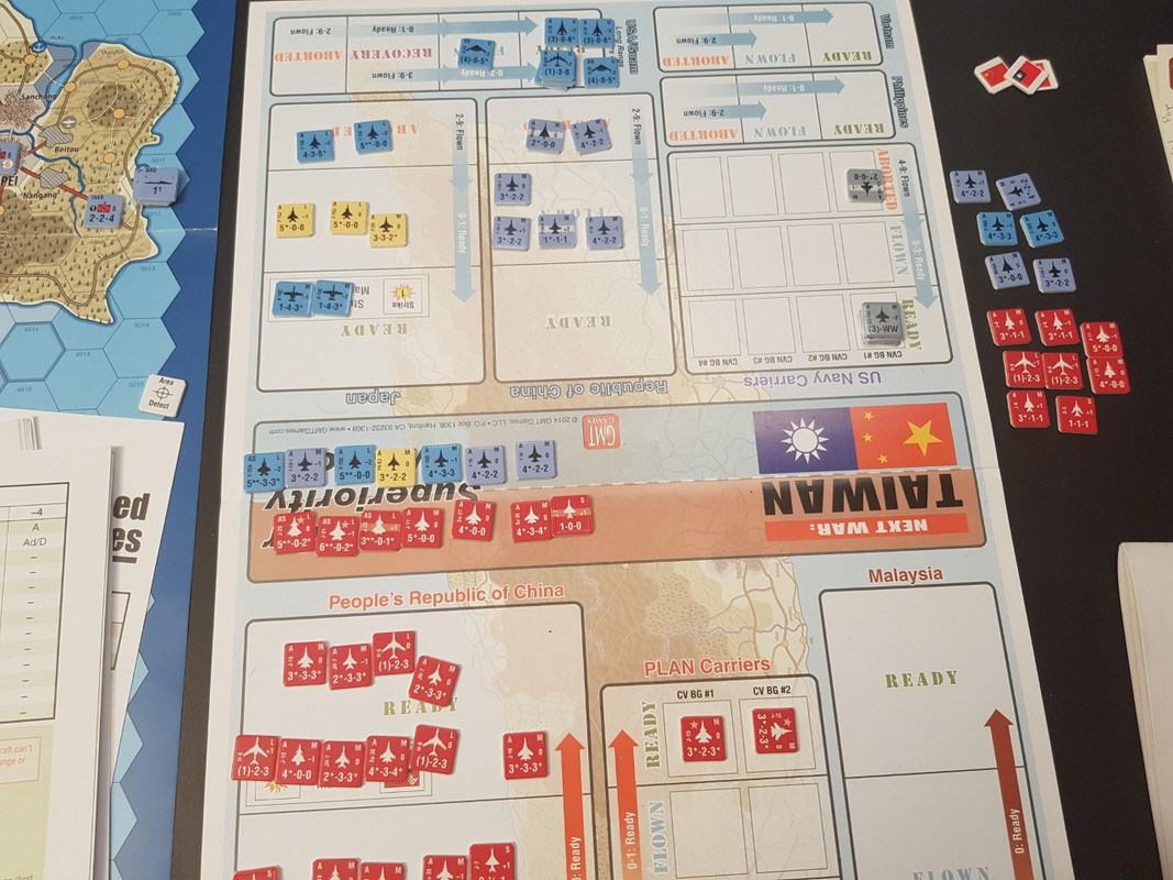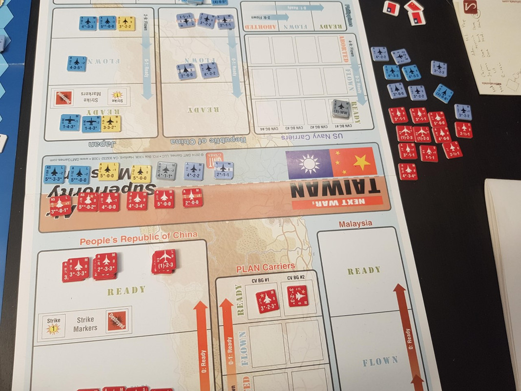 Flygbilden är efter flygstriderna. Det är contested i luften. Några duktiga piloter i F-15E lyckas skada några stealth-plan. De utslagna brickorna (totalt i spelet) syns till höger. Kina har fortfarande övertag i antalet attackplan, men i övrigt väger det. Det kom att märkas under turnen.