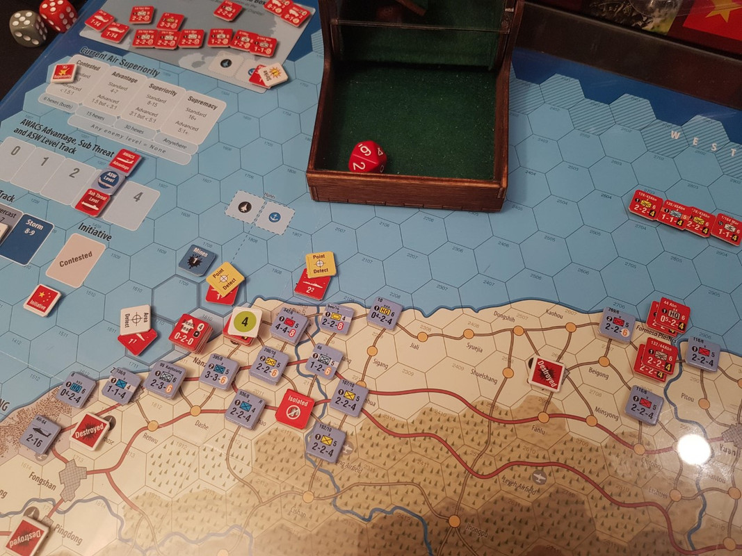 Jag inser nu att valet av landstigningsplats är helt avgörande. Kina har tillgång till säkert 7-8 mekaniserade divisioner som jag aldrig fick in. Det finns ett annat spel i den här lådan, ett spel som jag aldrig såg. Det skulle också vara intressant att se USA skicka in marktrupper, men jag vet inte hur det skulle gå. Nu hade ROC 2-2-4 som standard, med 4-4-8 som spjutspets. Båda med 5 i kvalitet. Jänkarna har brickor som har 7-8-7 med 7 i kvalitet. Hur hanterar man det?