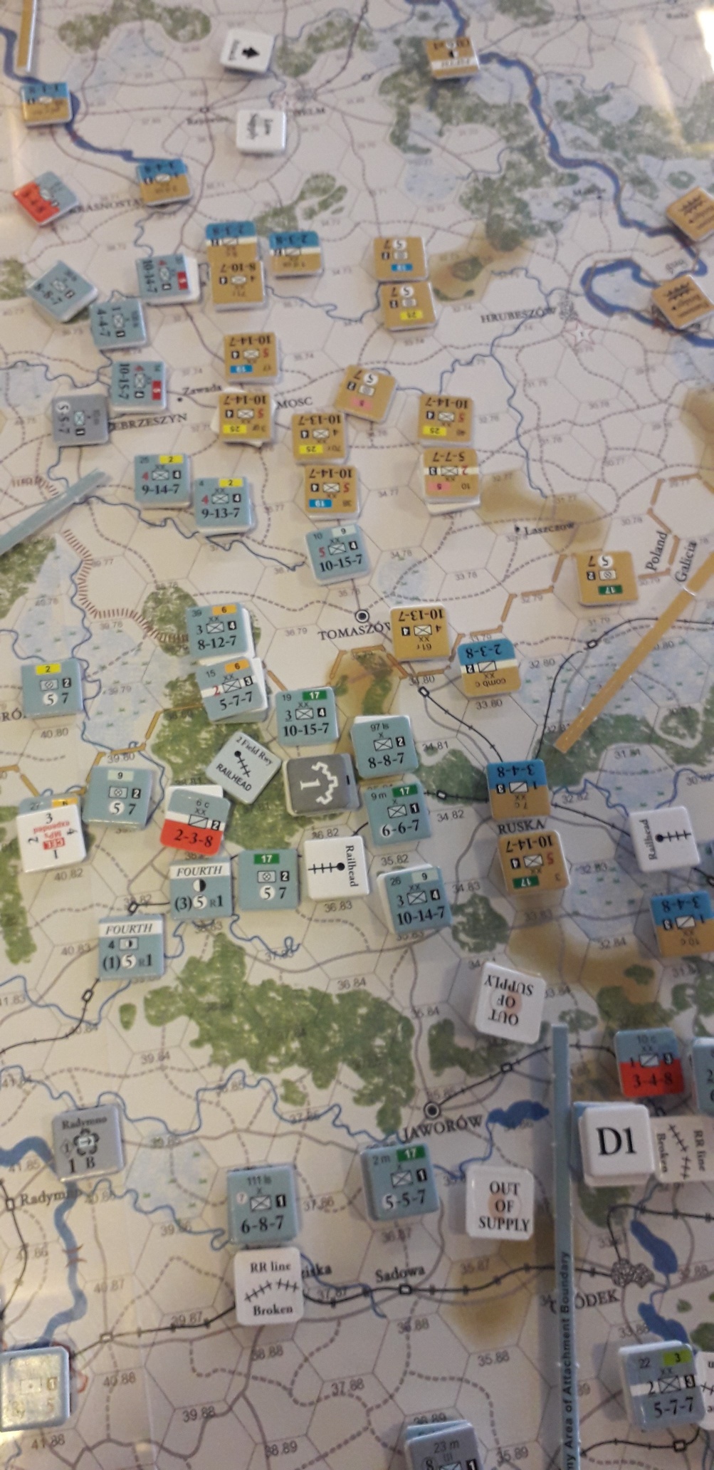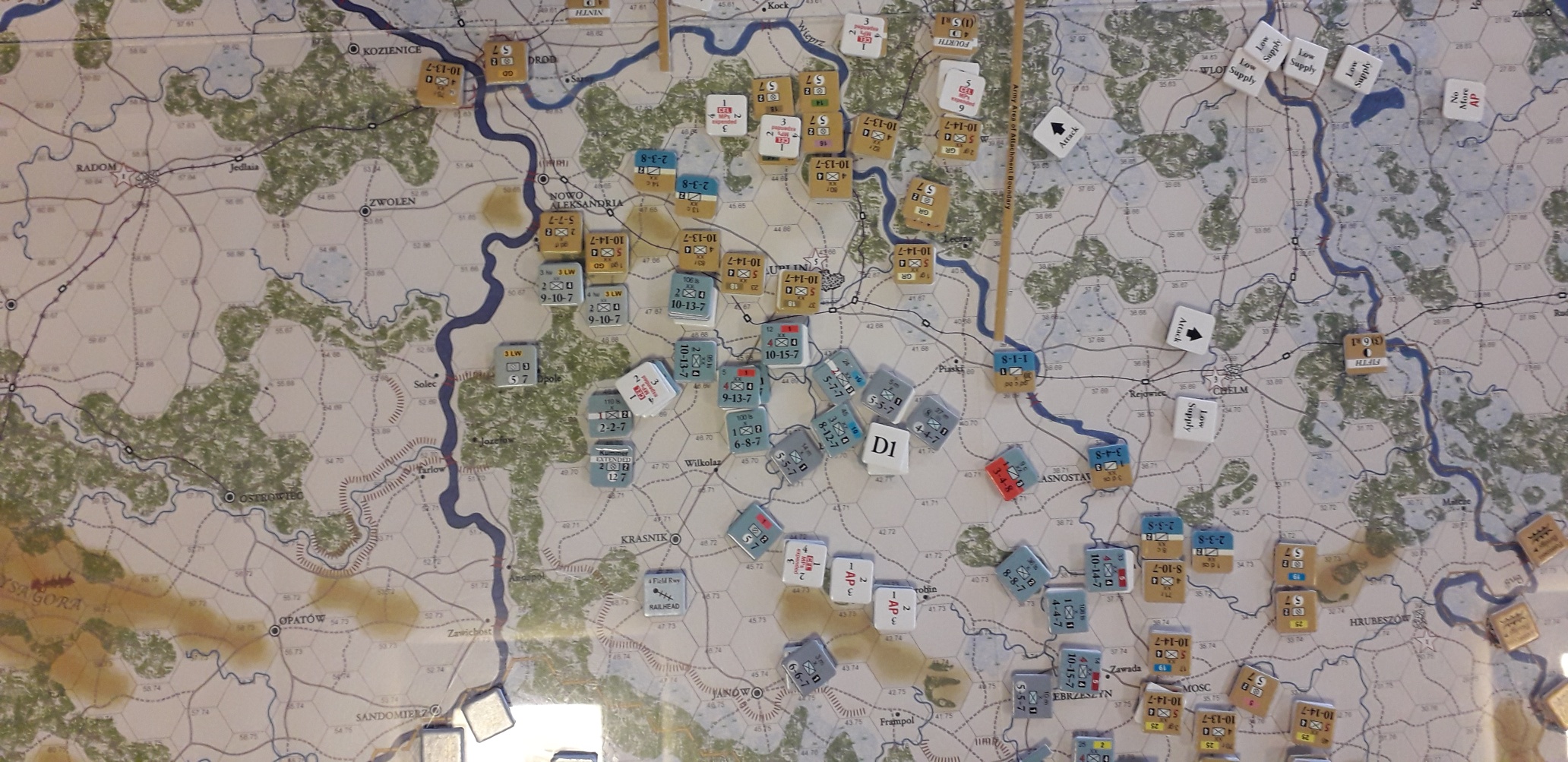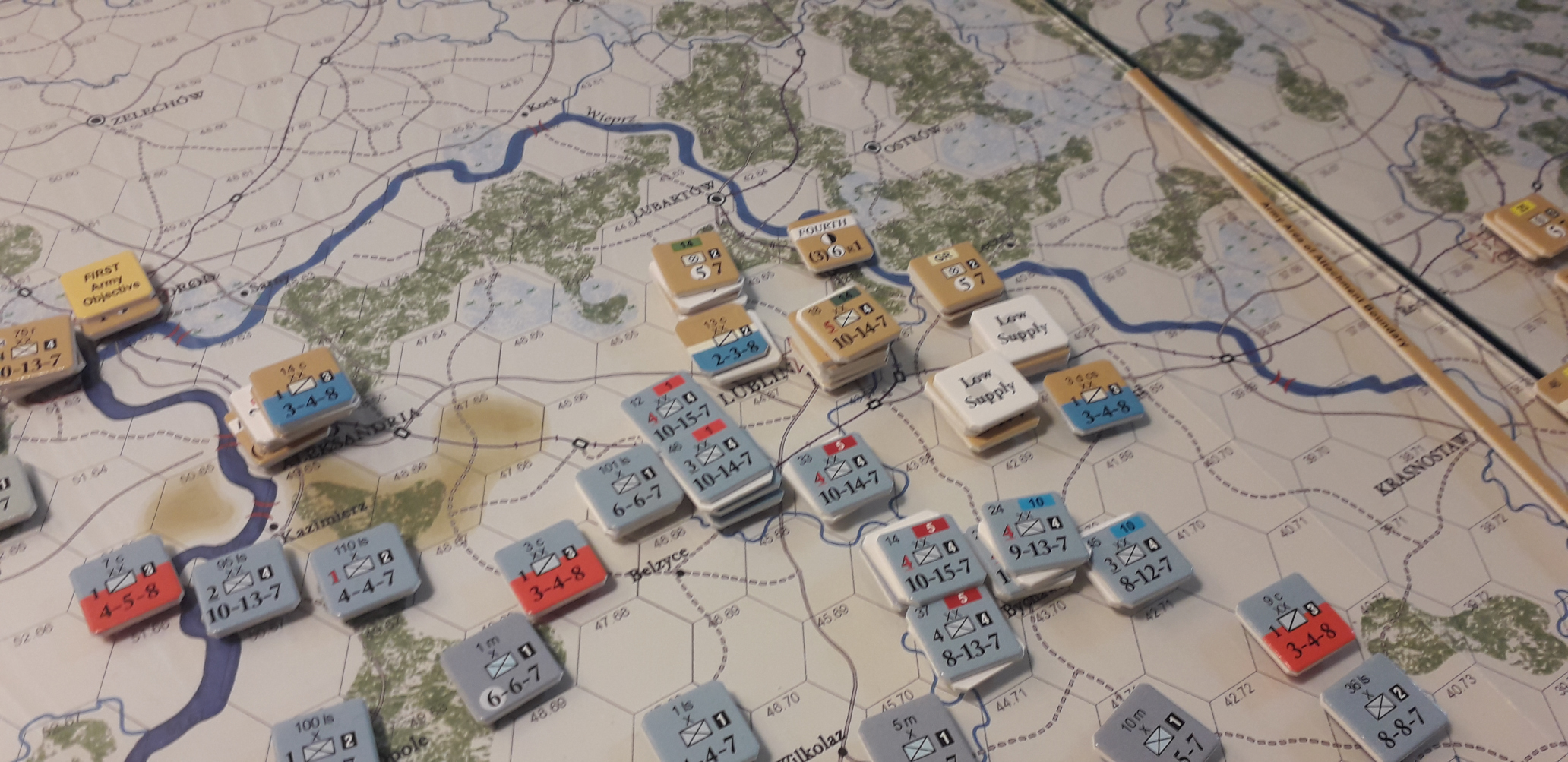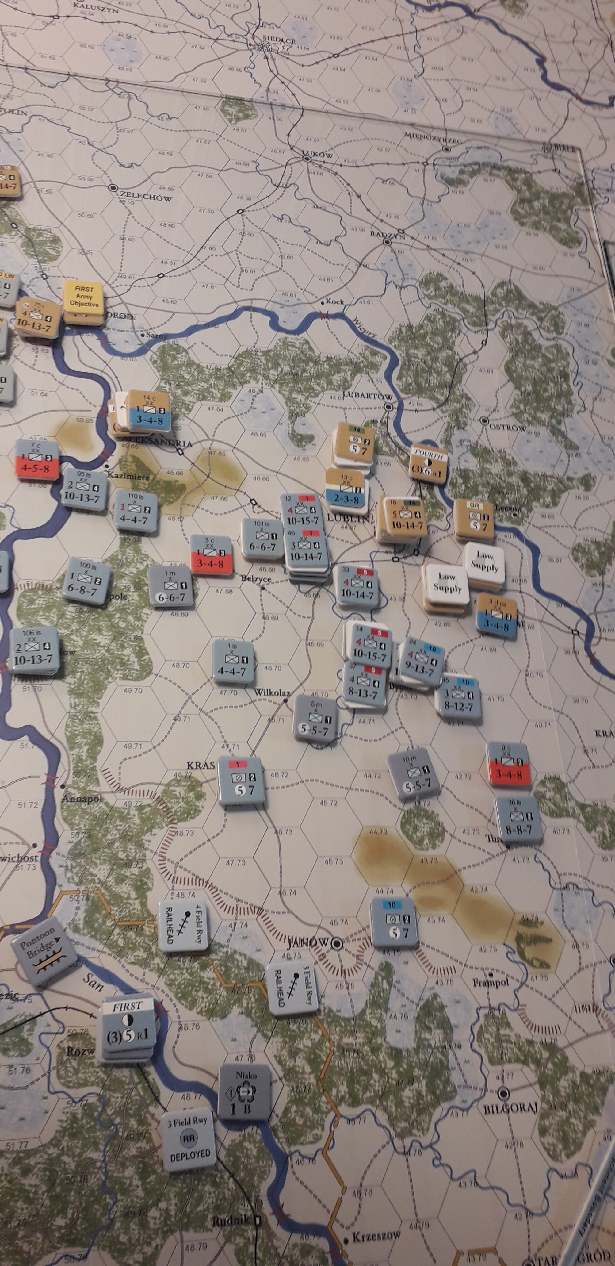 Under våra strider i Rimforsa så hade jag fullt upp med mina egna arméer och hängde inte med på vad som försiggick på andra sidan armé-gränserna. Ett område som jag inte följde var den västra delen där den starka Habsburgska 1:a armén hade i uppgift att erövra Lublin. På den ryska sidan fanns där den 4:e armén. Plötslig i Rimforsa så kom det väldigt goda nyheter från Björn, Lublin erövrat och jag behövde inte följa den förutbestämda strategiska planen med min 4:e armé. Detta öppnade upp mina möjligheter för ett mer aktivt försvar, något jag inte lyckades med, fast det är en annan historia.