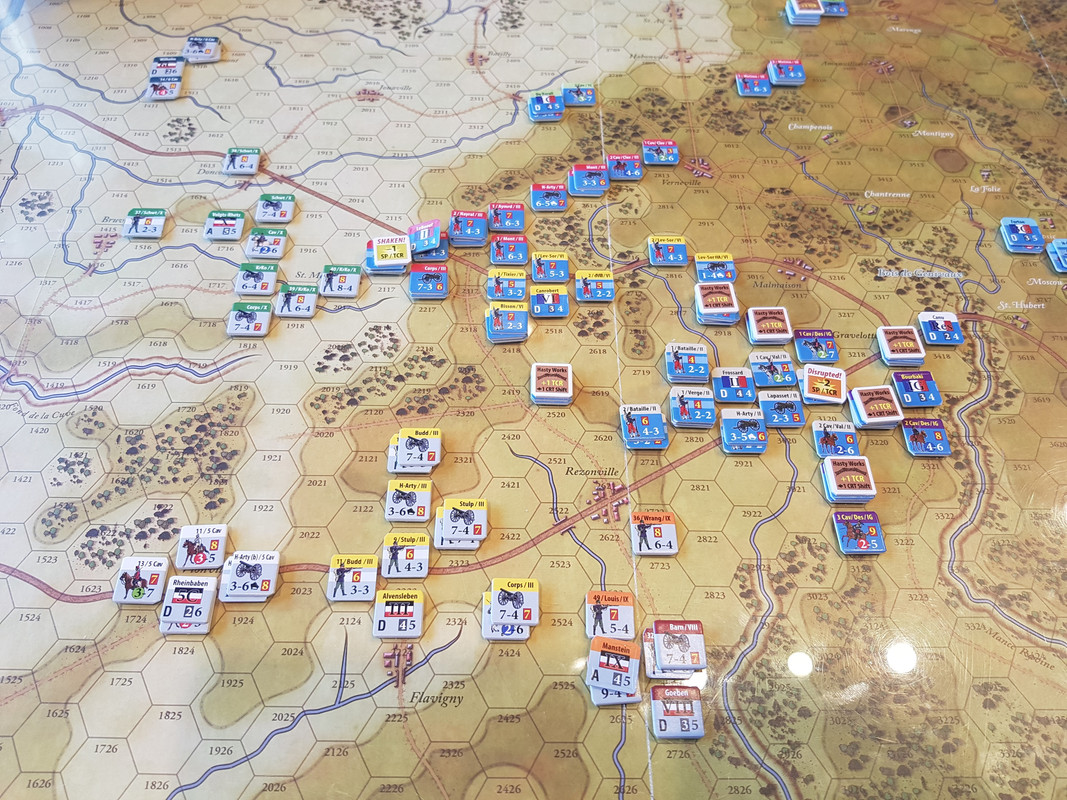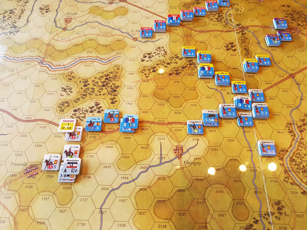 Korvmusmsande preussare lyckades också nästla in sig i byn Flavigny där ihärdiga motanfall av divisioner ur både de II. och VI. franska kårerna slogs tillbaka. Nu står gardeskåren på tur att ge sig in i köttkvarnen. Samma preussiska brigad har hållit stången länge nu, men den är den starkaste enheten i spelet (8SP) och svår att flytta på överhuvudtaget.