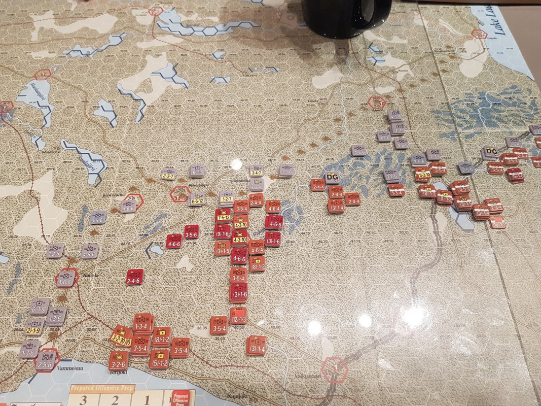 Spelet slutar redan turn 5 eller 6, minns inte riktigt (det finns ingen turn track märkligt nog). I spelet har man som ryss en Stalin-regel som gör att man inte riktigt vet hur lång tid man har på sig. Man kan försöka blidka landsfadern med att ta relevant terräng eller dra ur trupper till det riktiga kriget, men han surnar ändå till slut. Här gjorde han det tidigt, jag läste att i snitt pågår spelet runt 14 turns. jaja.