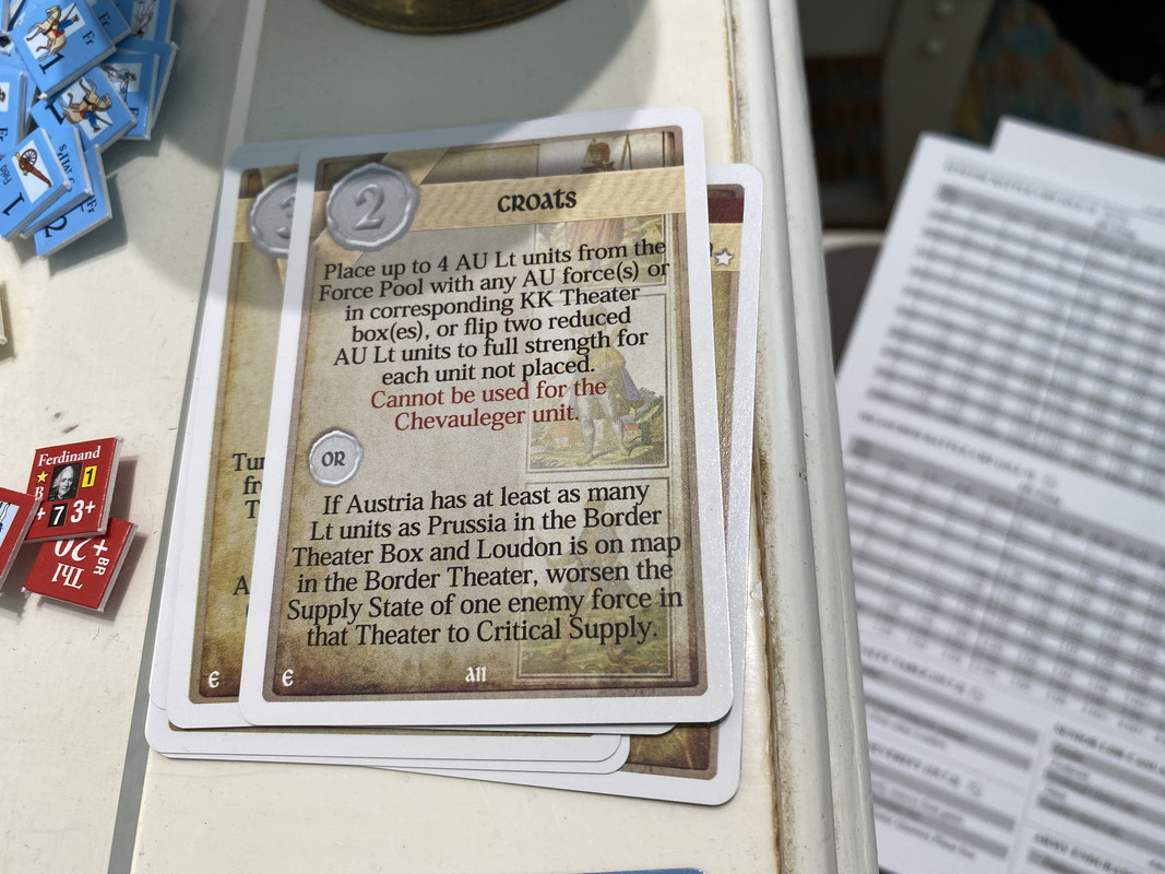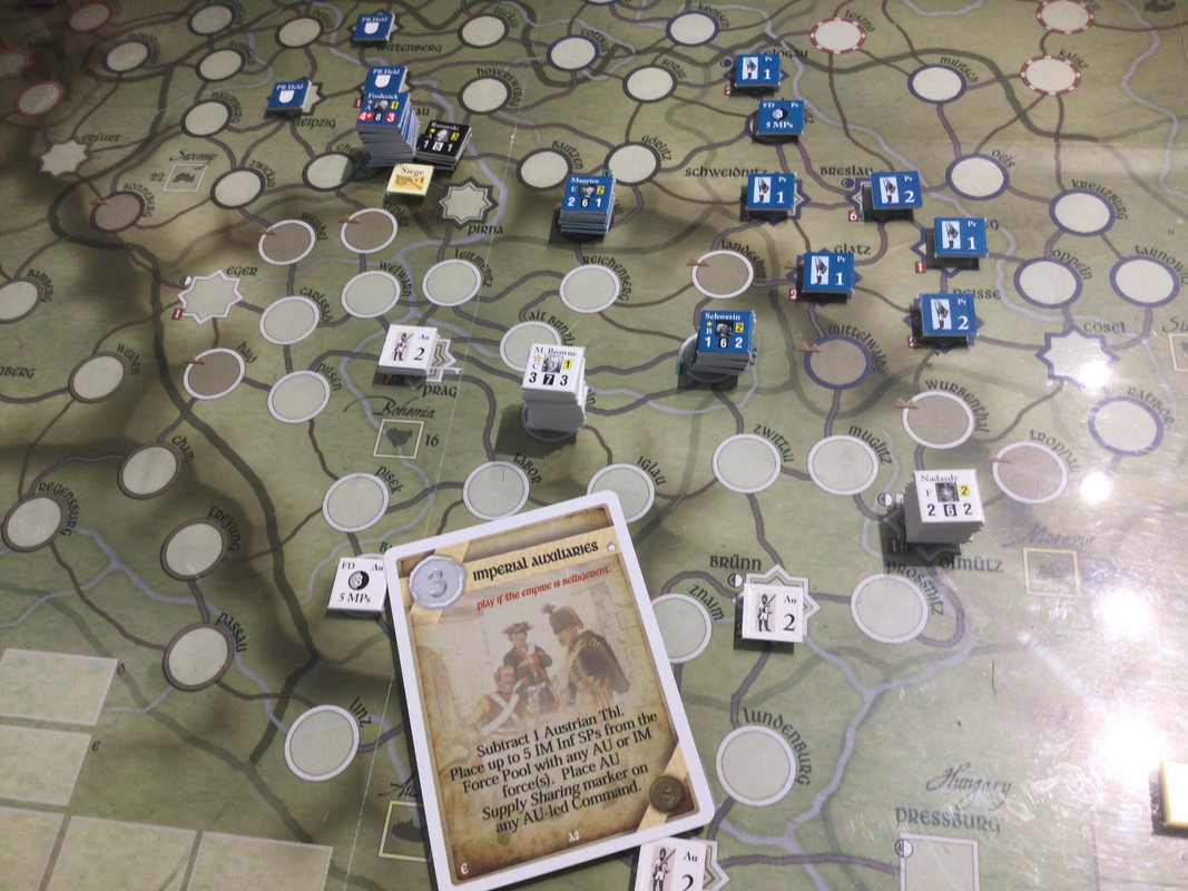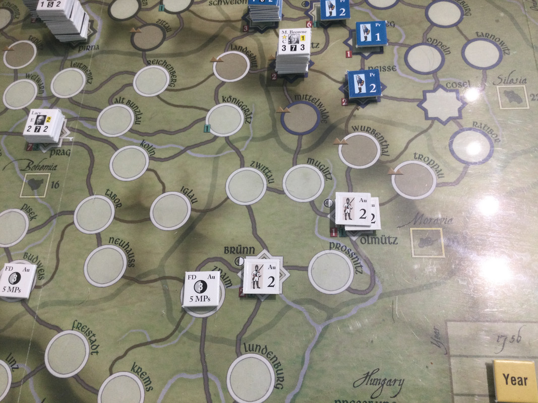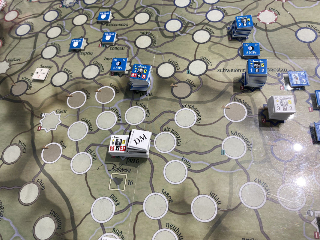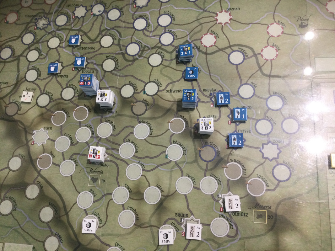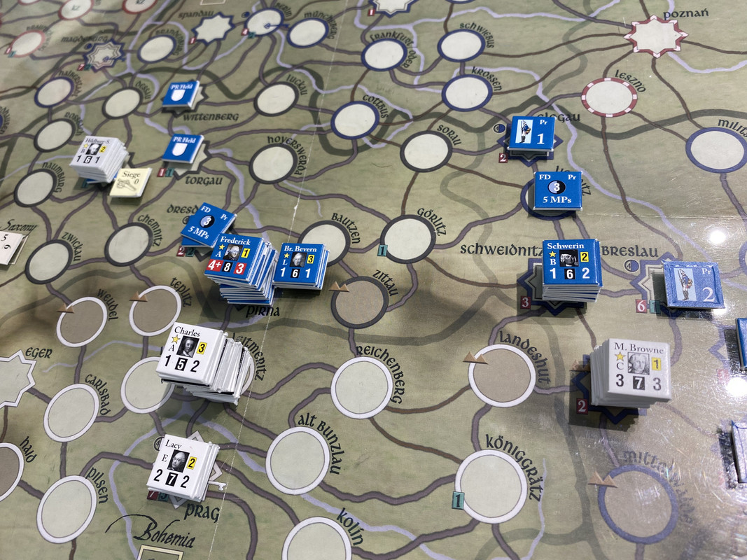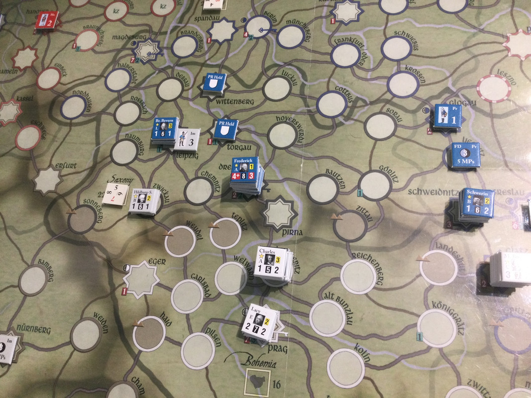 Under våren förstärker båda sidor. Ärkehertig Karl tar befäl över huvudarmén återigen, och Browne går till Schlesien och tar befäl där. Daun får befäl över styrkan som håller på att byggas upp i Prag. Det innebär att Karls armé är svagare än den kunde vara, men jag vill ha en reserv i Prag om F2 pryglar upp Karl riktigt duktigt, vilket det finns risk för även om han fått den truppen också. Klart för sommarsäsongen 1757.