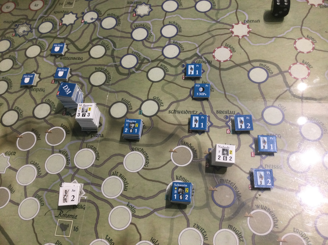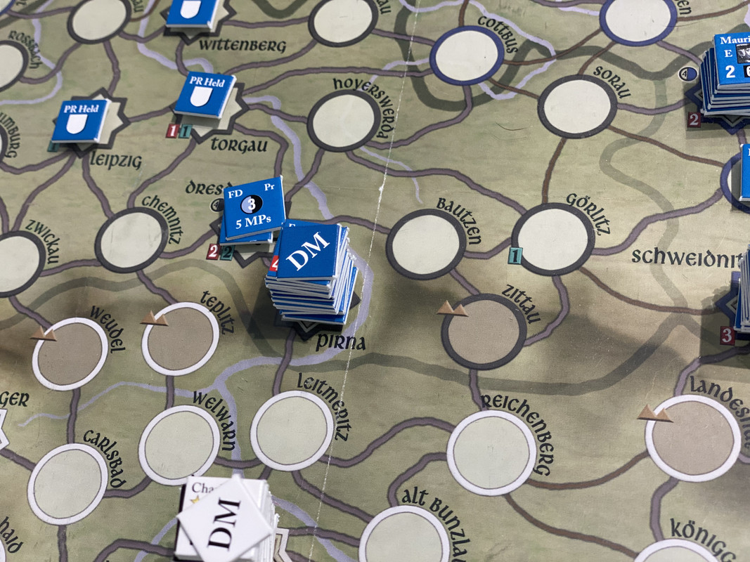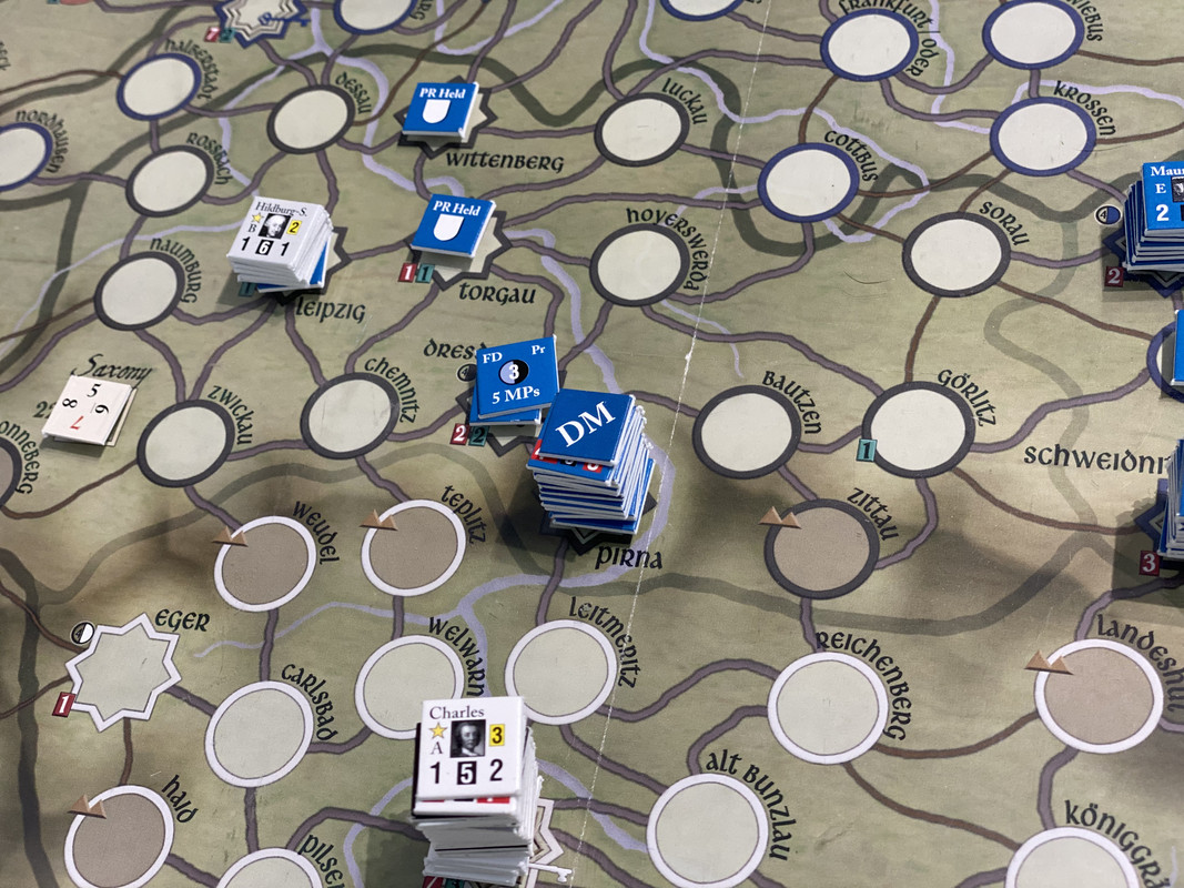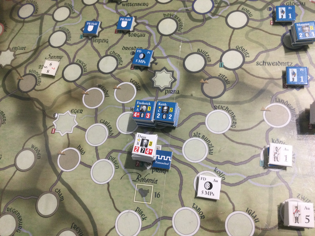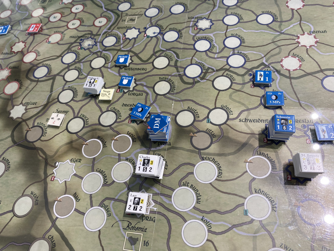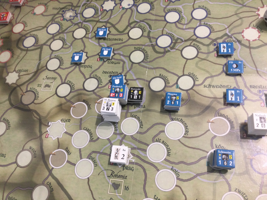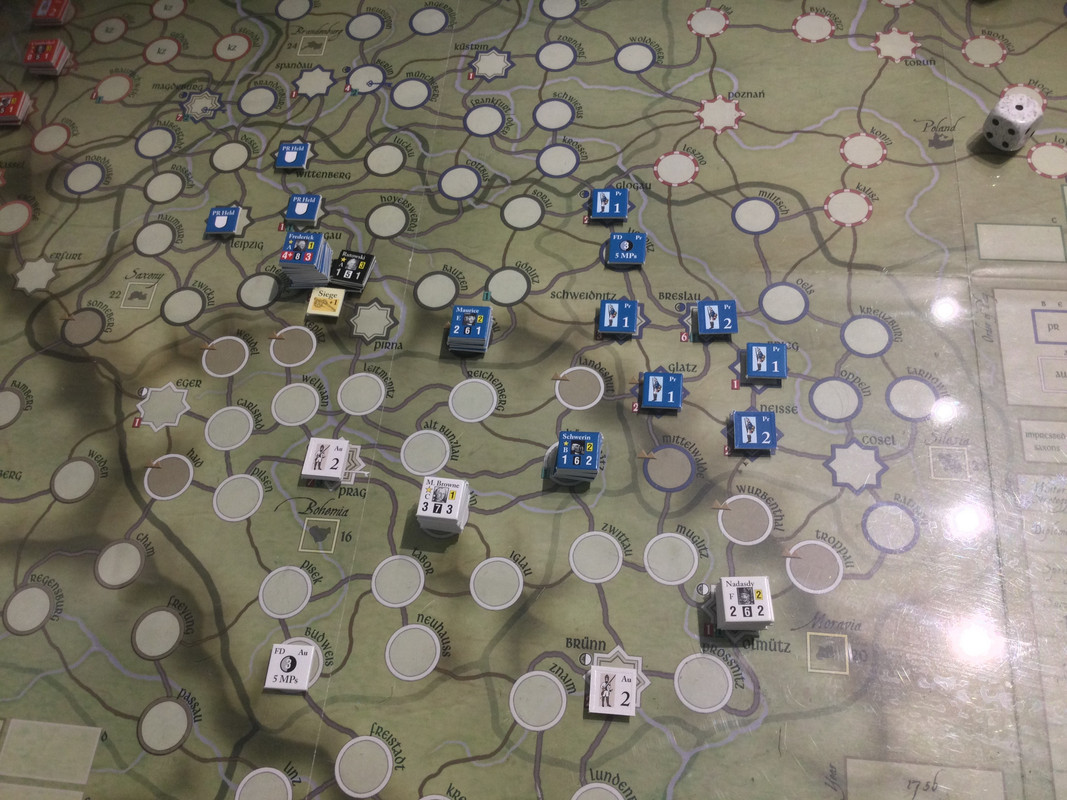 Denna gång delar F2 inte upp sin styrka i tre som historiskt, finns inga skäl att göra det märkte vi sist, utan marscherar samlat genom de sachsiska fästningarna till Dresden där Rutowski inte hinner undan utan tar skydd i fästningen. F2 påbörjar en belägring som snabbt framskrider.  Schwerin marscherar söderut, tvingar den österrikiska styrkan i Königsgrätz till kapitulation, tar depån där, fortsätter till Zwittau, tar depån där, och återgår till Königsgrätz. Mauritz grupperar centralt för att kunna ingripa både i Sachsen och i östra Österrike.