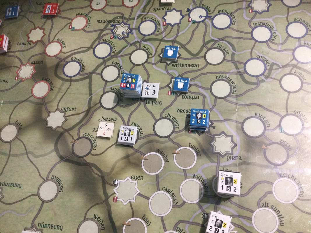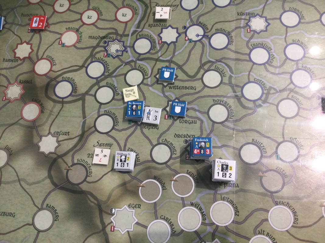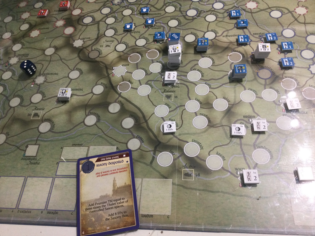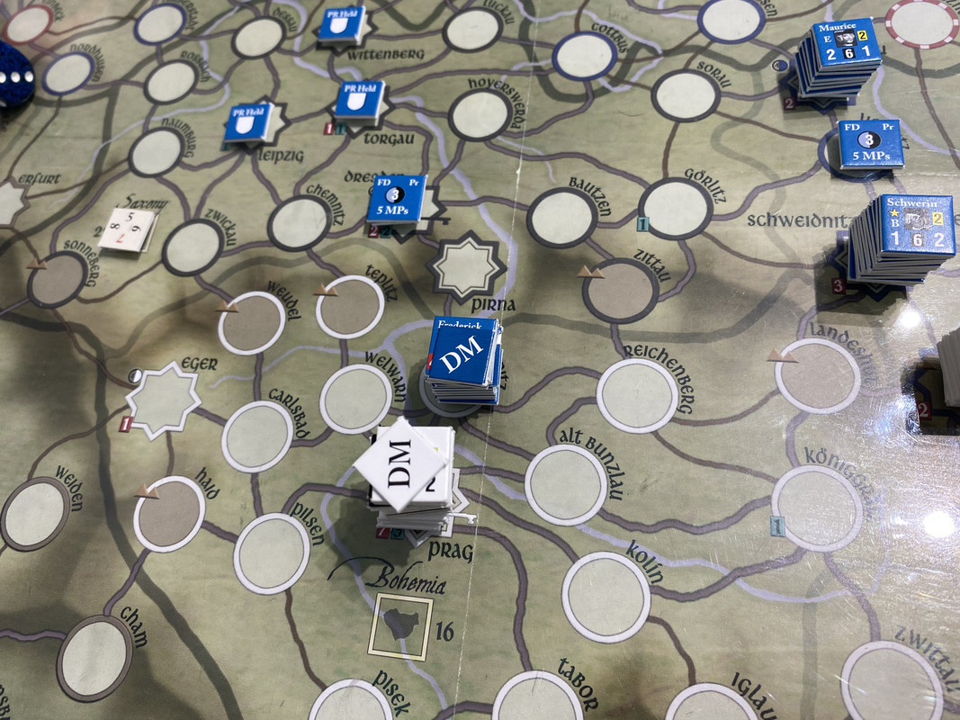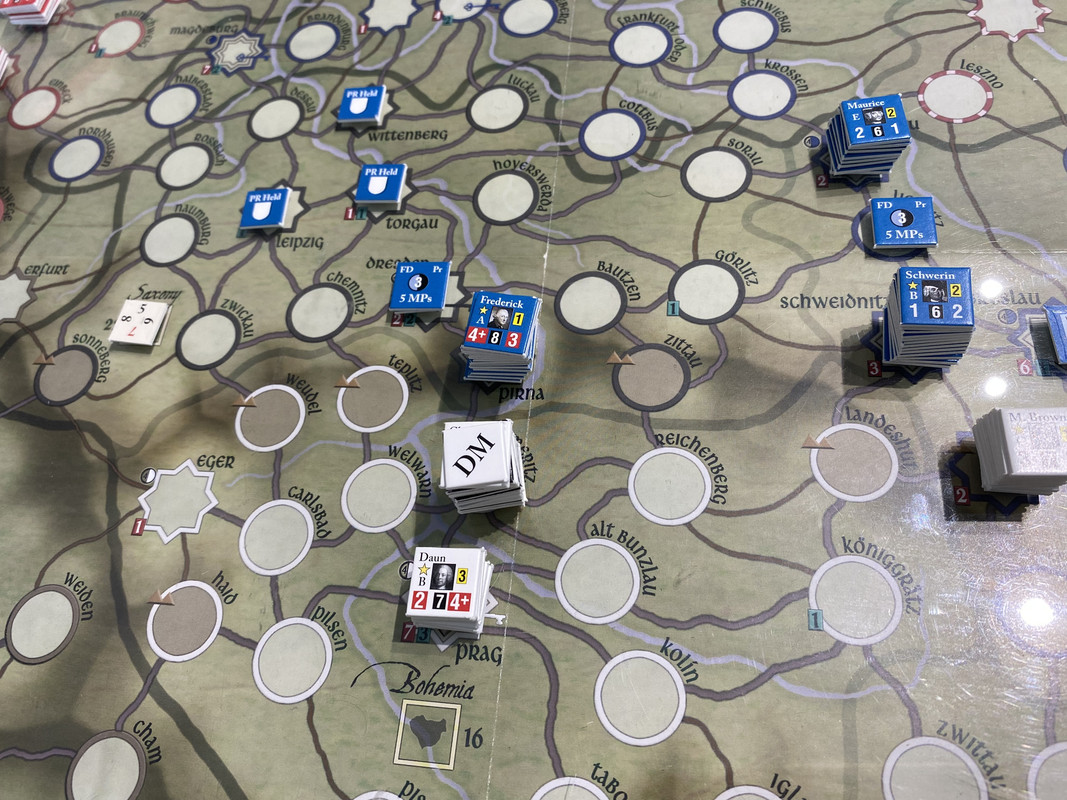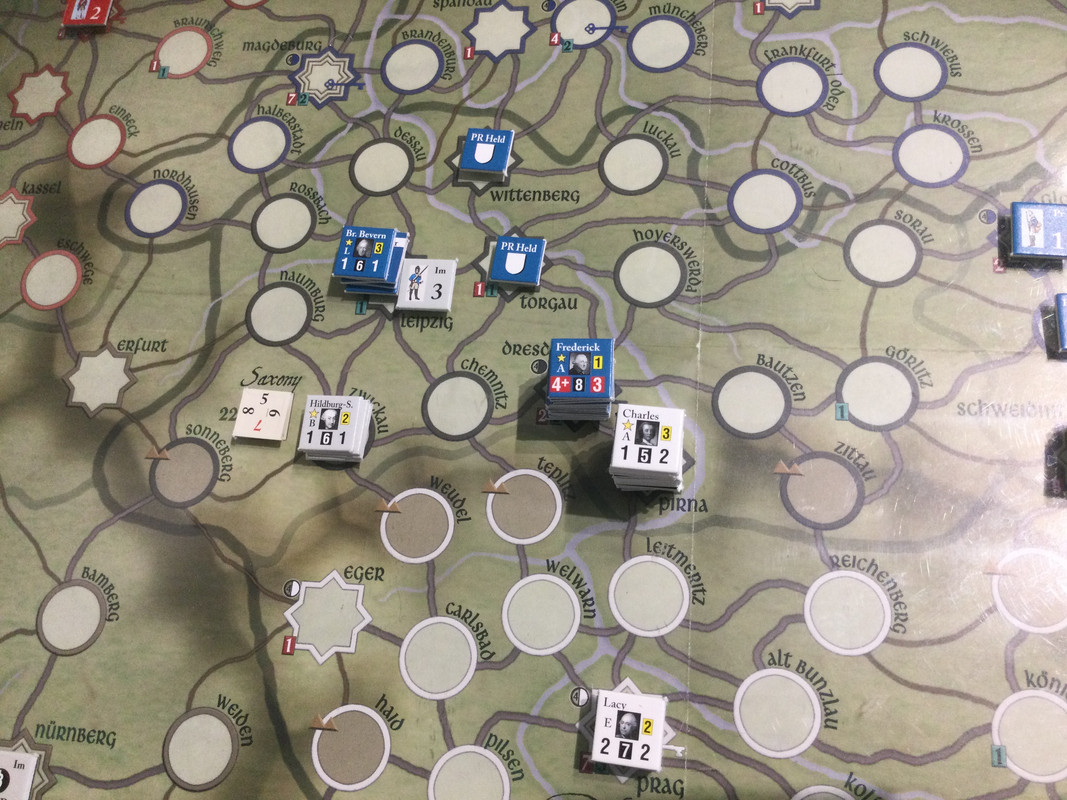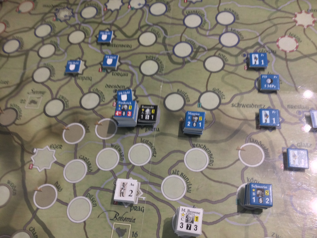 Denna gång delar F2 inte upp sin styrka i tre som historiskt, finns inga skäl att göra det märkte vi sist, utan marscherar samlat genom de sachsiska fästningarna till Dresden där Rutowski inte hinner undan utan tar skydd i fästningen. F2 påbörjar en belägring som snabbt framskrider.  Schwerin marscherar söderut, tvingar den österrikiska styrkan i Königsgrätz till kapitulation, tar depån där, fortsätter till Zwittau, tar depån där, och återgår till Königsgrätz. Mauritz grupperar centralt för att kunna ingripa både i Sachsen och i östra Österrike.