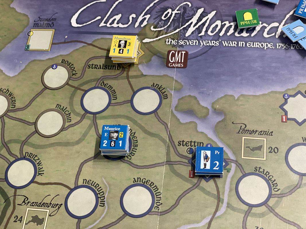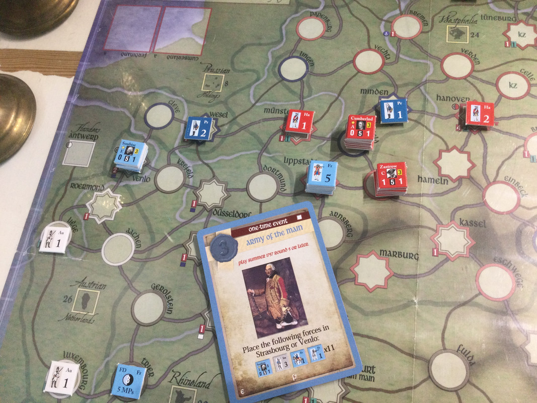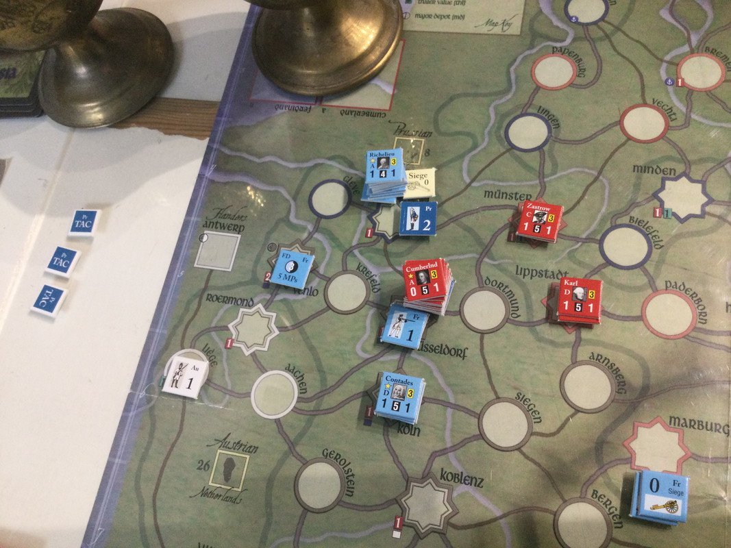 Fransmännen är ledarlösa och Cumberland väldigt flegmatisk. Inget händer i väster. Fransoserna ägnar sig åt diplomati och övertalar Sverige att det kan vara ett bra tillfälle att ta tillbaka Pommern. Hamilton och en mindre svensk armé skeppas till Stralsund. De anglo-allierade utvecklar sin förmåga till kleiner krieg.