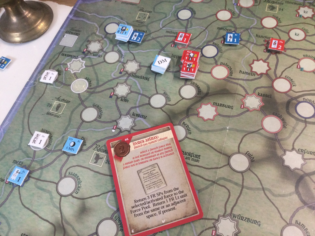 Men aj då! Det franska avlöningsystemet kollapsar när någon försnillat truppens sold. Deserteringar följer, och Soubise är nu för svag för att belägra Wesel.