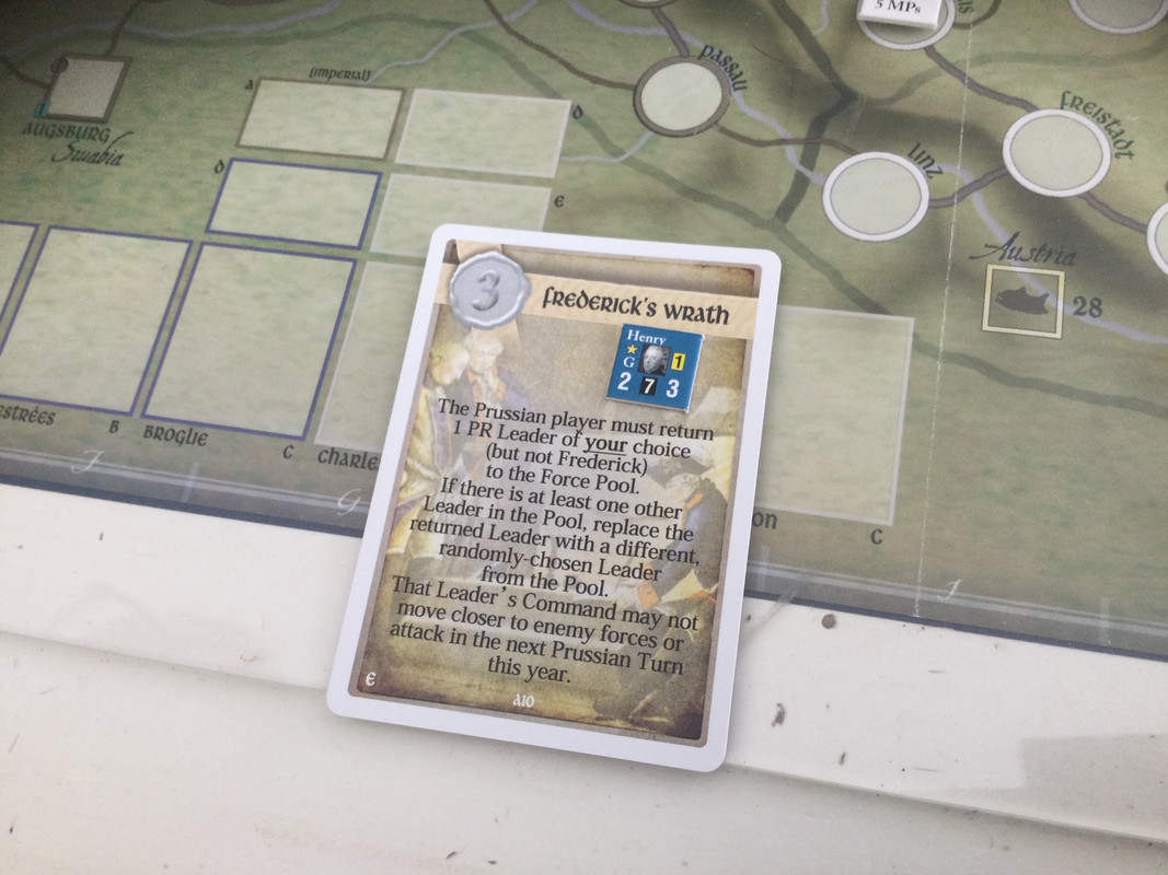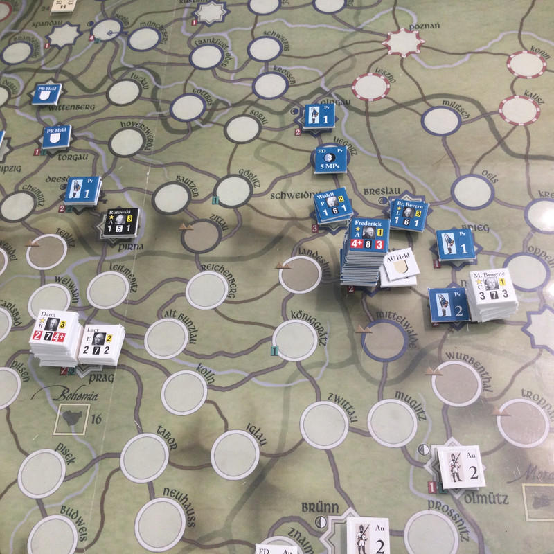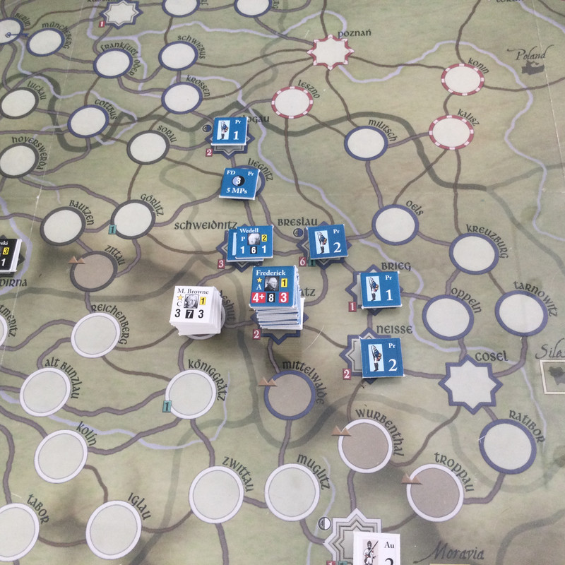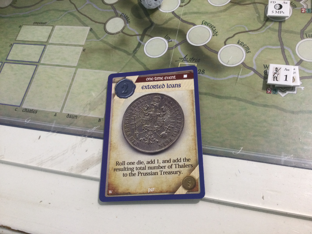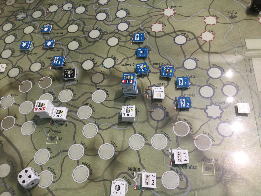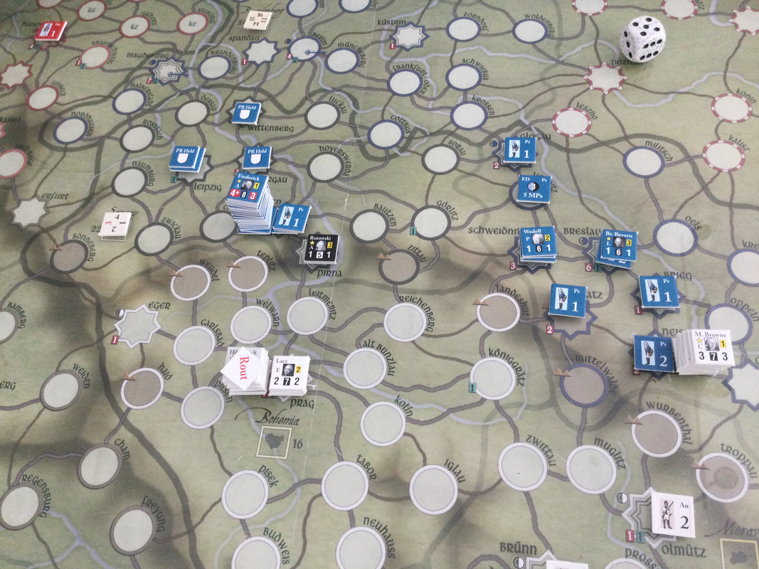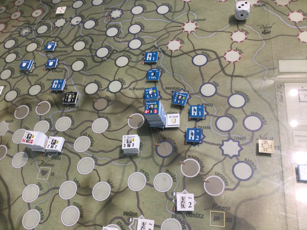 Preussaren börjar med att spela ett kort som ger honom mer artilleri, Brummers, som om jag minns rätt skildrar att man länsade arsenaler på gamla omoderna pjäser för att kunna möta det överlägsna österrikiska artilleriet bättre. Jag spelar ett kort som gör att Heinrich tar sin Mats ur skolan och får hem. Vilket han tydligen gjorde då och då när han tröttnade på storebrors oförskämdheter. Heinrich blev, i motsats till F2, aldrig slagen...