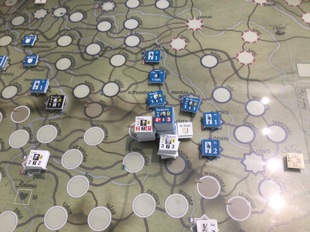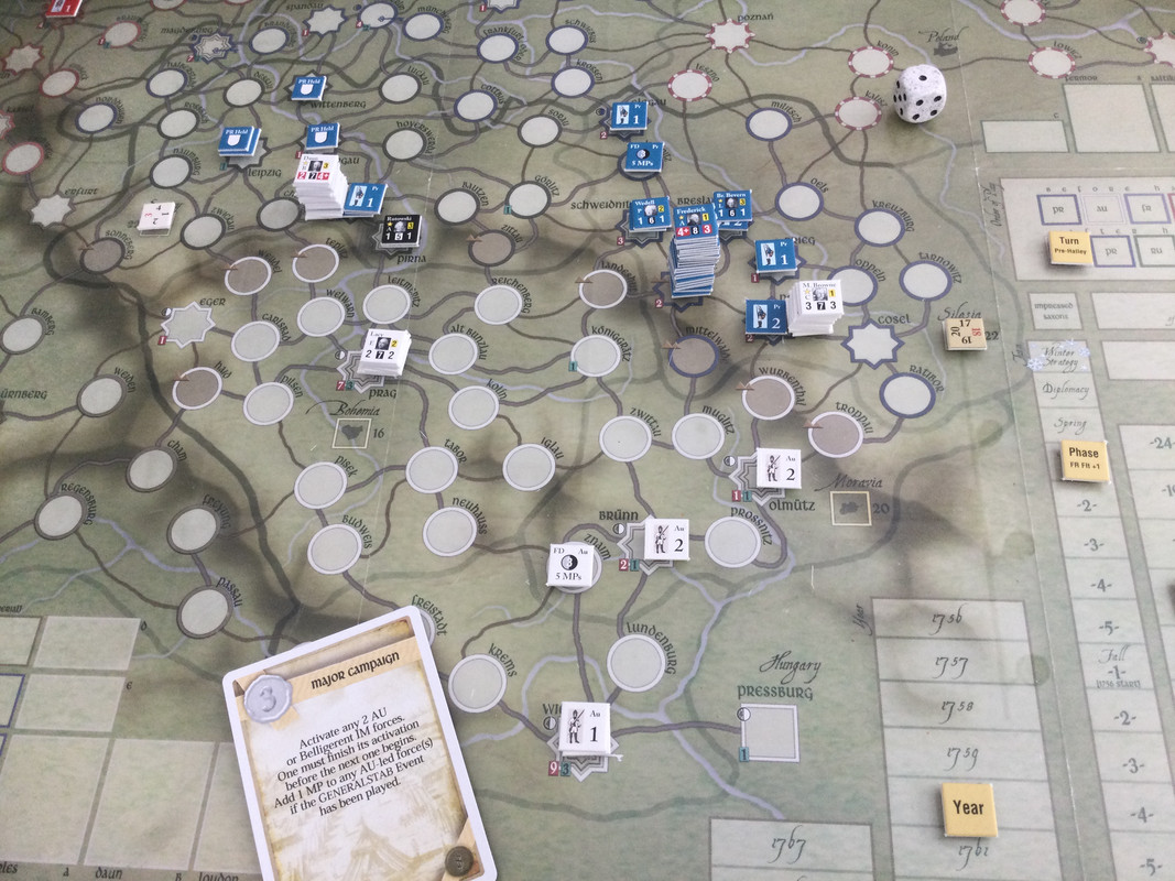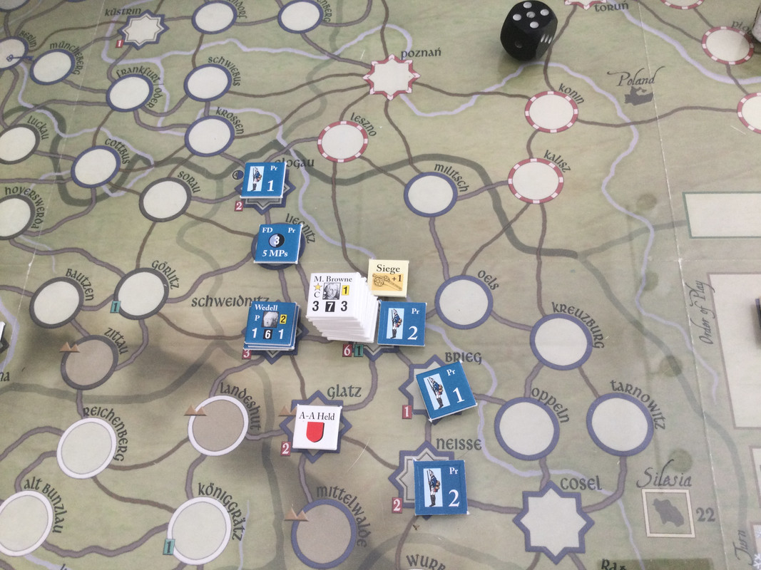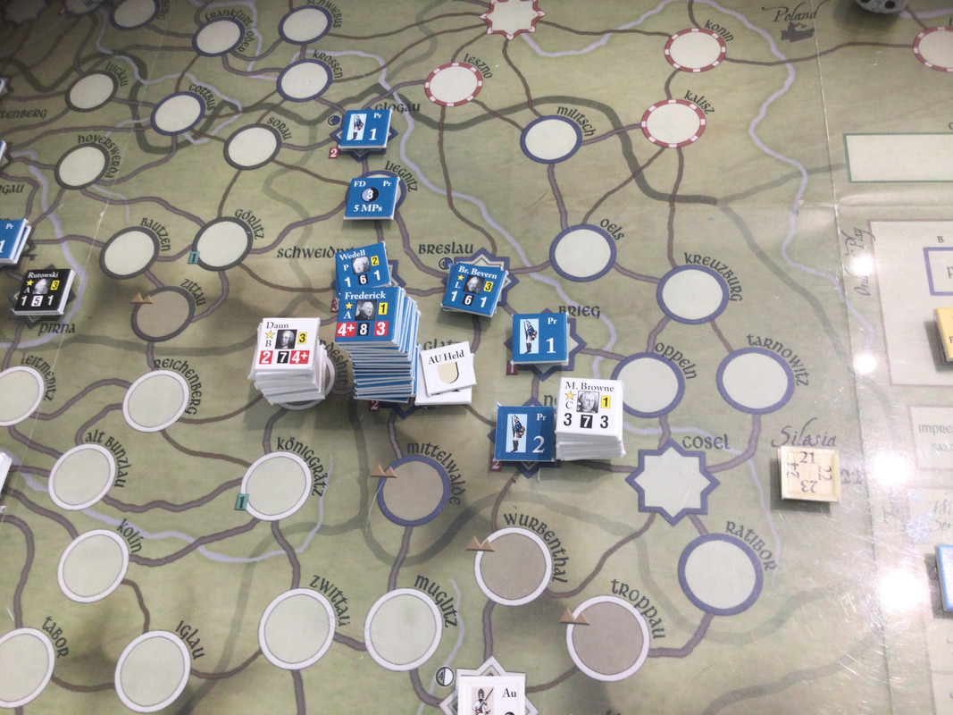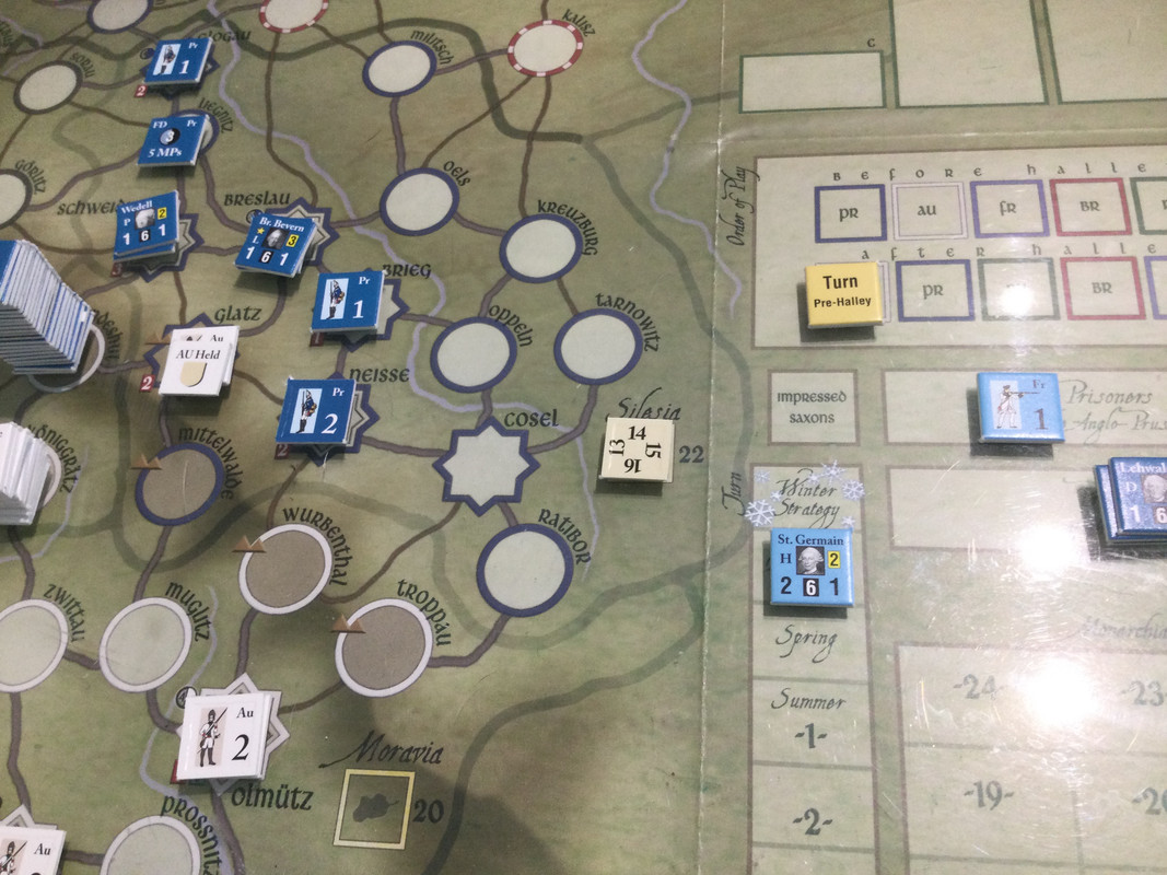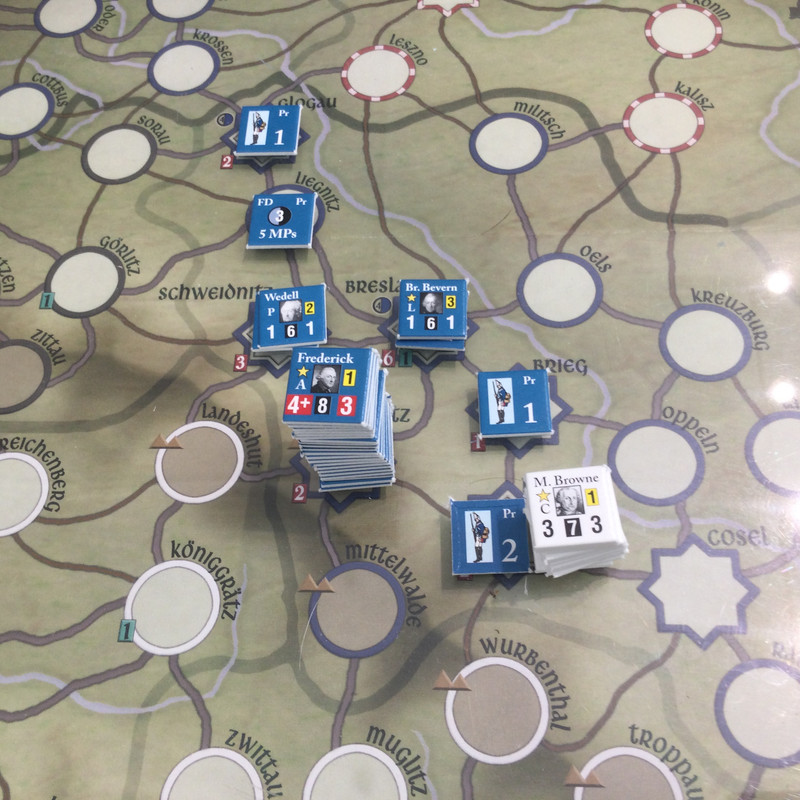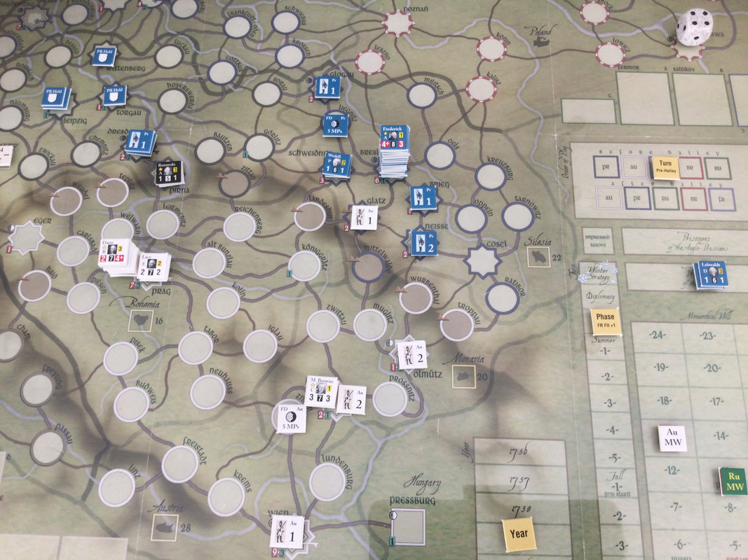 Preussaren börjar med att spela ett kort som ger honom mer artilleri, Brummers, som om jag minns rätt skildrar att man länsade arsenaler på gamla omoderna pjäser för att kunna möta det överlägsna österrikiska artilleriet bättre. Jag spelar ett kort som gör att Heinrich tar sin Mats ur skolan och får hem. Vilket han tydligen gjorde då och då när han tröttnade på storebrors oförskämdheter. Heinrich blev, i motsats till F2, aldrig slagen...