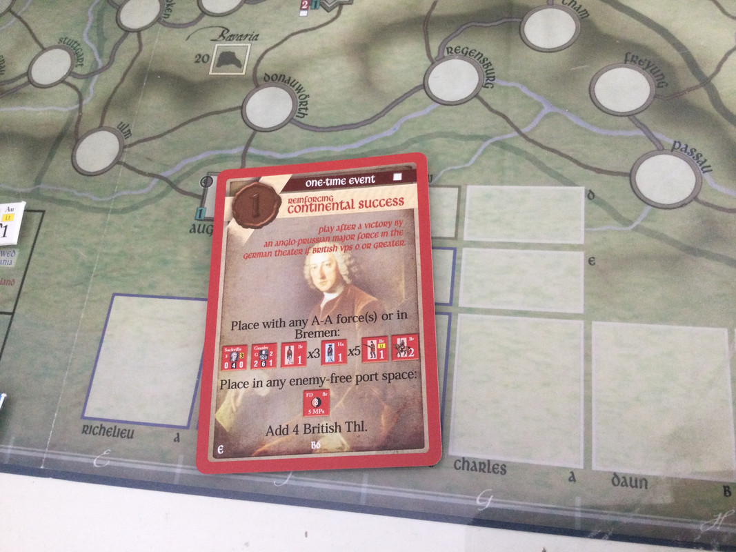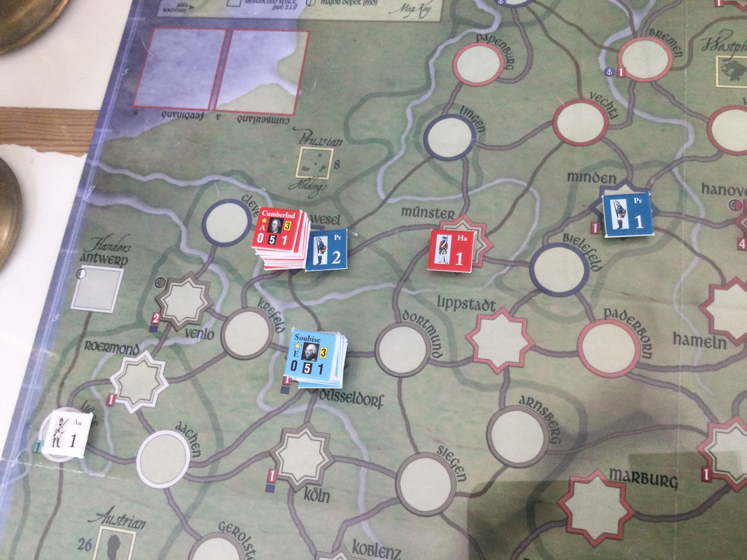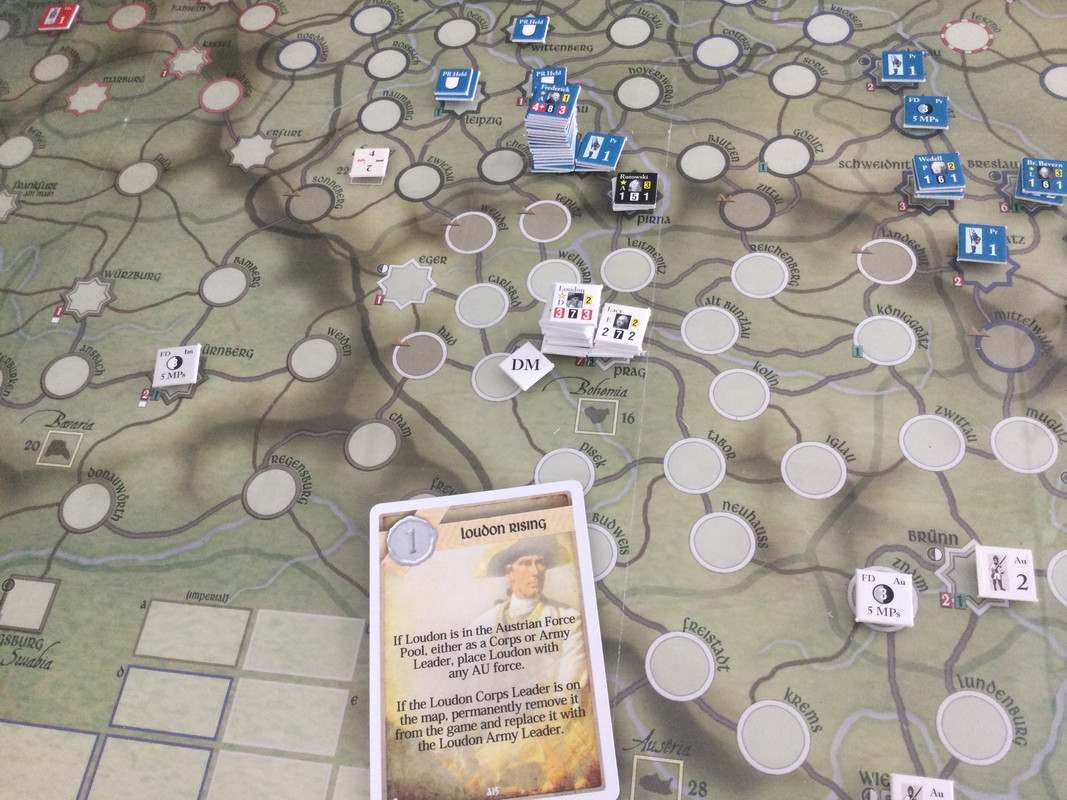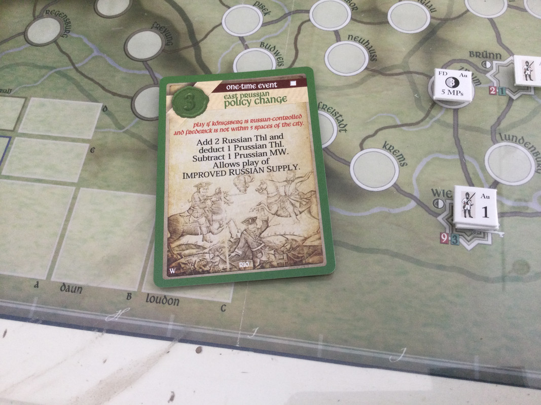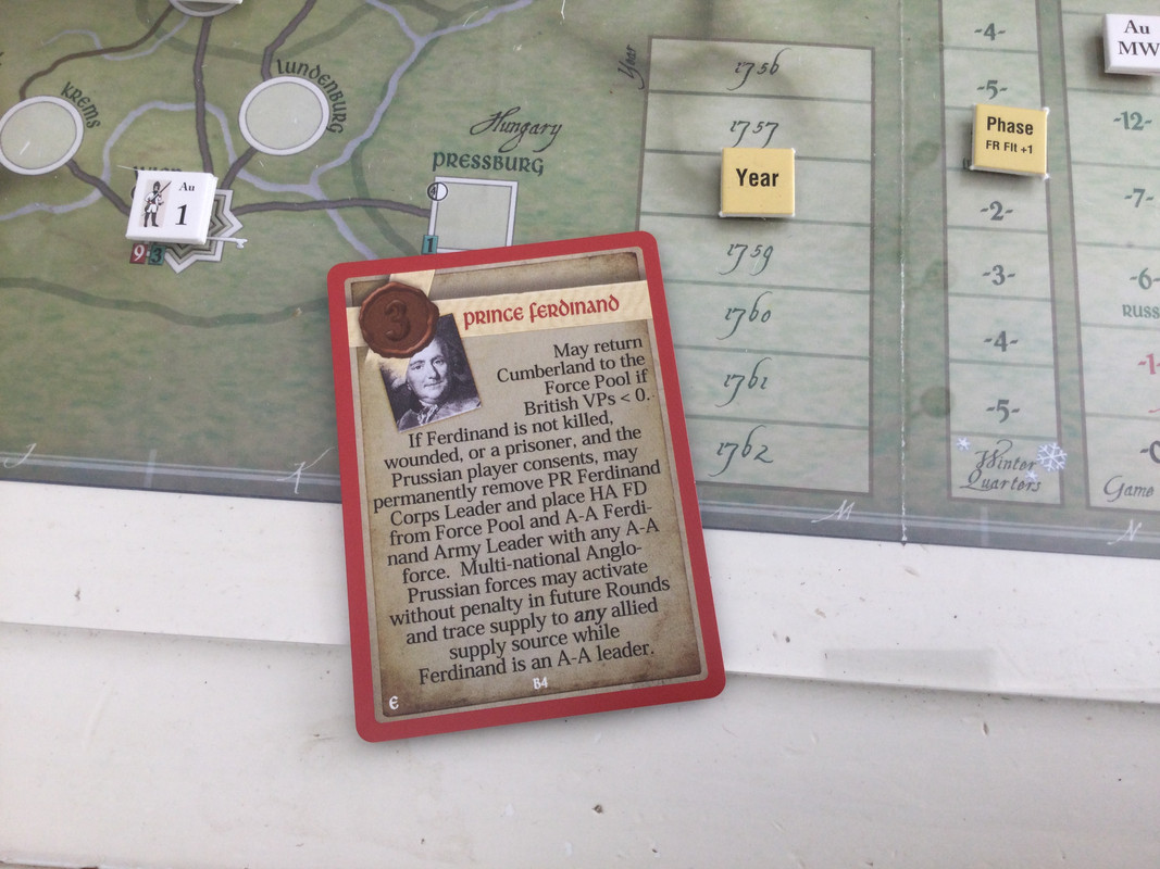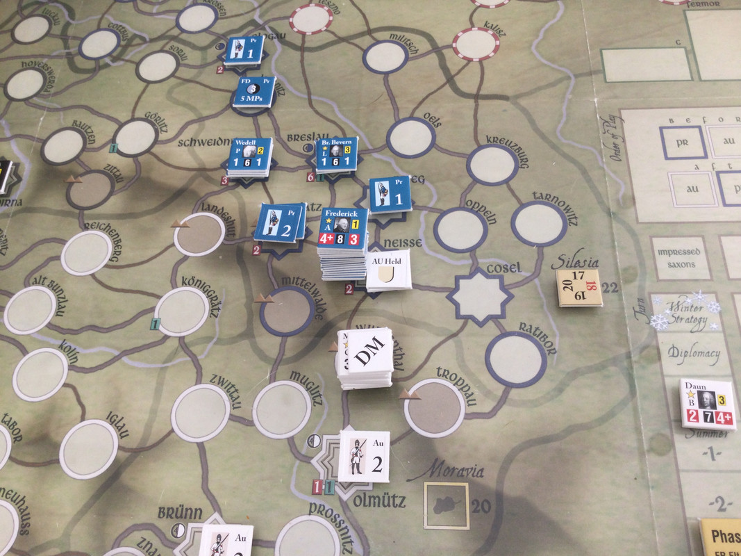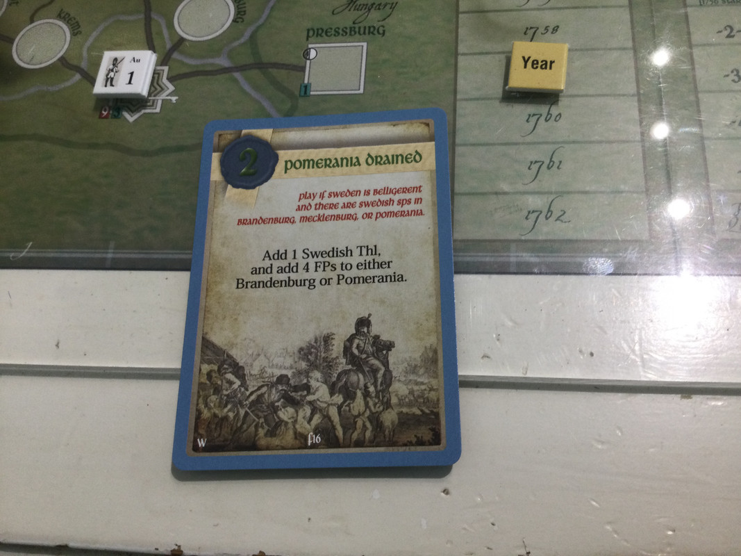 Preussaren börjar med att spela ett kort som ger honom mer artilleri, Brummers, som om jag minns rätt skildrar att man länsade arsenaler på gamla omoderna pjäser för att kunna möta det överlägsna österrikiska artilleriet bättre. Jag spelar ett kort som gör att Heinrich tar sin Mats ur skolan och får hem. Vilket han tydligen gjorde då och då när han tröttnade på storebrors oförskämdheter. Heinrich blev, i motsats till F2, aldrig slagen...