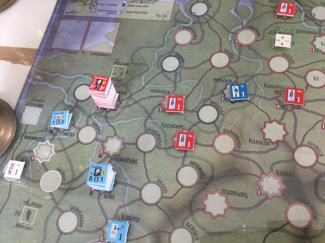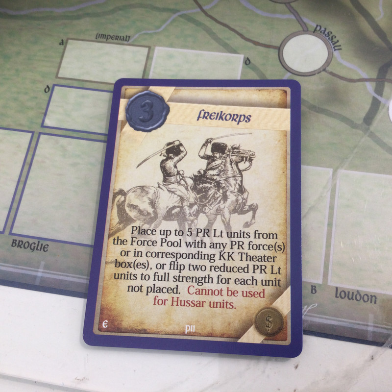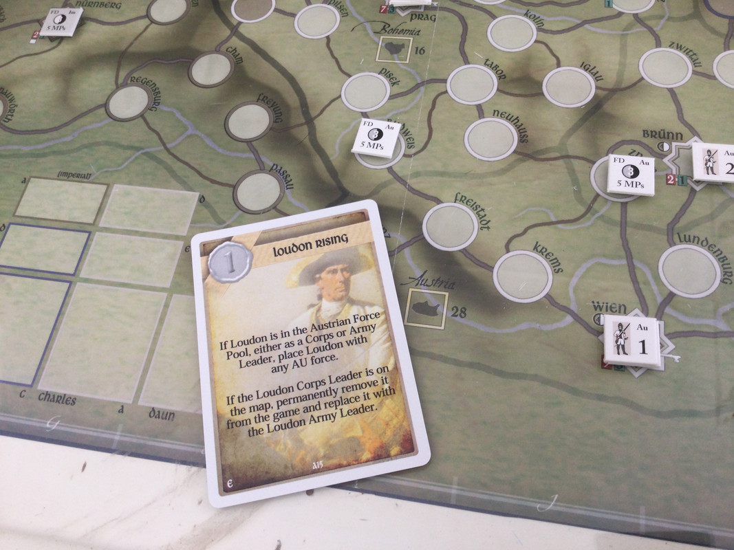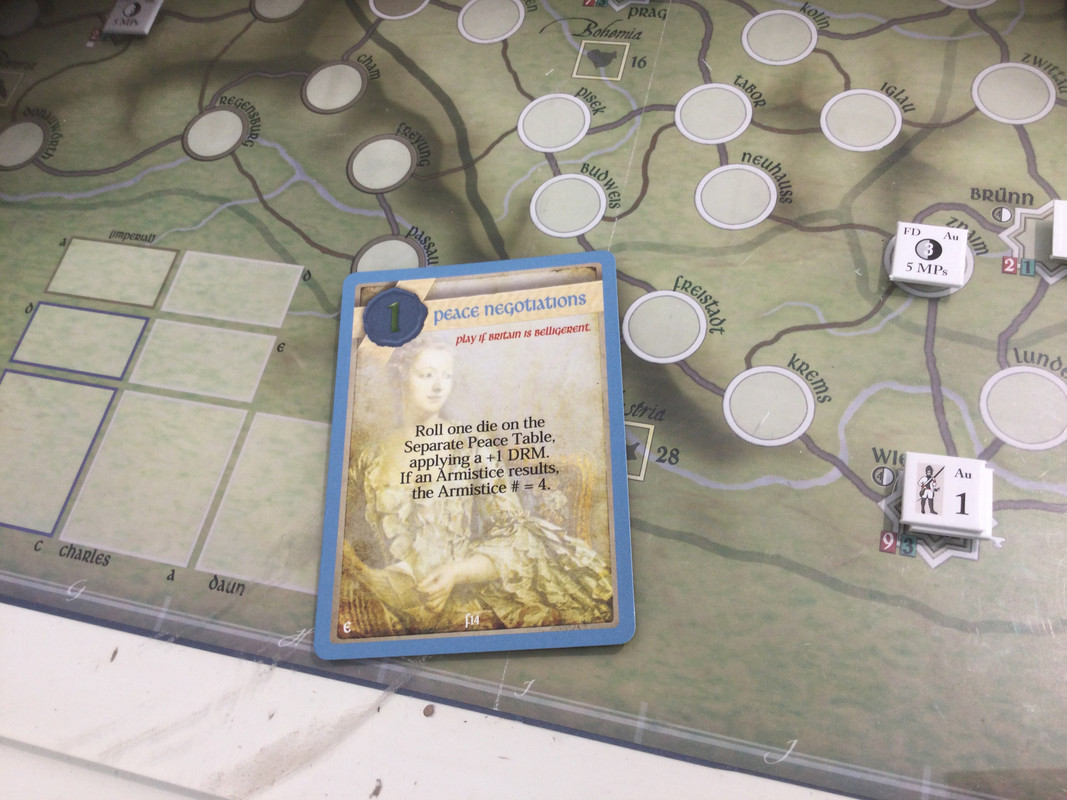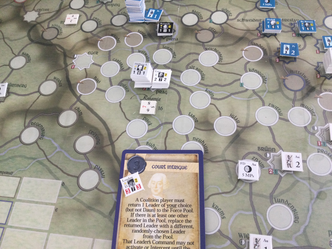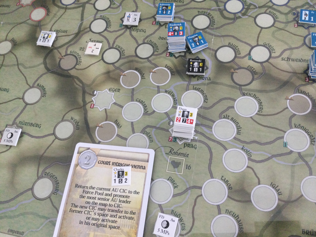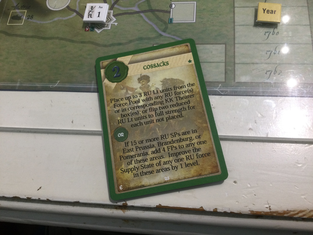 Preussaren börjar med att spela ett kort som ger honom mer artilleri, Brummers, som om jag minns rätt skildrar att man länsade arsenaler på gamla omoderna pjäser för att kunna möta det överlägsna österrikiska artilleriet bättre. Jag spelar ett kort som gör att Heinrich tar sin Mats ur skolan och får hem. Vilket han tydligen gjorde då och då när han tröttnade på storebrors oförskämdheter. Heinrich blev, i motsats till F2, aldrig slagen...