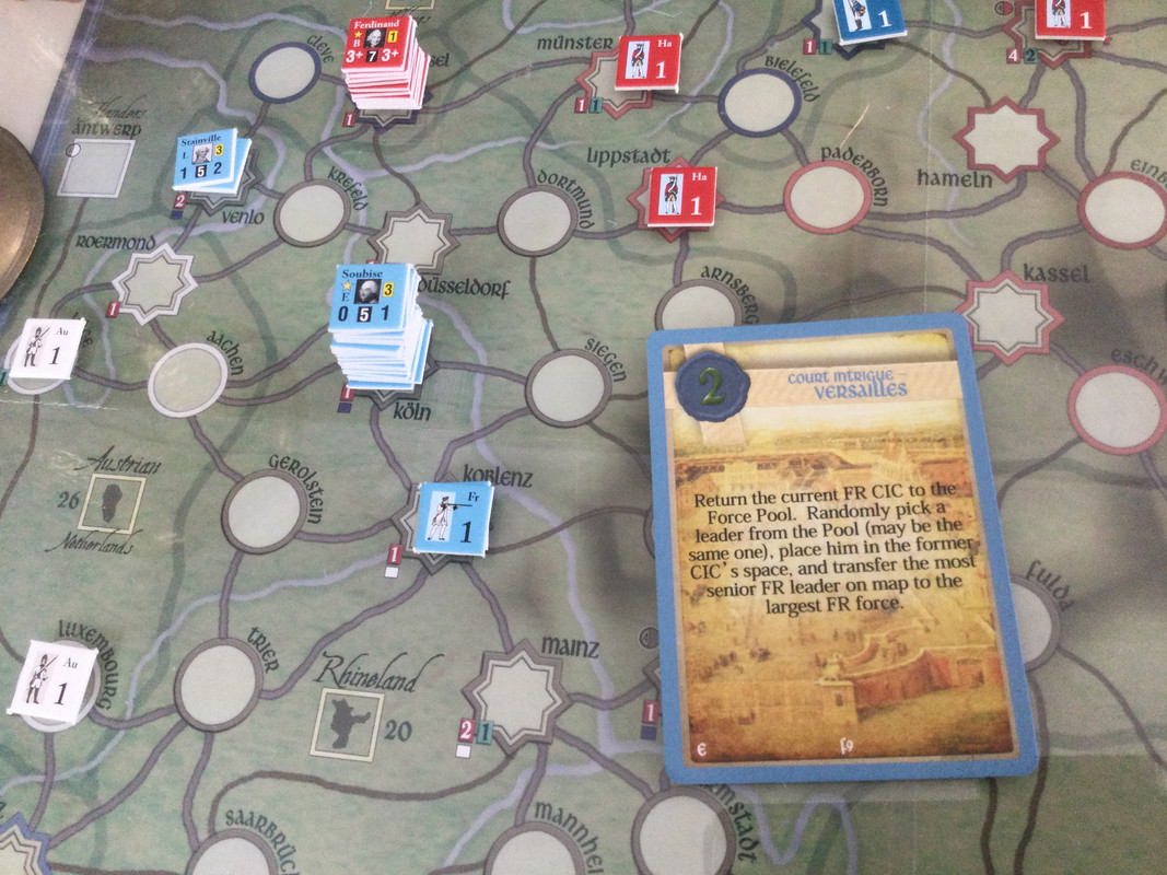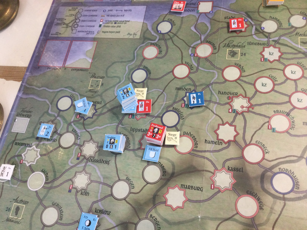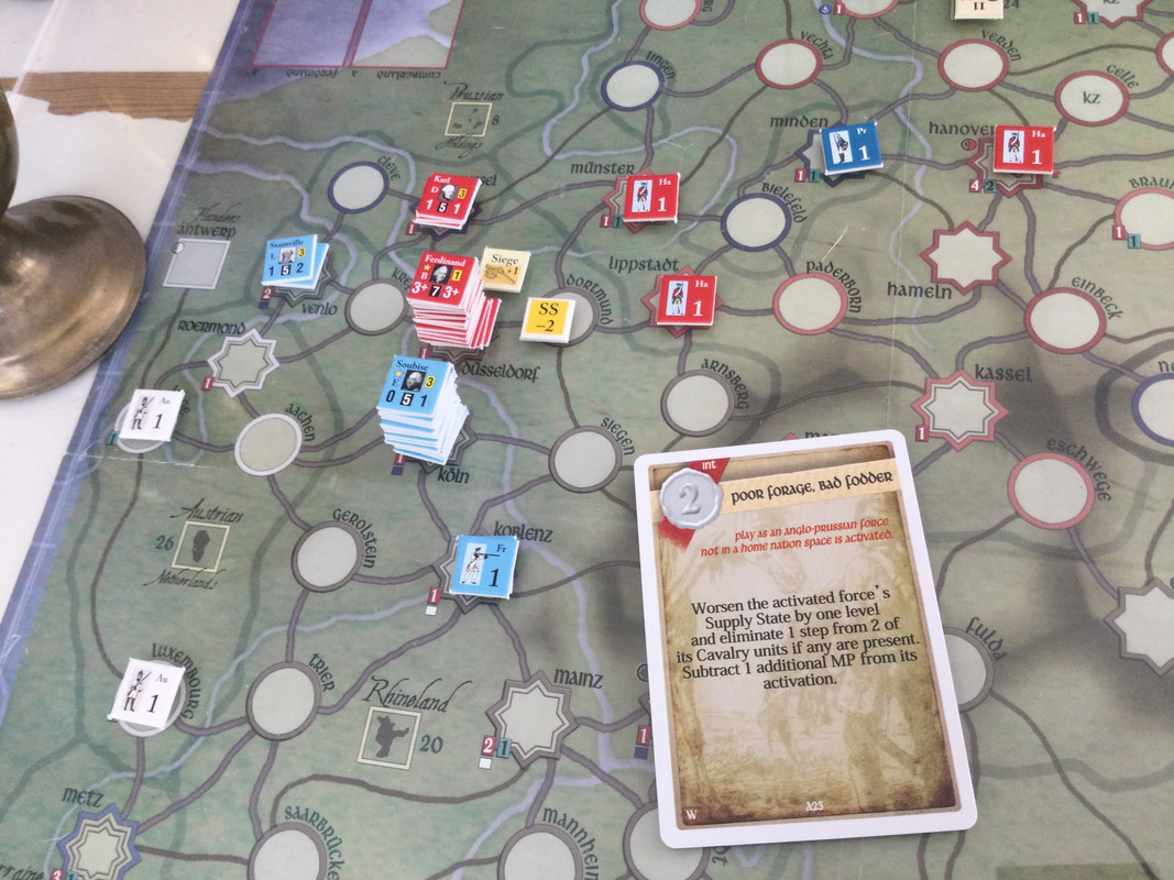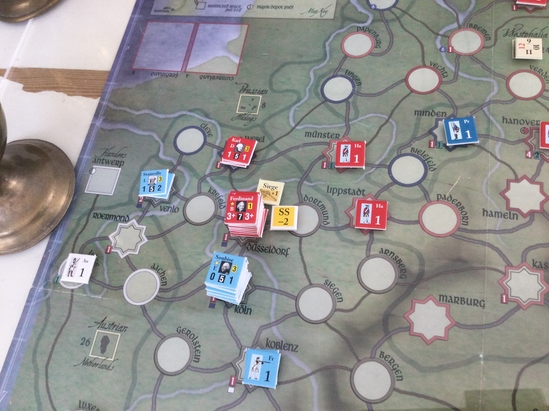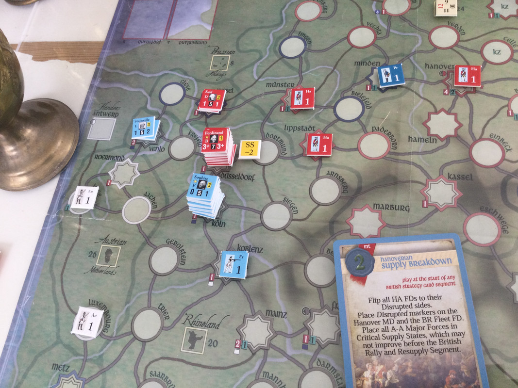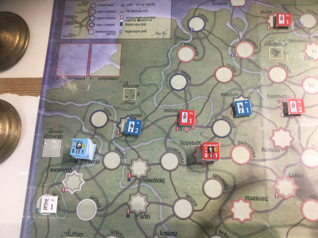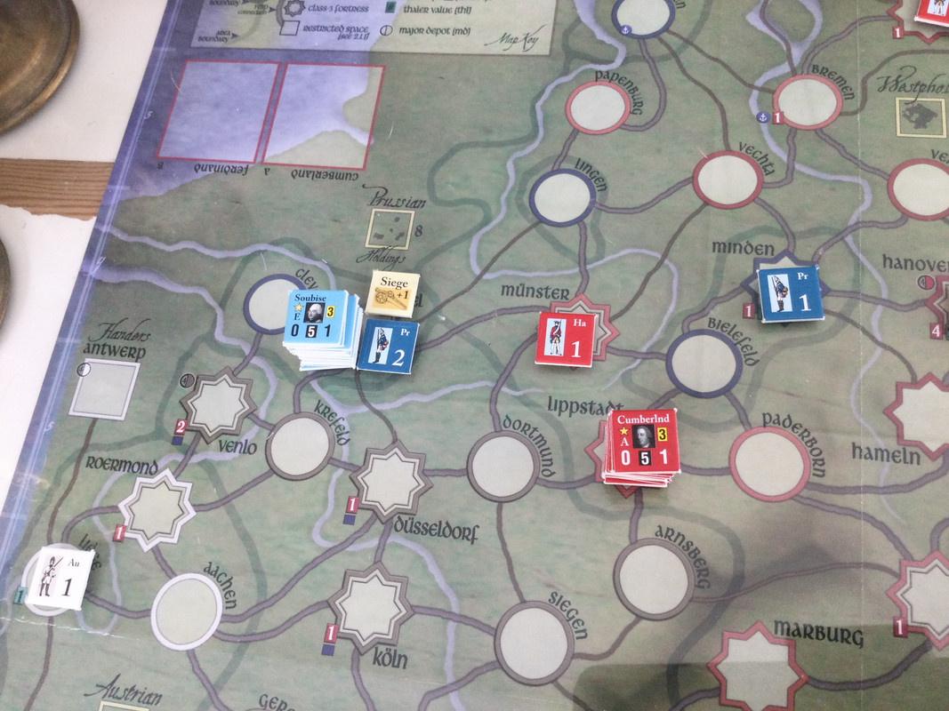 Preussaren börjar med att spela ett kort som ger honom mer artilleri, Brummers, som om jag minns rätt skildrar att man länsade arsenaler på gamla omoderna pjäser för att kunna möta det överlägsna österrikiska artilleriet bättre. Jag spelar ett kort som gör att Heinrich tar sin Mats ur skolan och får hem. Vilket han tydligen gjorde då och då när han tröttnade på storebrors oförskämdheter. Heinrich blev, i motsats till F2, aldrig slagen...