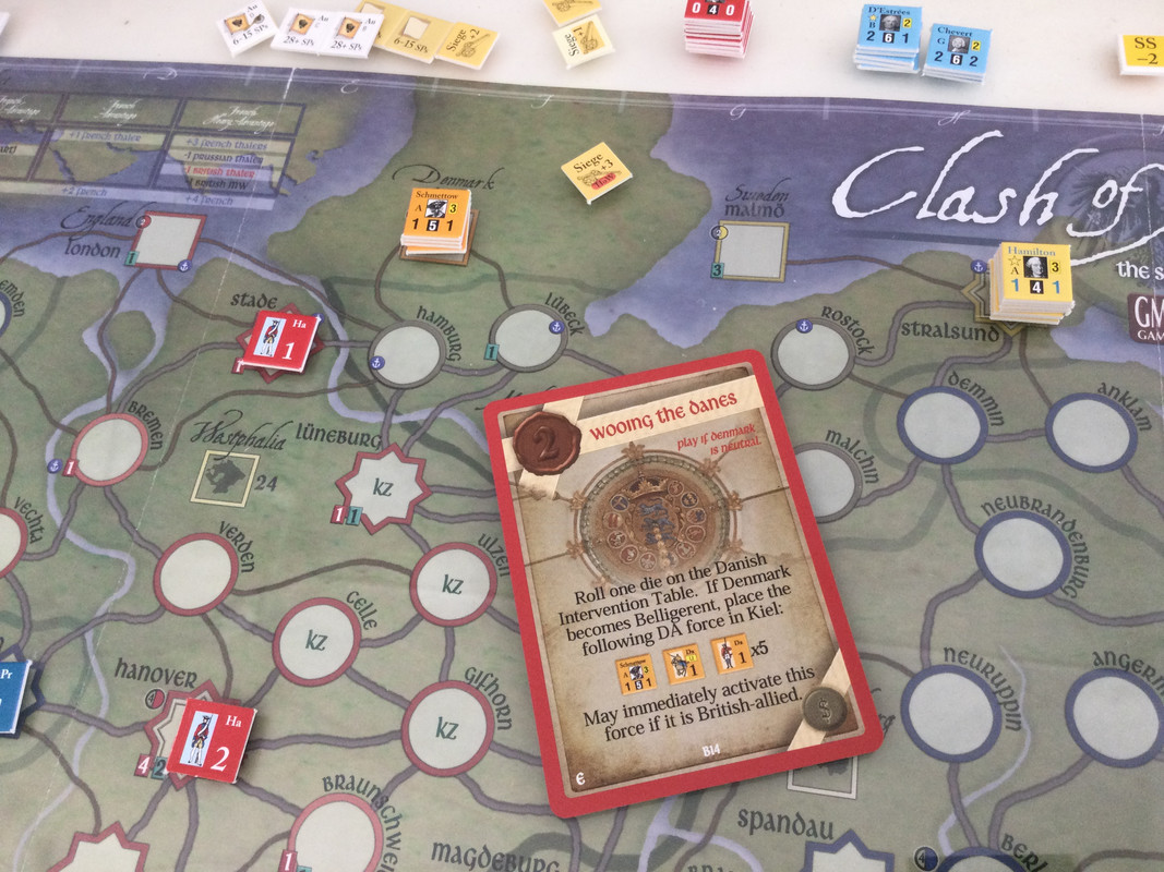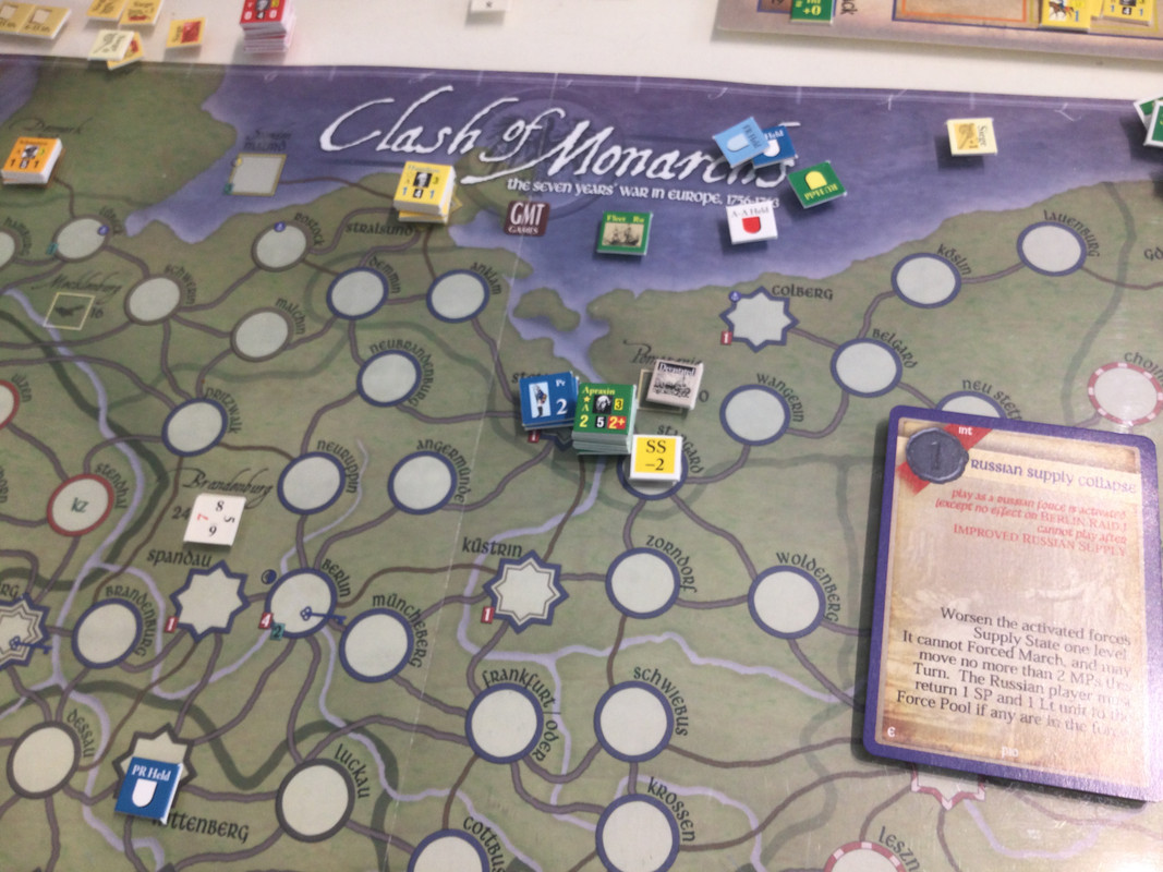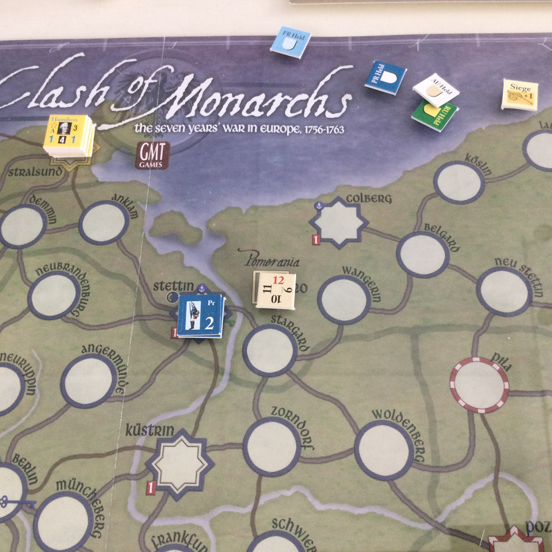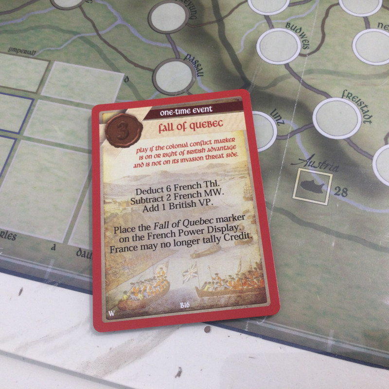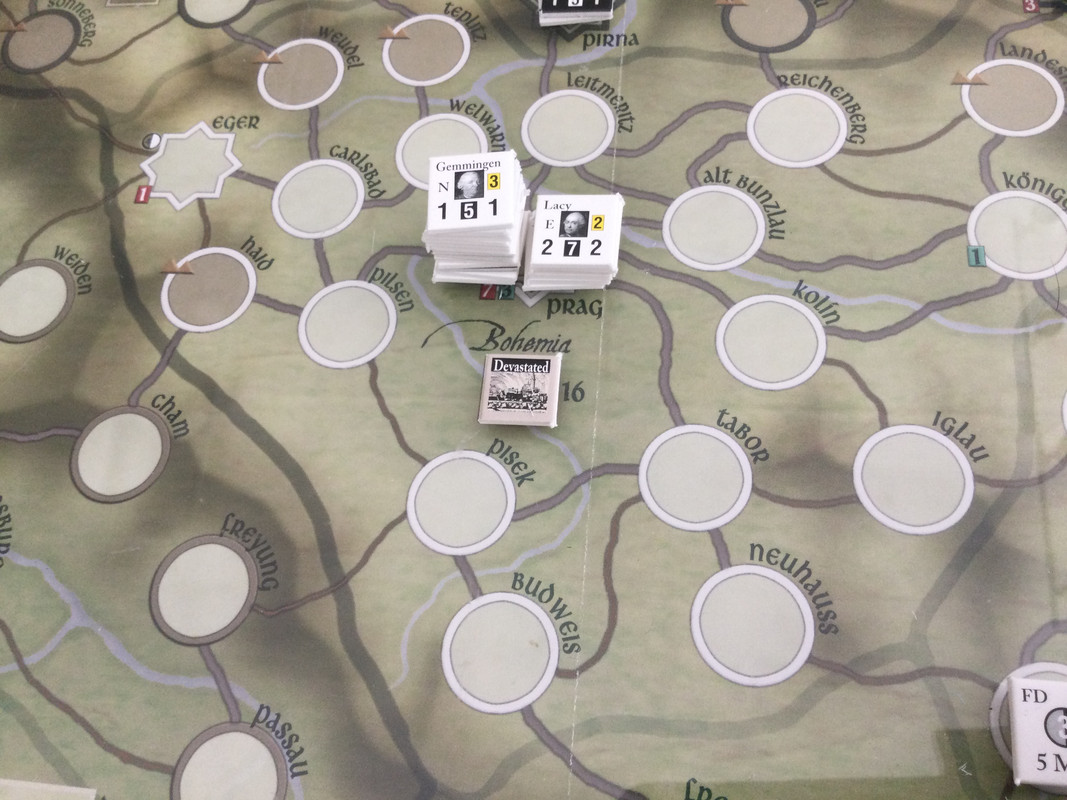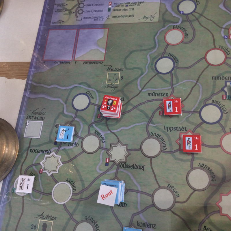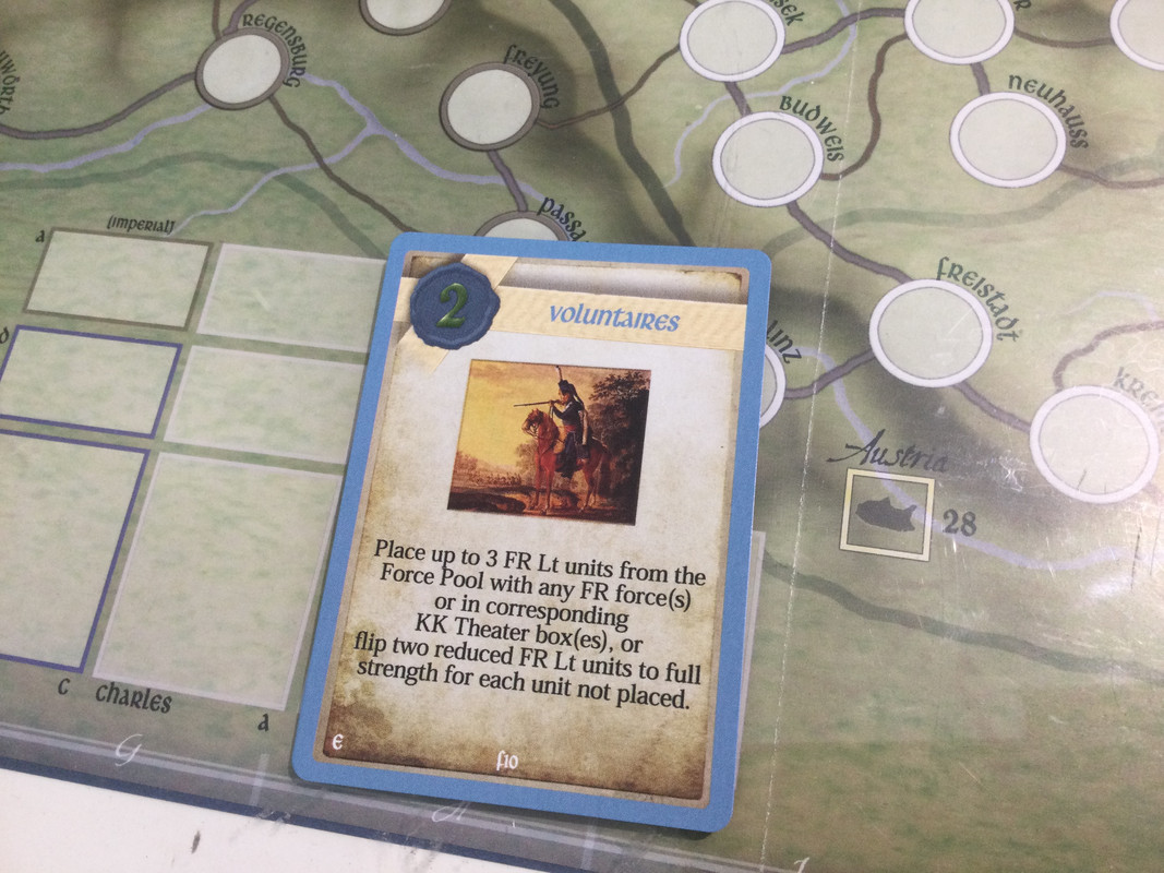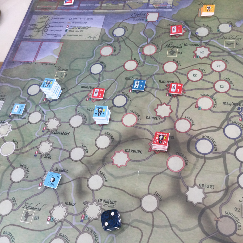 Preussaren börjar med att spela ett kort som ger honom mer artilleri, Brummers, som om jag minns rätt skildrar att man länsade arsenaler på gamla omoderna pjäser för att kunna möta det överlägsna österrikiska artilleriet bättre. Jag spelar ett kort som gör att Heinrich tar sin Mats ur skolan och får hem. Vilket han tydligen gjorde då och då när han tröttnade på storebrors oförskämdheter. Heinrich blev, i motsats till F2, aldrig slagen...