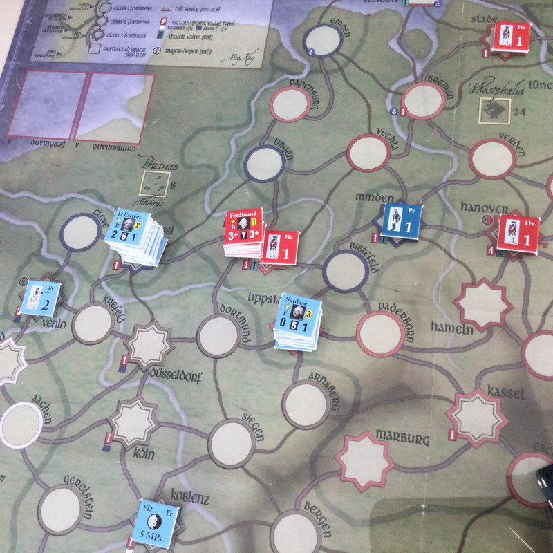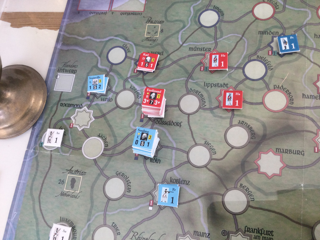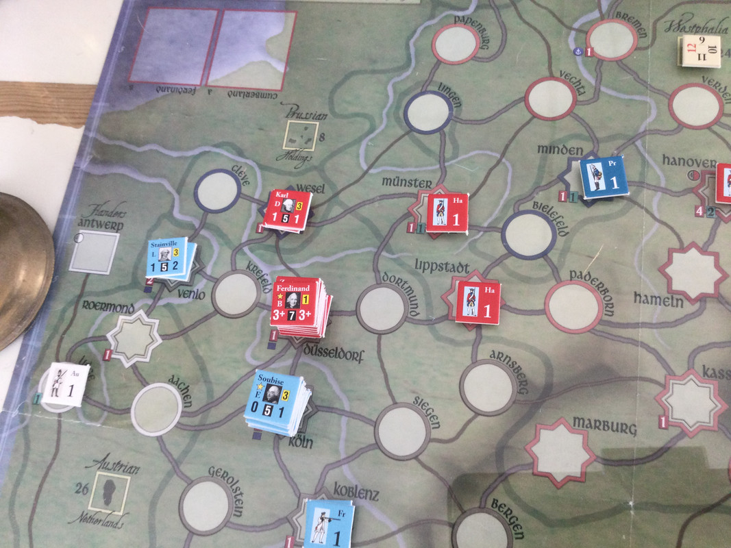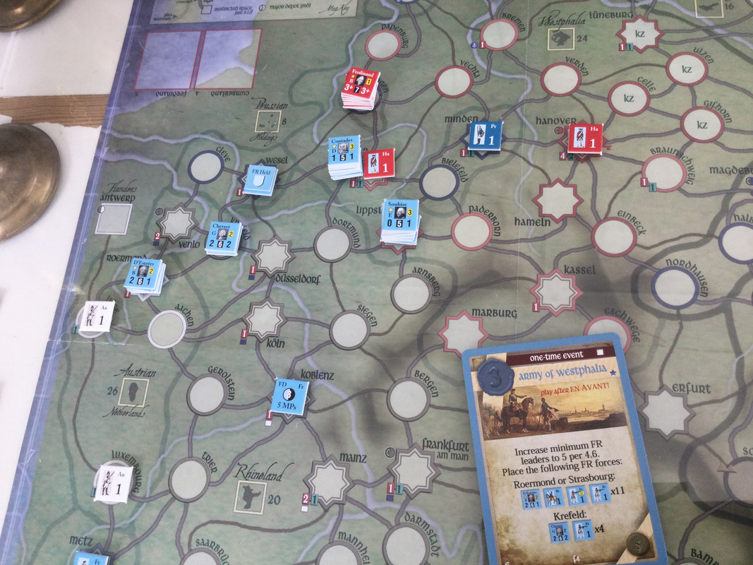 Fransmännen under Soubise är i Venlo och Cumberland återtar befälet över de anglosaxiska-allierade styrkorna i Uppstadt.