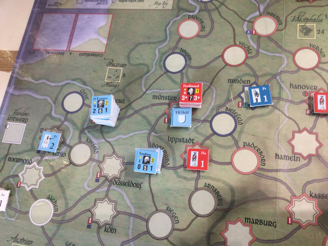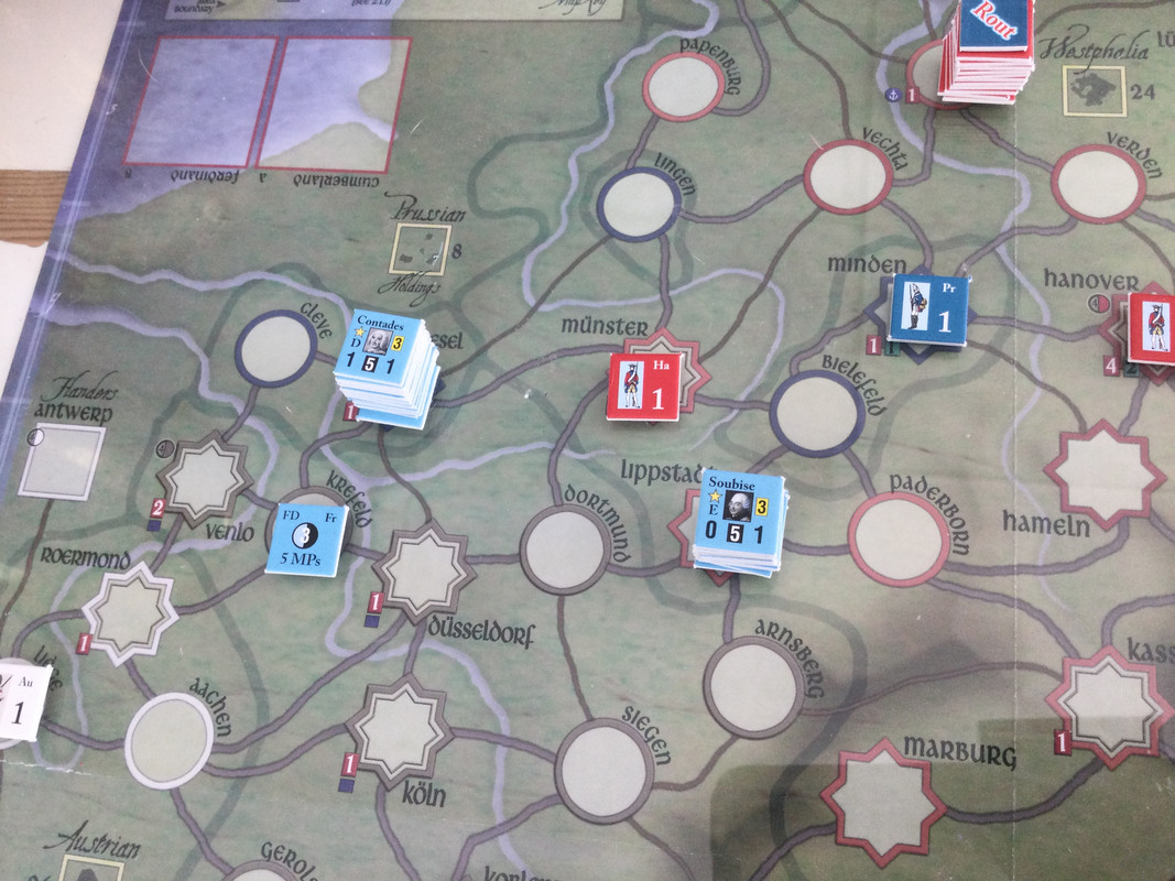 Har missat att rapportera att Cumberland försökte följa upp med ett anfall på Soubise som slogs tillbaka men lämnade båda demoraliserade. Fransmännen mobiliserar ännu en armé under Contades som anfaller Cumberland, men de slås tillbaka, utan att demoraliseras, trots att Cumberlands armé ännu är demoraliserad. Soubise rör sig till Uppstadt.