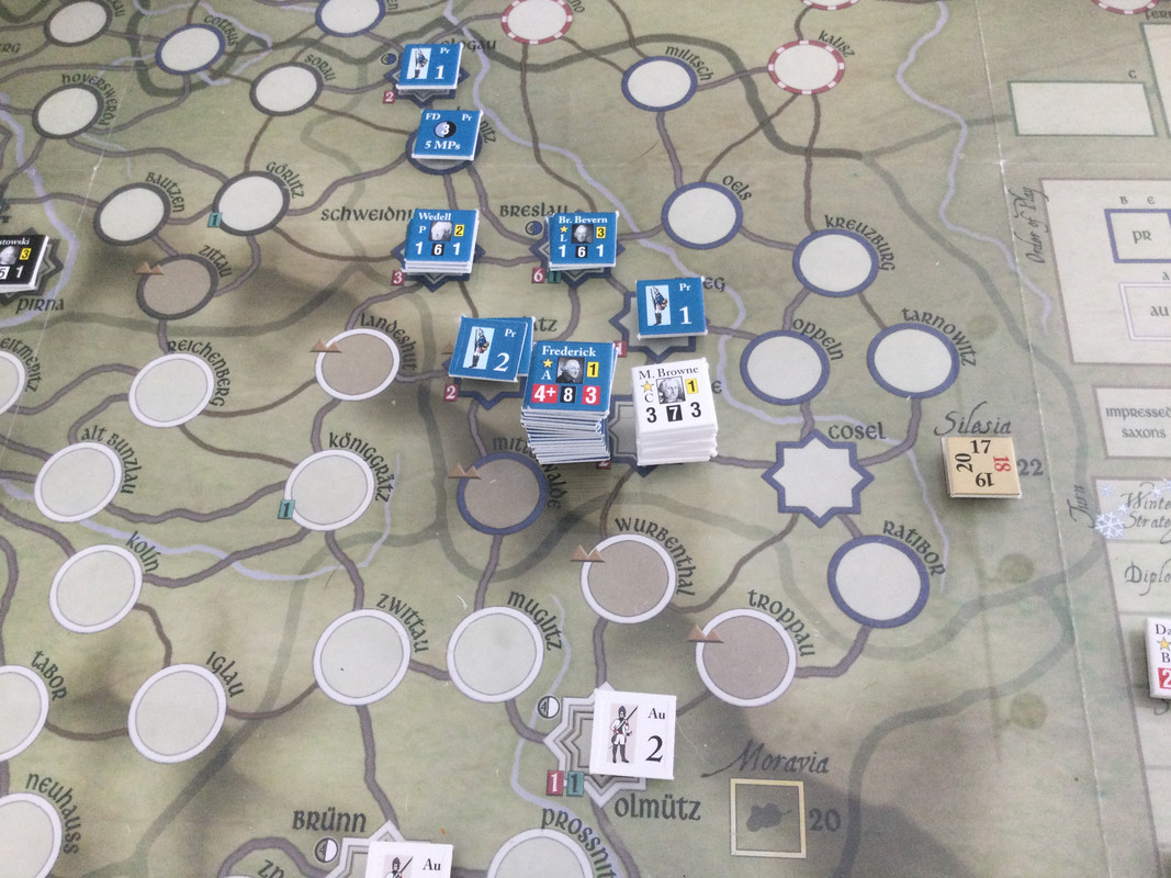 Vintern närmar sig och Daun går till vinterkvarter i Prag. Det innebär att Browne inte får en chans att ta Neisse. Men jag vill inte tappa 20% av Dauns armé. Browne når vinterkvarter i närheten utan tapp.