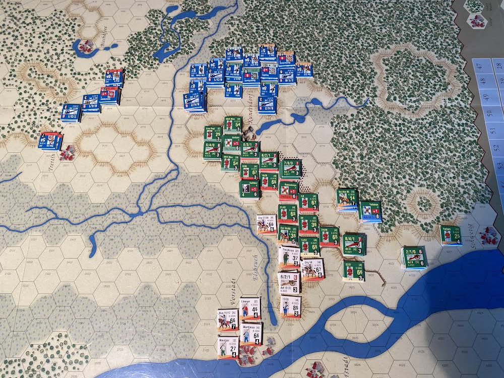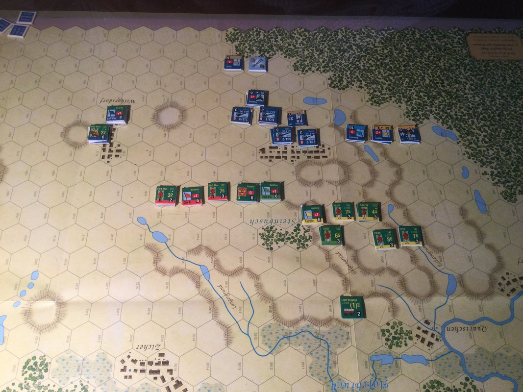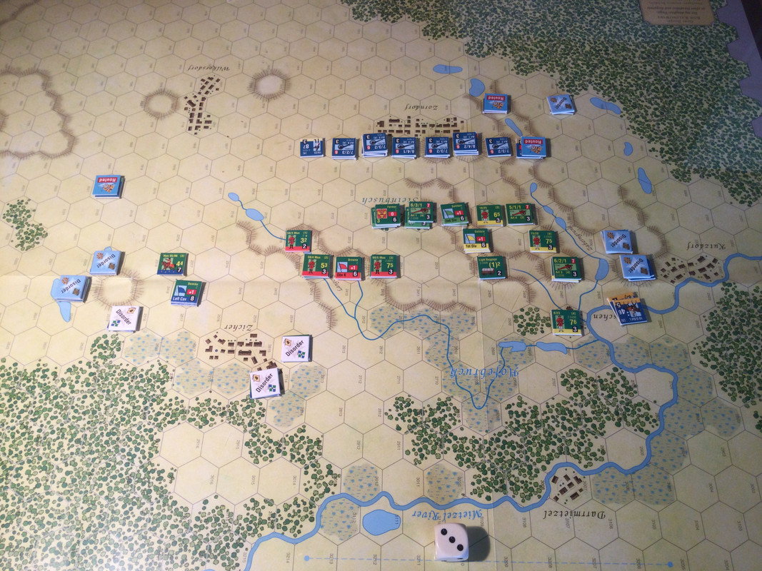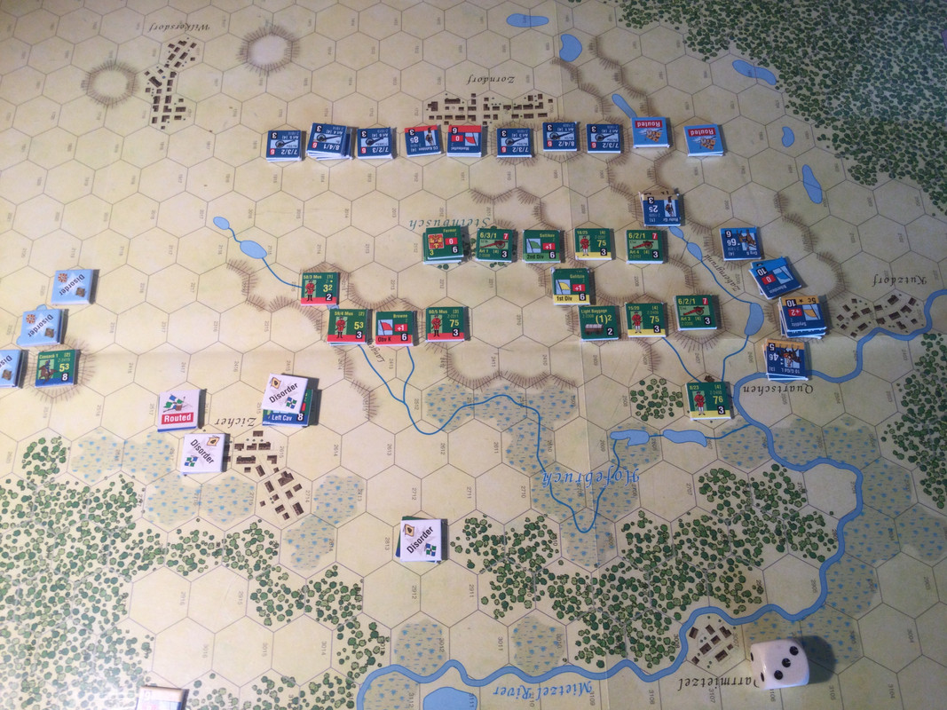 Det ena misstaget var att gruppera infanteriet inom räckvidd för det preussiska artilleriet. Även om det är på maxavstånd  får han god verkan då han kraftsamlar eld från flera enheter mot ett mål. Mitt eget artilleri är inte grupperat i främre ledet utan är tänkt att möta preussaren med eld när han tvingar mitt främre led bakåt med sitt infanteri. Det verkade klokt när jag valde att göra så, hans infanteri borde betvinga mitt och jag ville inte omgruppera artilleriet och låta dem ta eld utan att kunna skjuta tillbaka under omgrupperingen. Men nu är mitt infanteri värnlöst och han kan bara bängla på! Det uppstår ett hållit min linje mellan Centern och den yttersta högern. Den preussiska vänstern kan anfalla den yttersta högern från tre håll (hex)! Jag har enda framgrupperade artilleri där, så det kommer kosta lite, och under artilleriet finns ett grenadjärförband. Men oddsen är emot mig näst GT. Preussaren kommer inte missa den chansen.