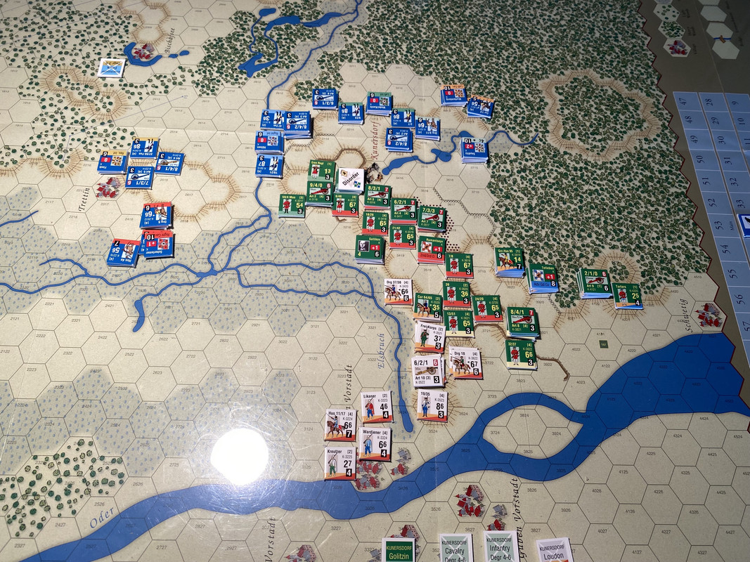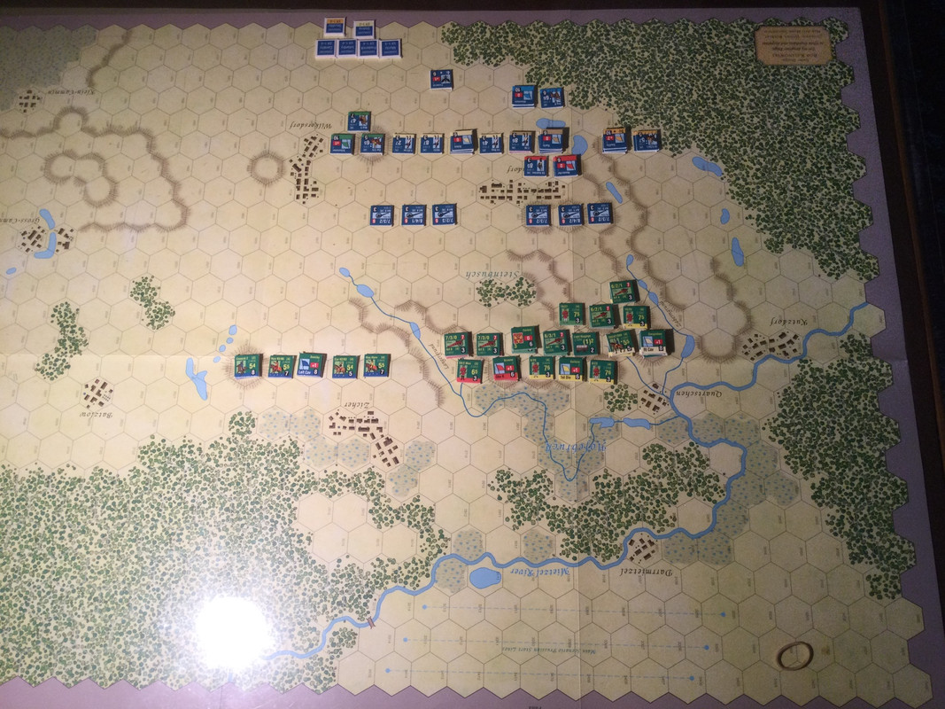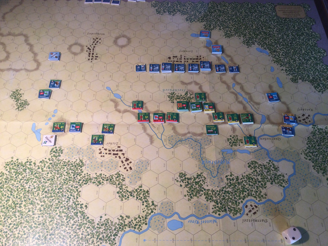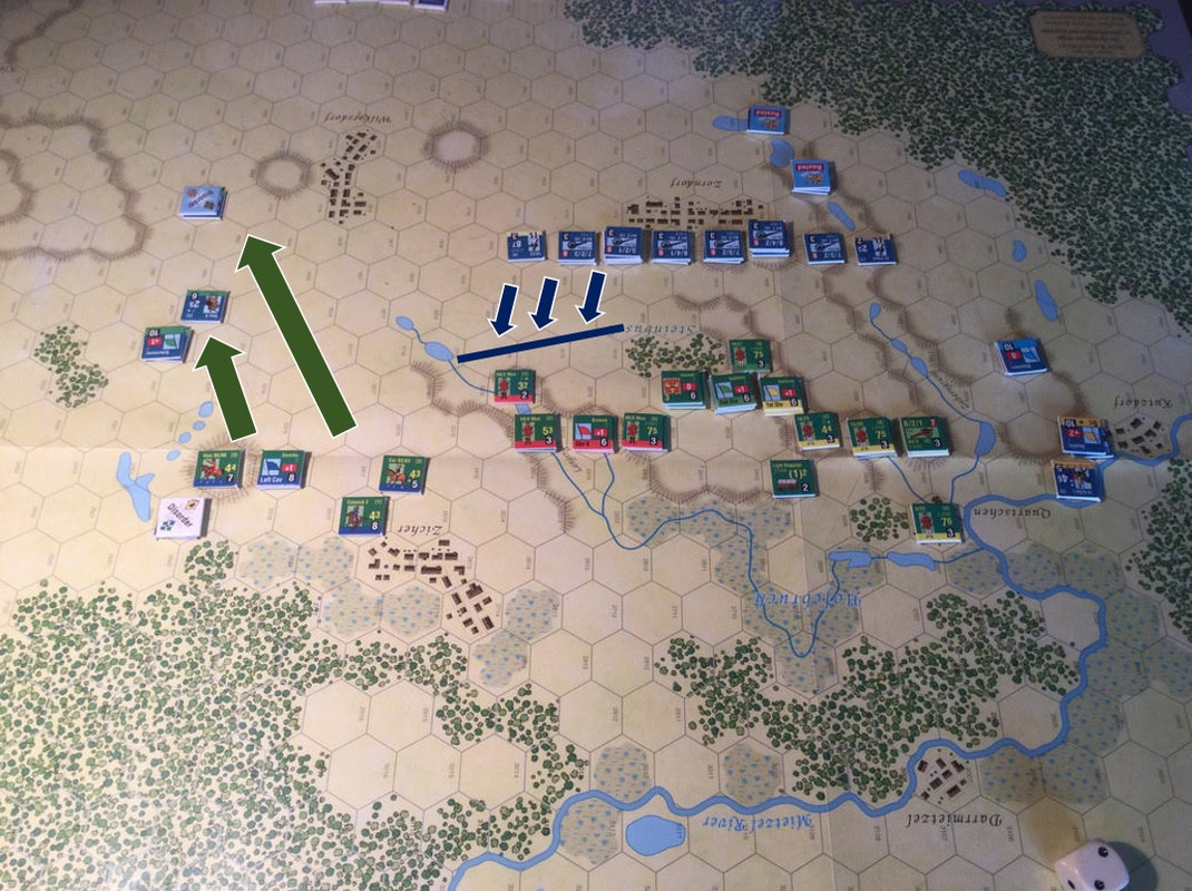 Det ena misstaget var att gruppera infanteriet inom räckvidd för det preussiska artilleriet. Även om det är på maxavstånd  får han god verkan då han kraftsamlar eld från flera enheter mot ett mål. Mitt eget artilleri är inte grupperat i främre ledet utan är tänkt att möta preussaren med eld när han tvingar mitt främre led bakåt med sitt infanteri. Det verkade klokt när jag valde att göra så, hans infanteri borde betvinga mitt och jag ville inte omgruppera artilleriet och låta dem ta eld utan att kunna skjuta tillbaka under omgrupperingen. Men nu är mitt infanteri värnlöst och han kan bara bängla på! Det uppstår ett hållit min linje mellan Centern och den yttersta högern. Den preussiska vänstern kan anfalla den yttersta högern från tre håll (hex)! Jag har enda framgrupperade artilleri där, så det kommer kosta lite, och under artilleriet finns ett grenadjärförband. Men oddsen är emot mig näst GT. Preussaren kommer inte missa den chansen.