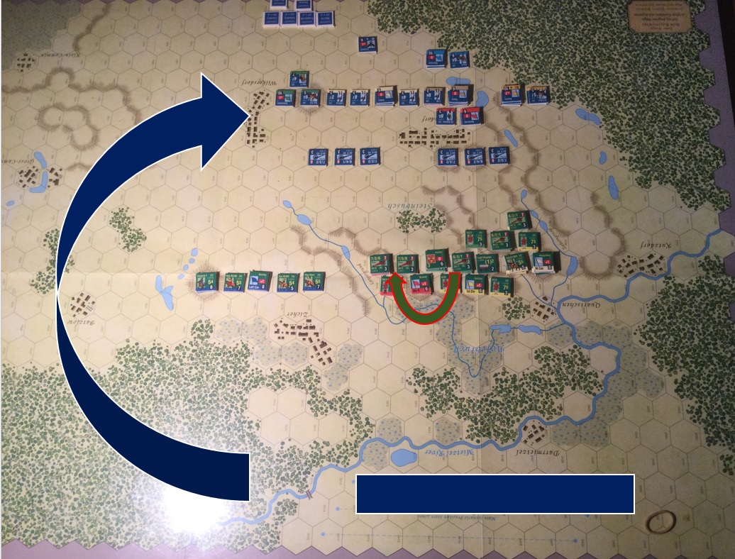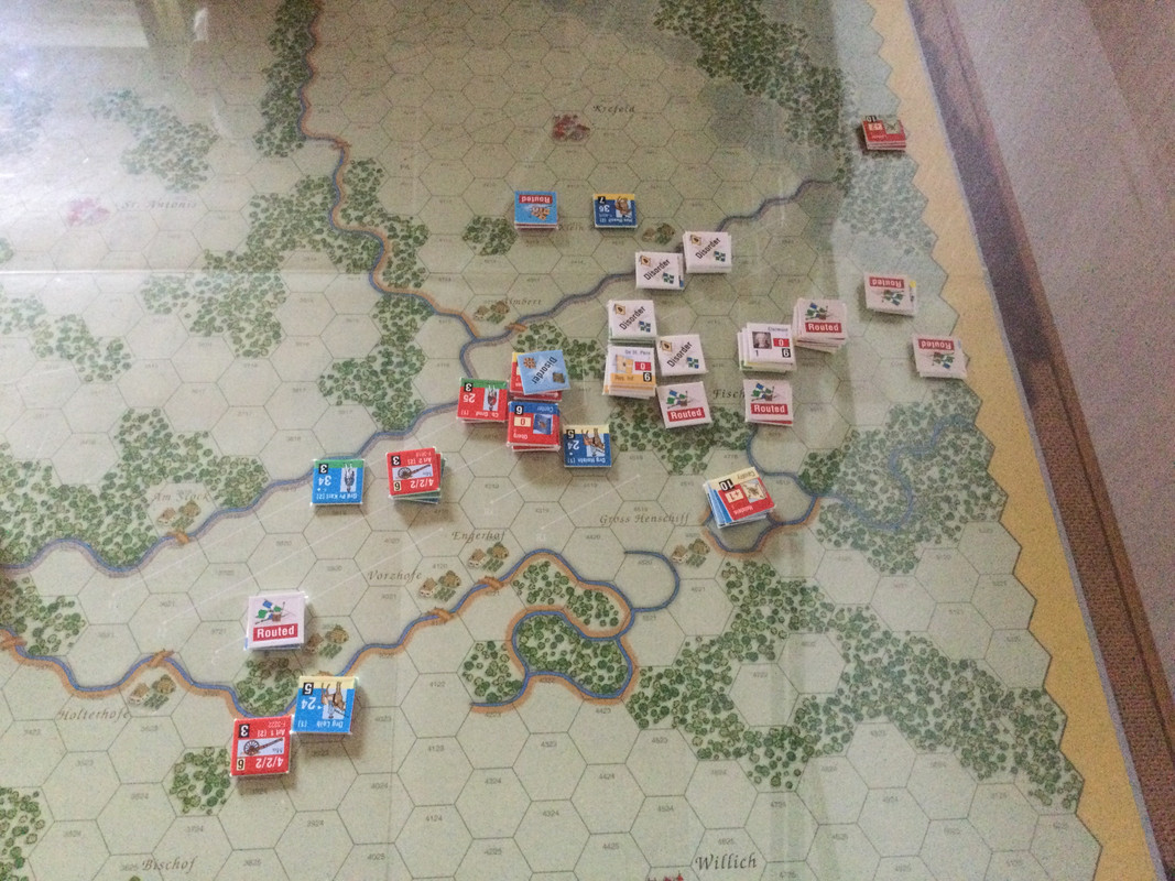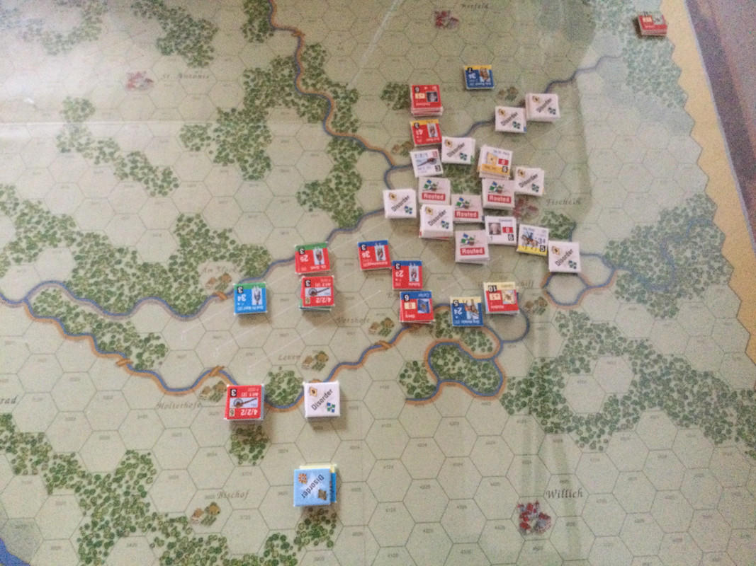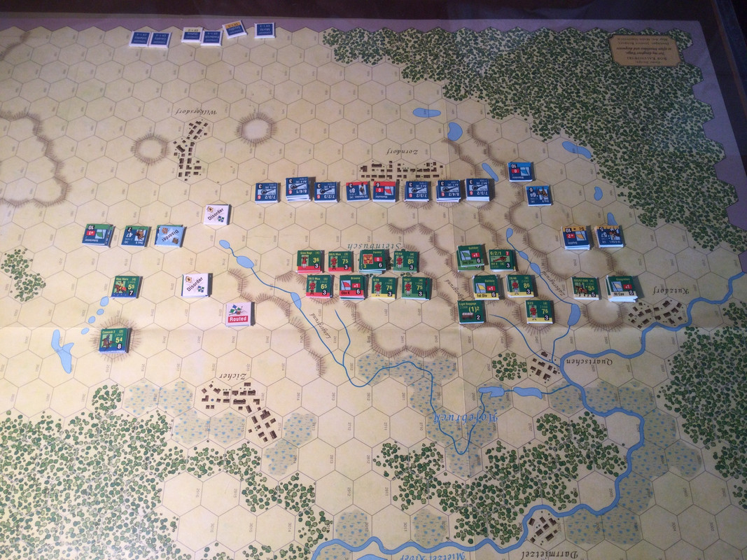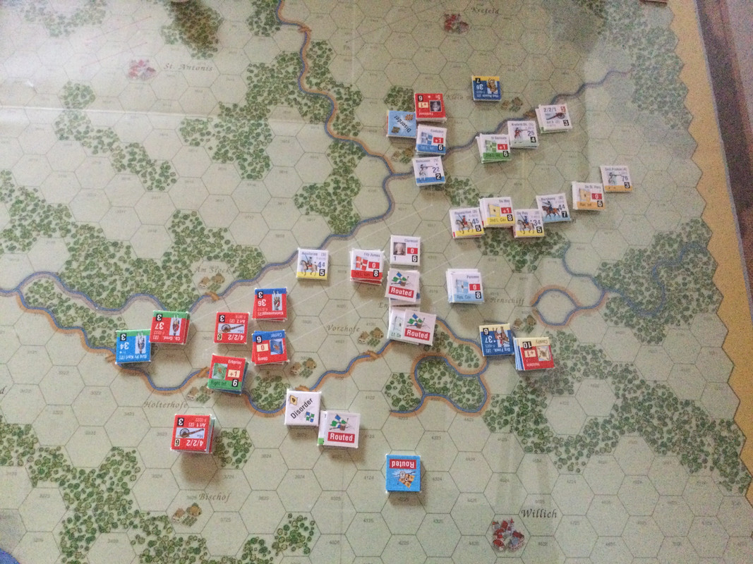 De allierade har också stora förluster och hade nått demoraliseringsgränsen med råge, om det varit för den fiffiga regeln om combat success. Den innebär att varje gång en fientlig bricka elimineras eller "routas " så får man en combat successpoäng. Tre sådana tar bort en egen förlust moralmässigt. De allierade har sådan framgång att de egna förlusterna visserligen är besvärande, men risken för demoralisering hålls låg.