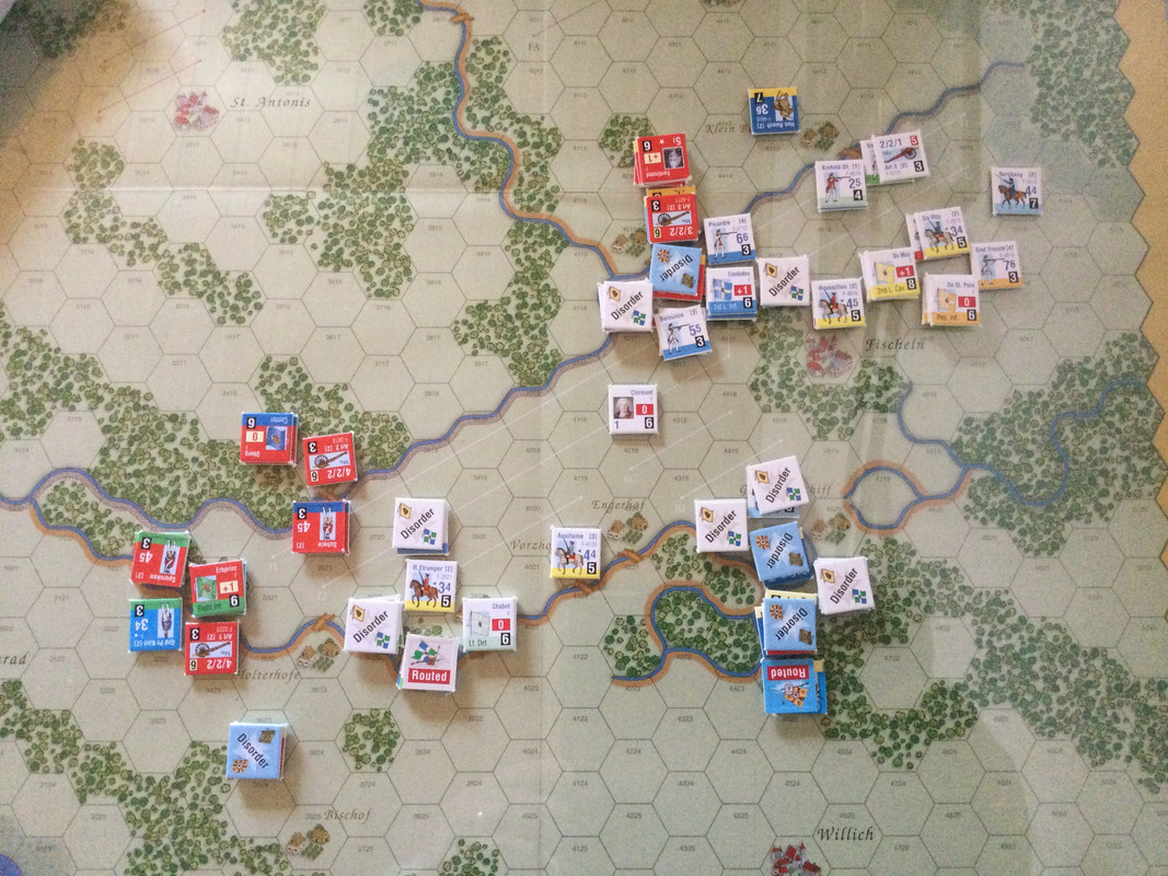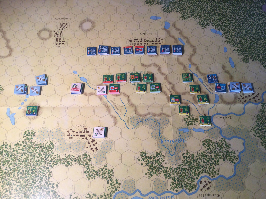 Den franska vänsterns kollaps accelererar. Kavallerifäktningen på högerns södra del slutar till hanovrarnas-preussarnas fördel, vilket var lite överraskande. På högerns norra del däremot krossas de sista allierade förbanden söder om vattendraget, och ett franskt motanfall tar sig över på norra sidan! Det hindrar dock inte att den franska armén når demoraliseringsnivån. Den franska reserven, det gulmarkerade kavalleriet och det oranga infanteriet rör sig mot vänstern för att försöka rädda situationen.