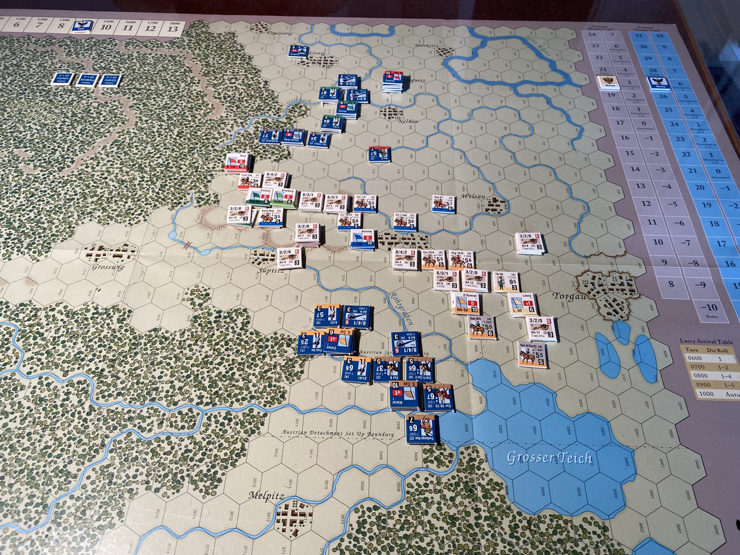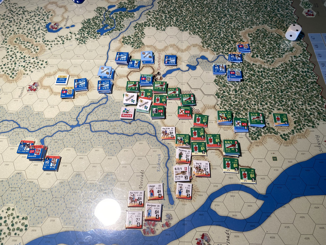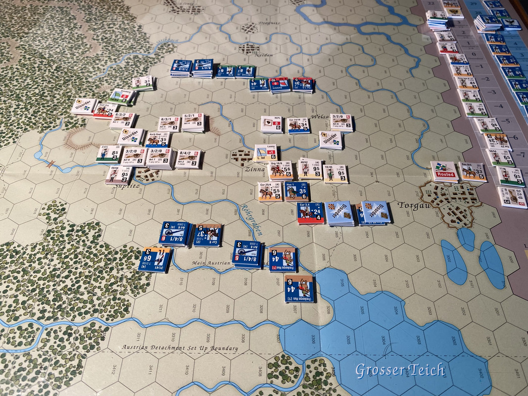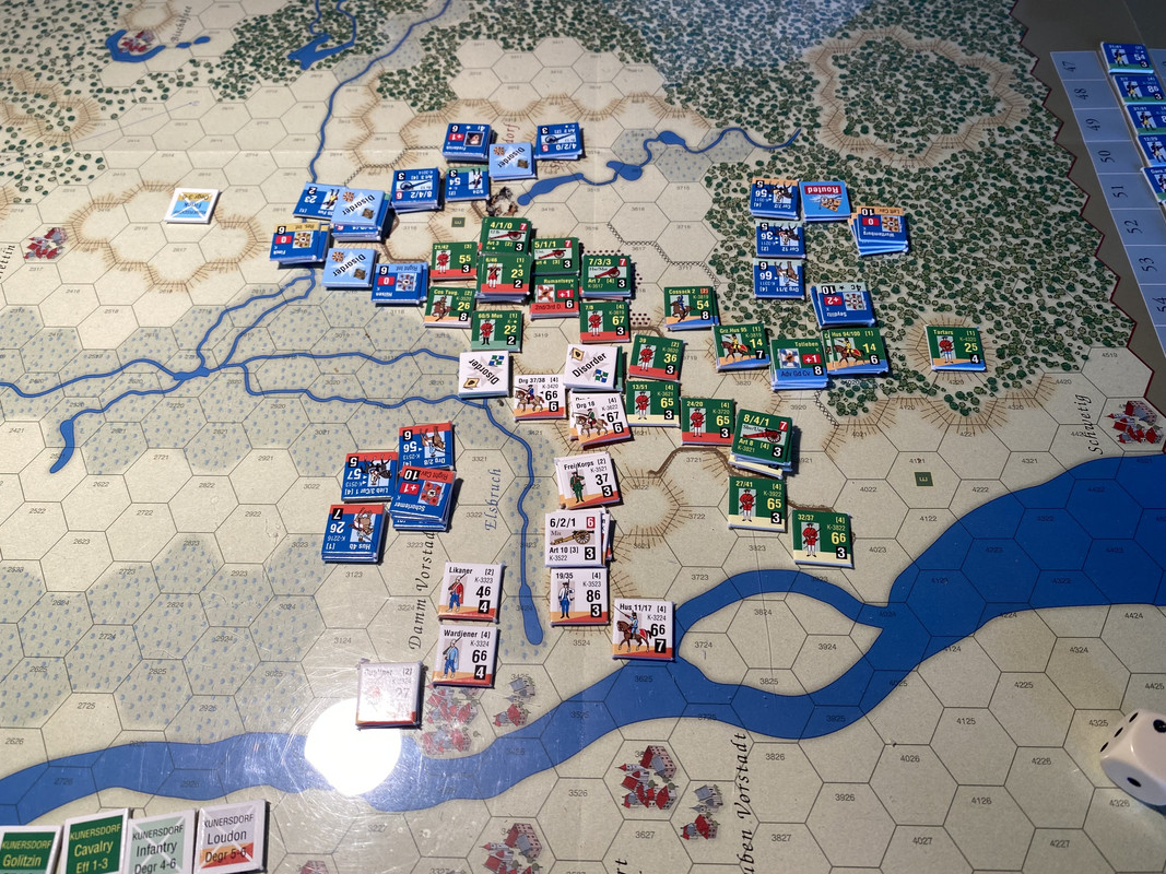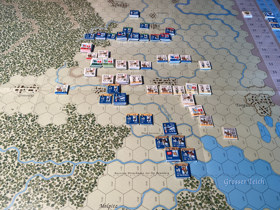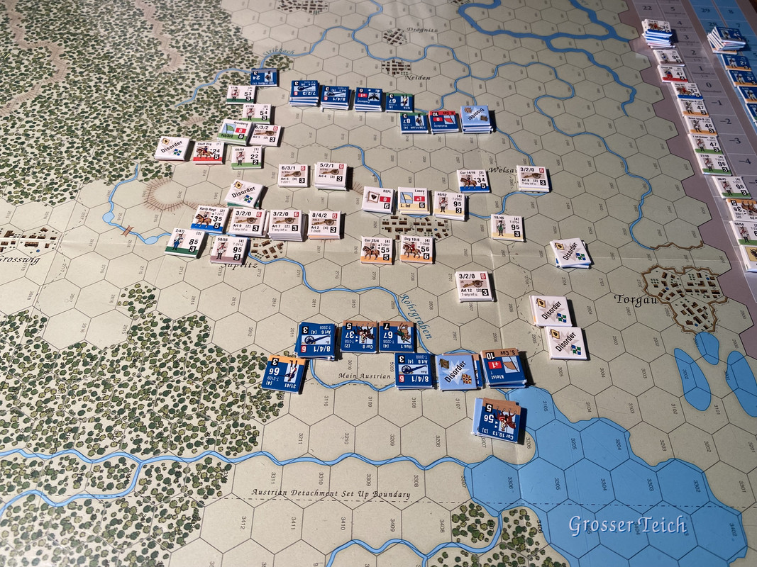 Precis. Vi kör den historiska grupperingen vid själva slagets början. Blir kortare. Jag tittade lite på de första scenarionas uppmarschstartlägen och tyckte att det var ganska uppenbart vad preussaren, för det handlar mest om denne, skulle gjort för manöver för att undvika frontalanfallet.  Så det skulle bli samma rörelse, men utfallet skulle kunna bli annorlunda pga tärningslag, dvs till stor del utanför vår påverkan. Det  är en bra idé att ha optionen att spela uppmarschen då det så klart ökar omspelbarheten avsevärt. Vi tänkte köra det historiska slaget först, och därefter uppmarschvarianten, men vi märkte att det skulle bli samma slag igen, mer eller mindre. Så vi föredrog att köra genom alla historiska slag och sedan, kanske börja om, med uppmarscherna. Det skulle bli mer varierat så att säga. Vi får se hur vi gör...