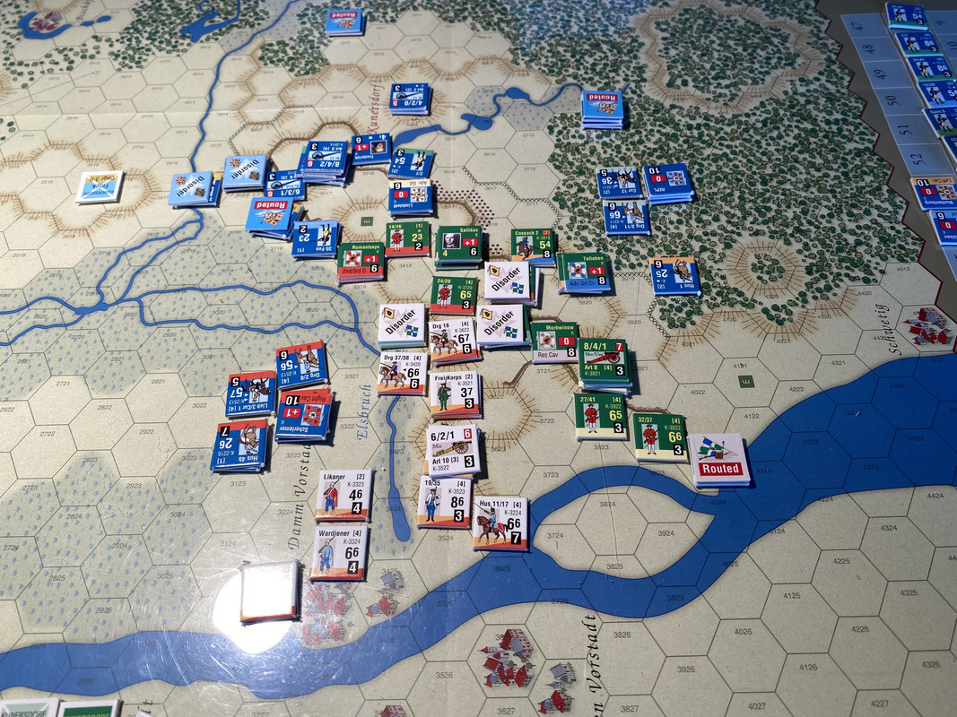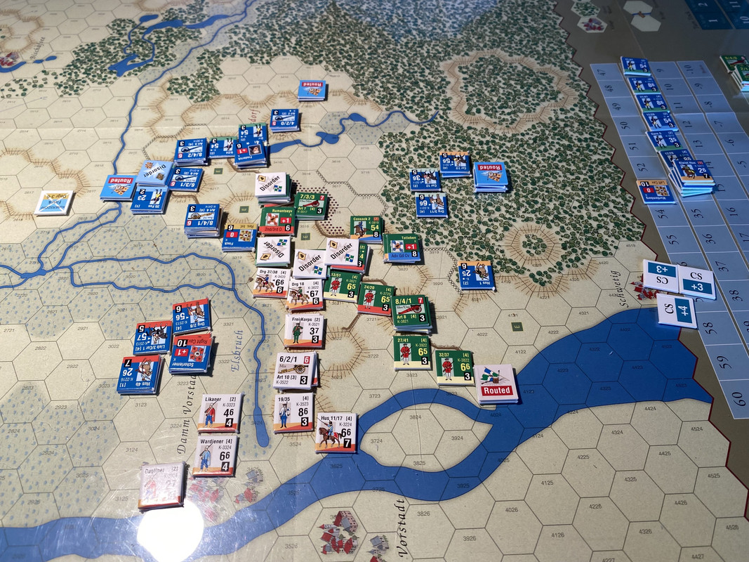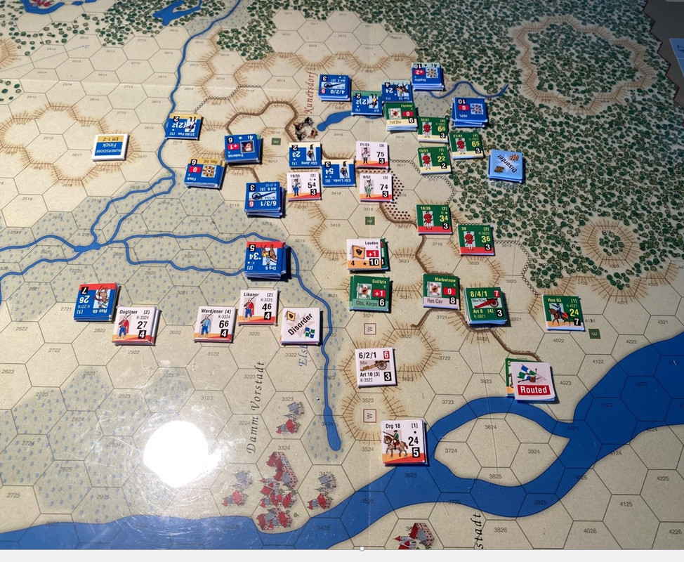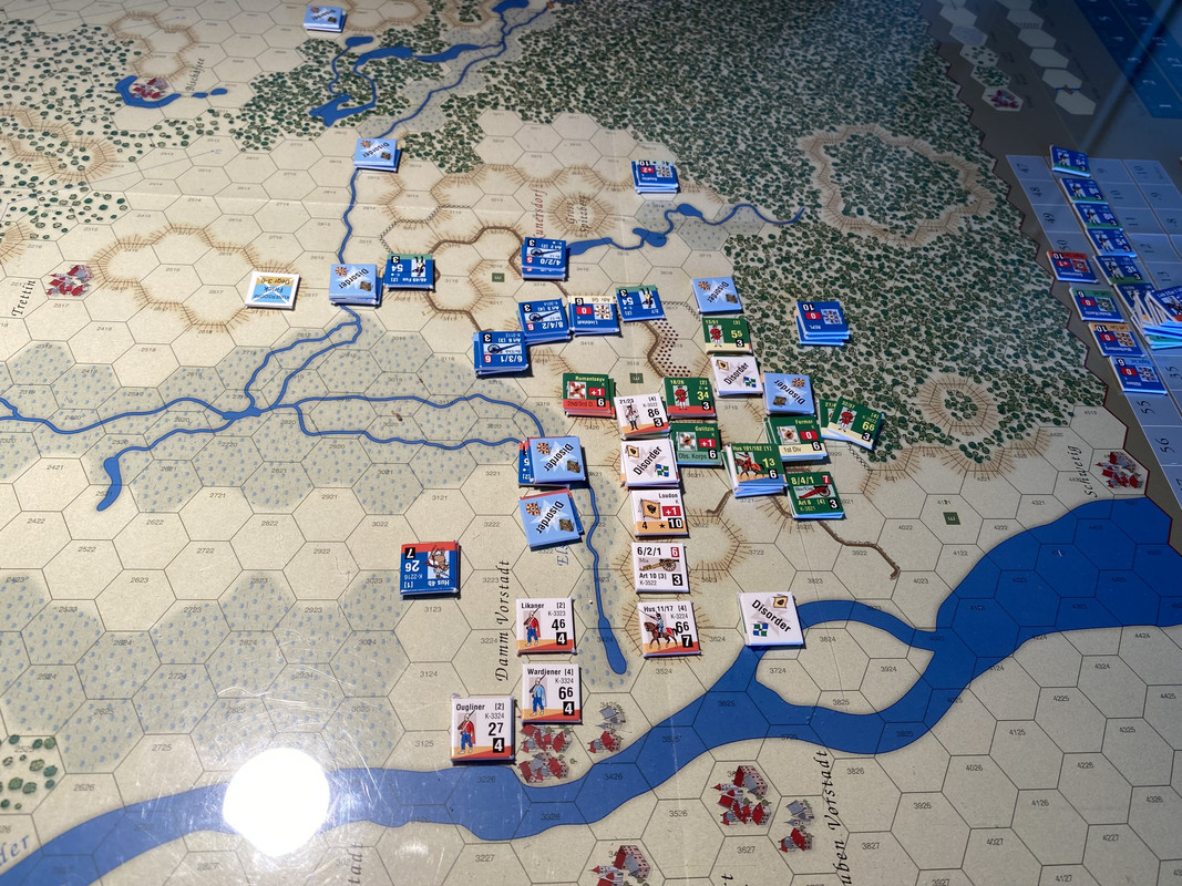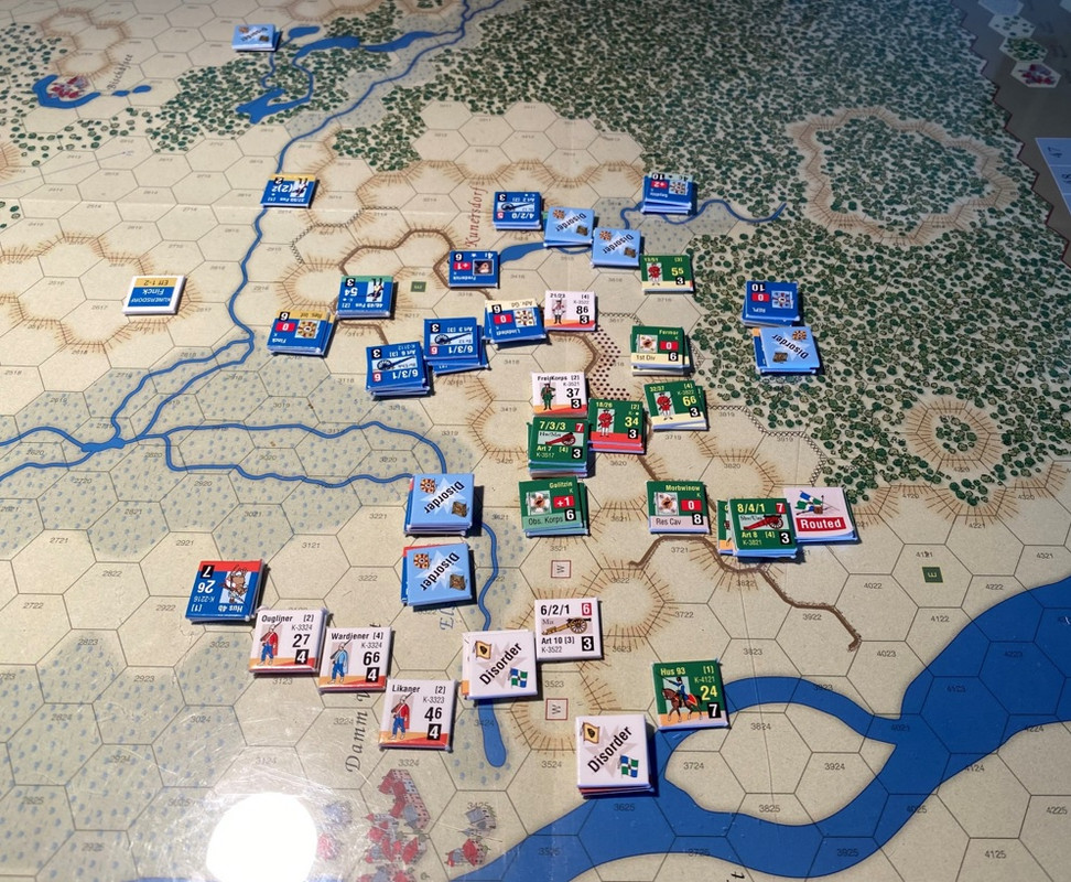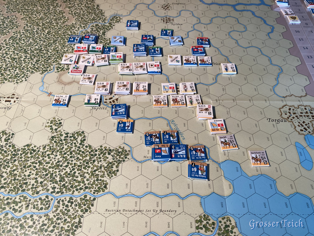 Precis. Vi kör den historiska grupperingen vid själva slagets början. Blir kortare. Jag tittade lite på de första scenarionas uppmarschstartlägen och tyckte att det var ganska uppenbart vad preussaren, för det handlar mest om denne, skulle gjort för manöver för att undvika frontalanfallet.  Så det skulle bli samma rörelse, men utfallet skulle kunna bli annorlunda pga tärningslag, dvs till stor del utanför vår påverkan. Det  är en bra idé att ha optionen att spela uppmarschen då det så klart ökar omspelbarheten avsevärt. Vi tänkte köra det historiska slaget först, och därefter uppmarschvarianten, men vi märkte att det skulle bli samma slag igen, mer eller mindre. Så vi föredrog att köra genom alla historiska slag och sedan, kanske börja om, med uppmarscherna. Det skulle bli mer varierat så att säga. Vi får se hur vi gör...