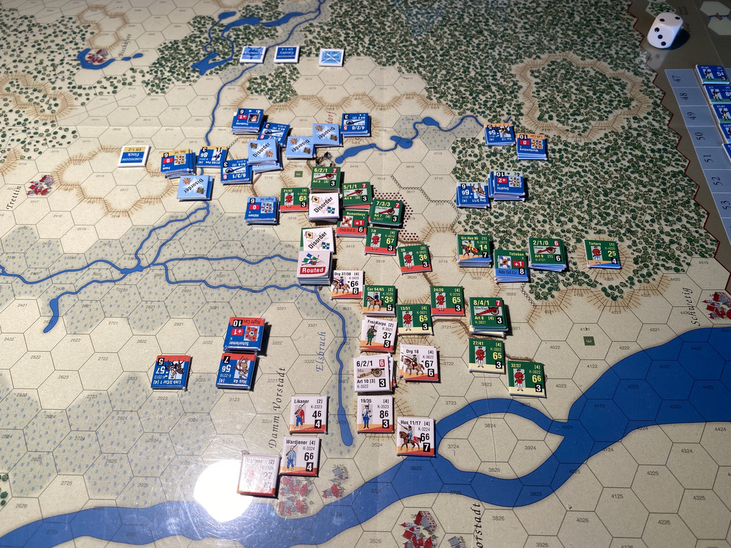 Båda sidor har nått förluster som möjliggör demoralisering. Österrikarna på 1-2 med T6, och preussarna på 1. Motparten  slår 4, och jag 2...