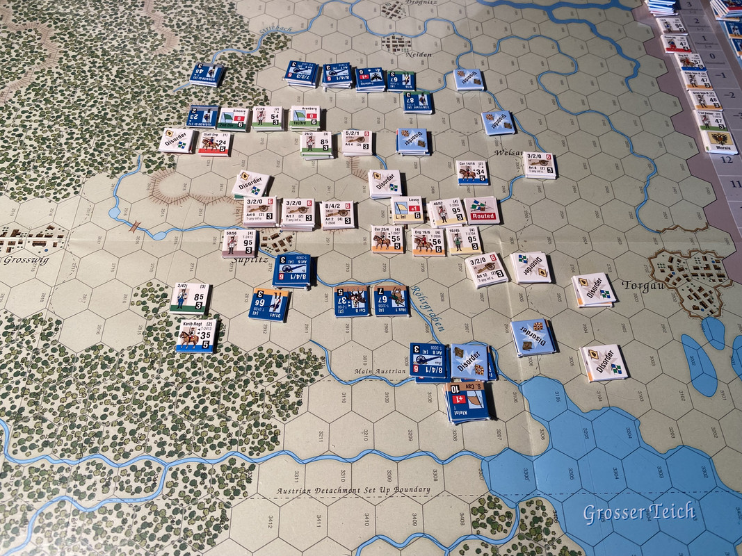 Preussarna grupperar för försvar av tagen terräng på höjden. Artilleriet gör stor skada på ryssarna, så det österrikiska infanteriet börjar röra sig norrut för att ersätta och gå till motanfall mot de nu nednötta preussarna. På högern påbörjar den ryska infanteriflygeln en rörelse norrut. Dags att ta initiativet och avgöra!