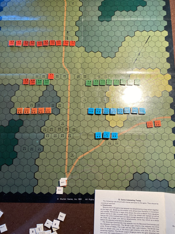 Ja, den gode Tarleton borde nog gjort det historiskt också. Tydligen gjorde många testspelare just så, så det infördes en regel att britterna måste ta vägskälet bakom amerikanernas linjer senast GT30, eller så får amrisarna en hög VP. Men Tarleton hade ju hittills alltid med lätthet jagat fienden på flykten så den 26årige överstelöjtnanten var lite arrogant vid det här laget.