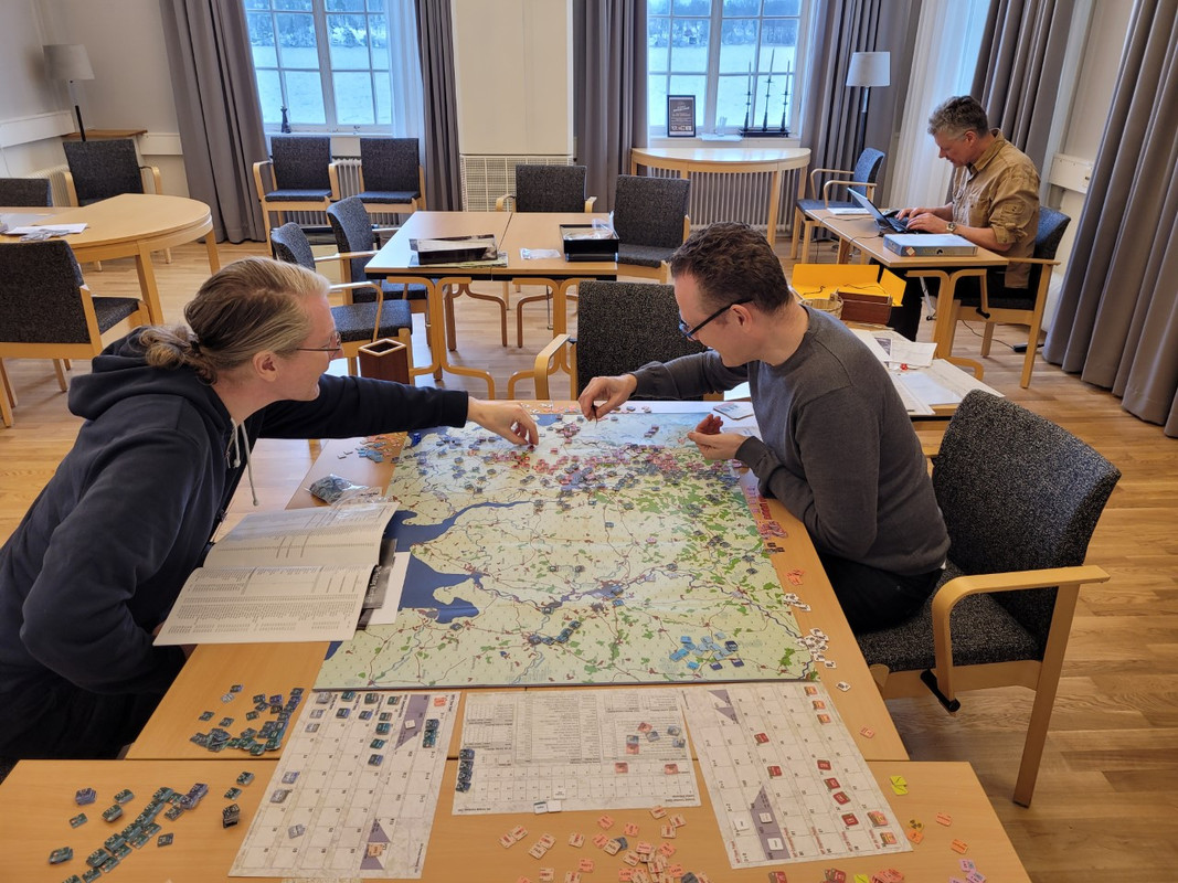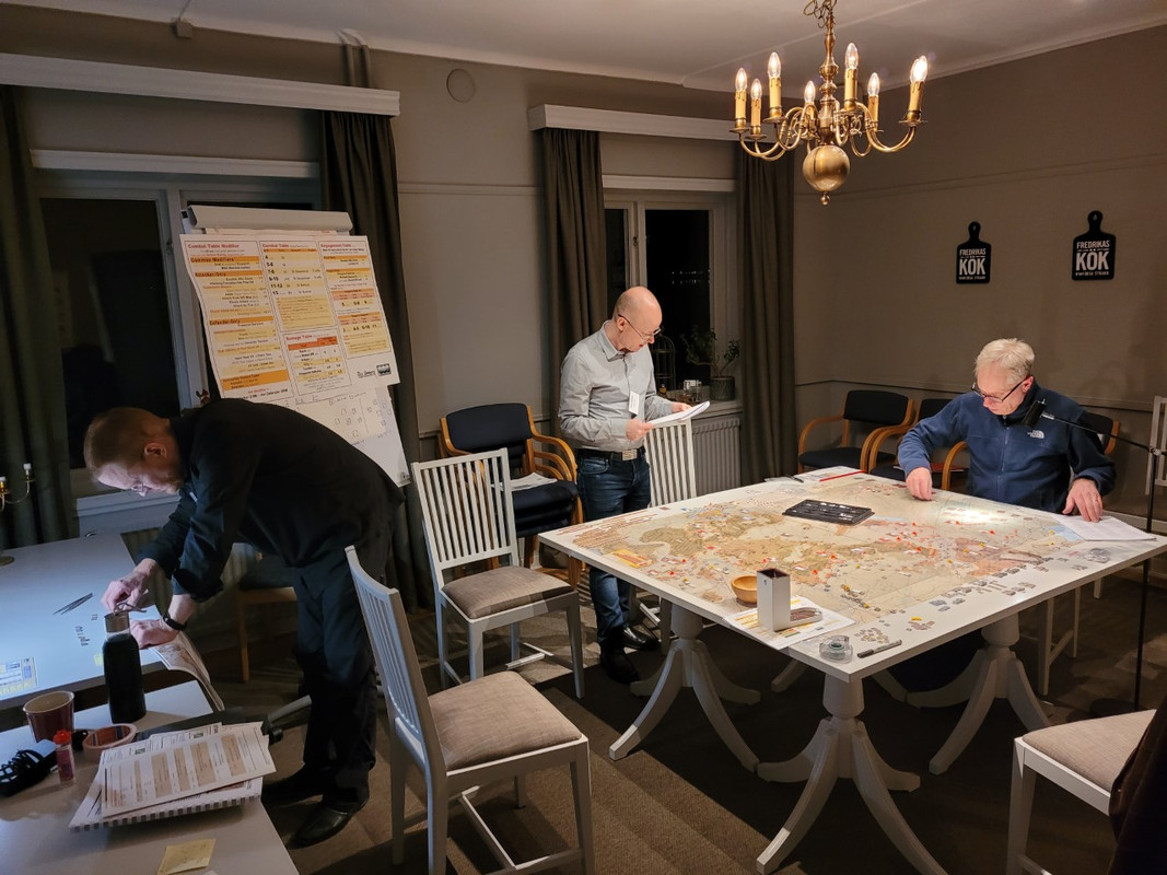 Citat från: Fredrik H skrivet 28 februari 2023 kl. 18:32:58Här har vi BCS i Budapest. Jag var med i partiet under to-fre, men människomaterialet som fångats på bild körde in i kaklet. Två var helt nya på systemet, men enligt uppgift så vill flera av deltagarna köpa egna exemplar av spelet, så testet var lyckat. Jag vidhåller att BCS är Deans bästa system (bara CWB kan tävla om den titeln). Jag tycker bilden ser ut som ett foto på en stab i arbete.