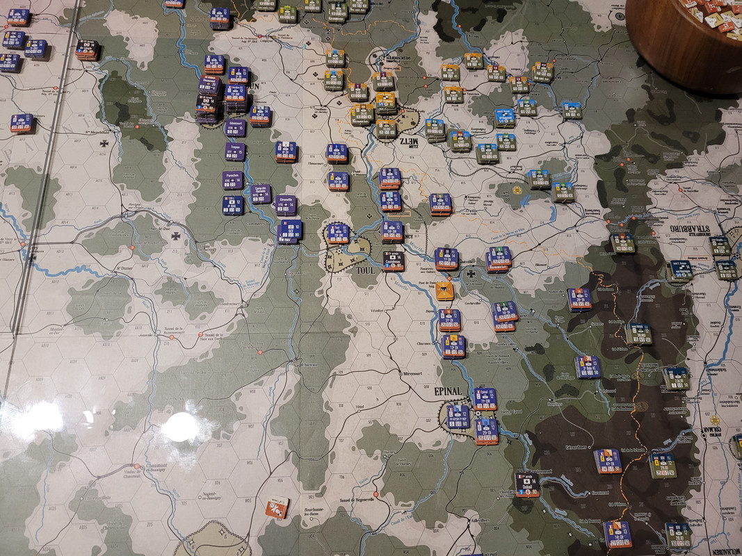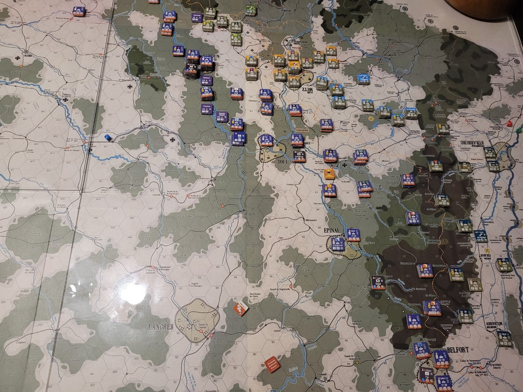 Center och syd blir nu en bild. Snart dags för en helhetsbild. Meh, nästa turn kanske. Tyskarna är nu i det närmaste fullt mobiliserade här och fransmännen inser att det i princip är ogörligt att uppnå något så man faller tillbaka över gränsen. Några kårer börjar förberedas för transport norrut.