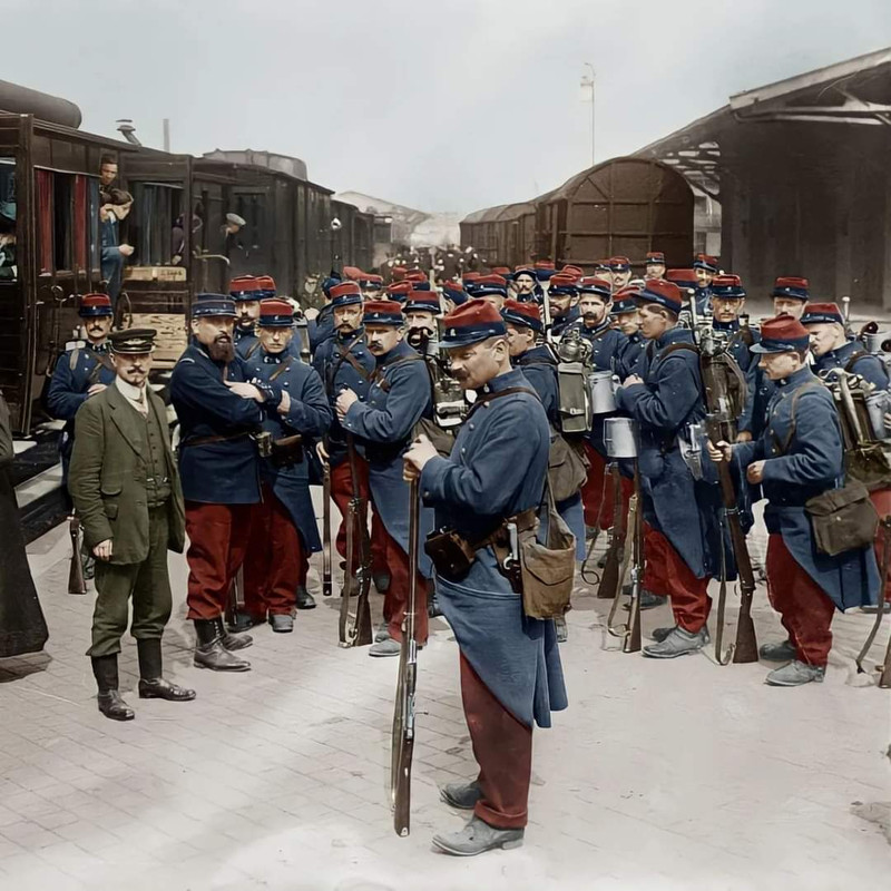 Tågåkande är viktigt och de tidiga franska uniformerna är tankemässigt så långt ifrån skyttegravskvarnen från 1918. Det var verkligen en brutal krock mellan tänkta ideal och kulsprutornas verklighet. Men vilka hjältemustascher ändå!