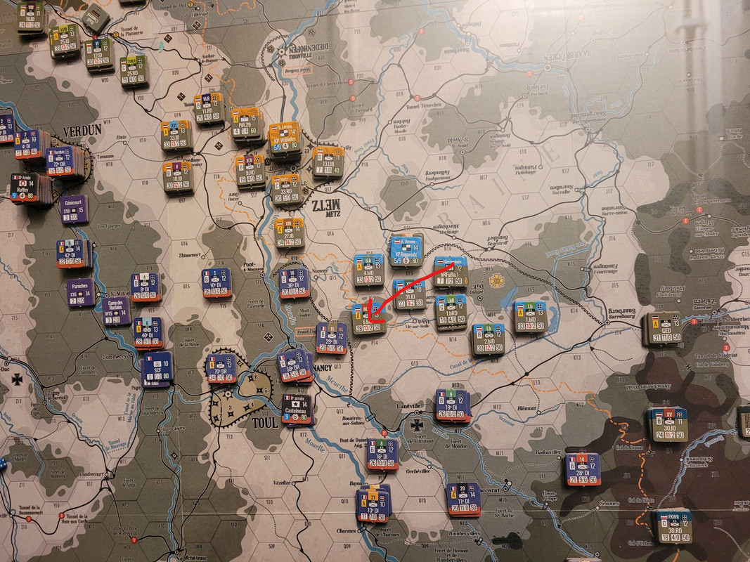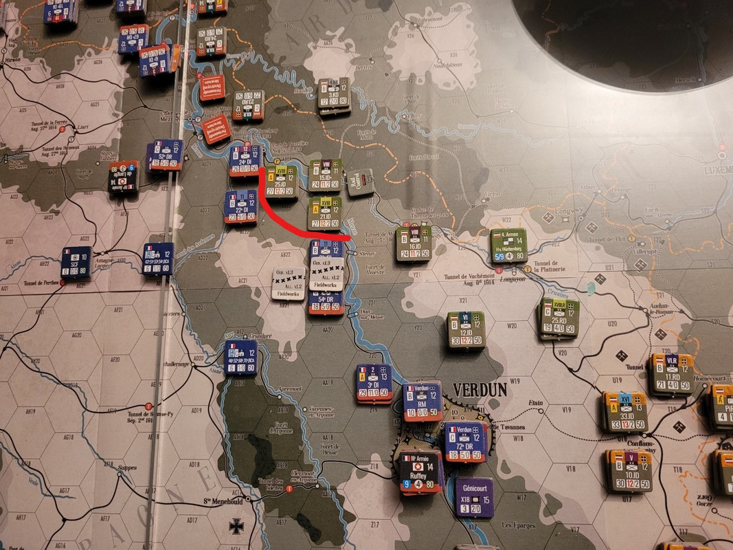Turn 13. I söder händer det inte så mycket, men några mil norr om Verdun så anfaller den tyska 4:e armén över Meuse. Man lyckas etablera ett brohuvud, men framgången vinns med stor manspillan. Det kan bli ett orosmoment för fransmännen, men det finns i nuläget inga substantiella reserver för tyskarna, så det hela lär fortsätta vara lokala förändringar snarare än operationella.