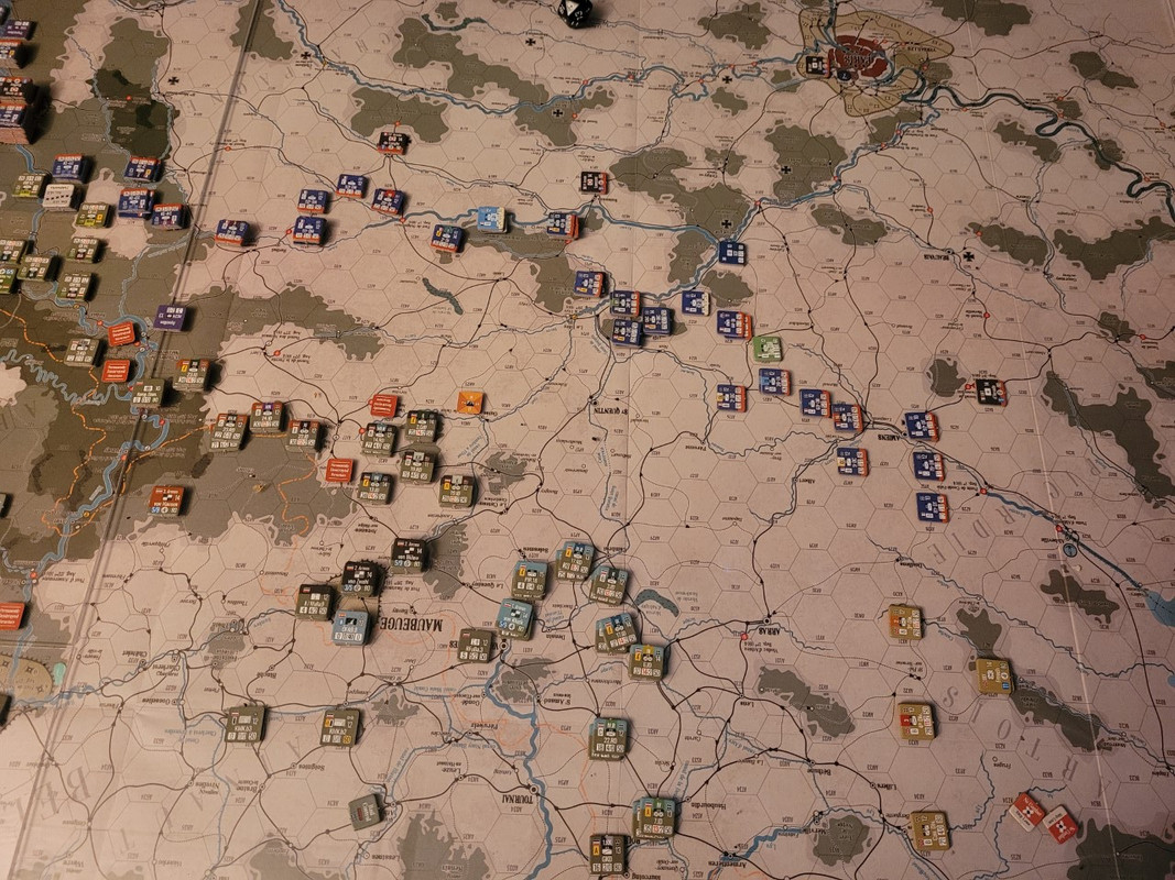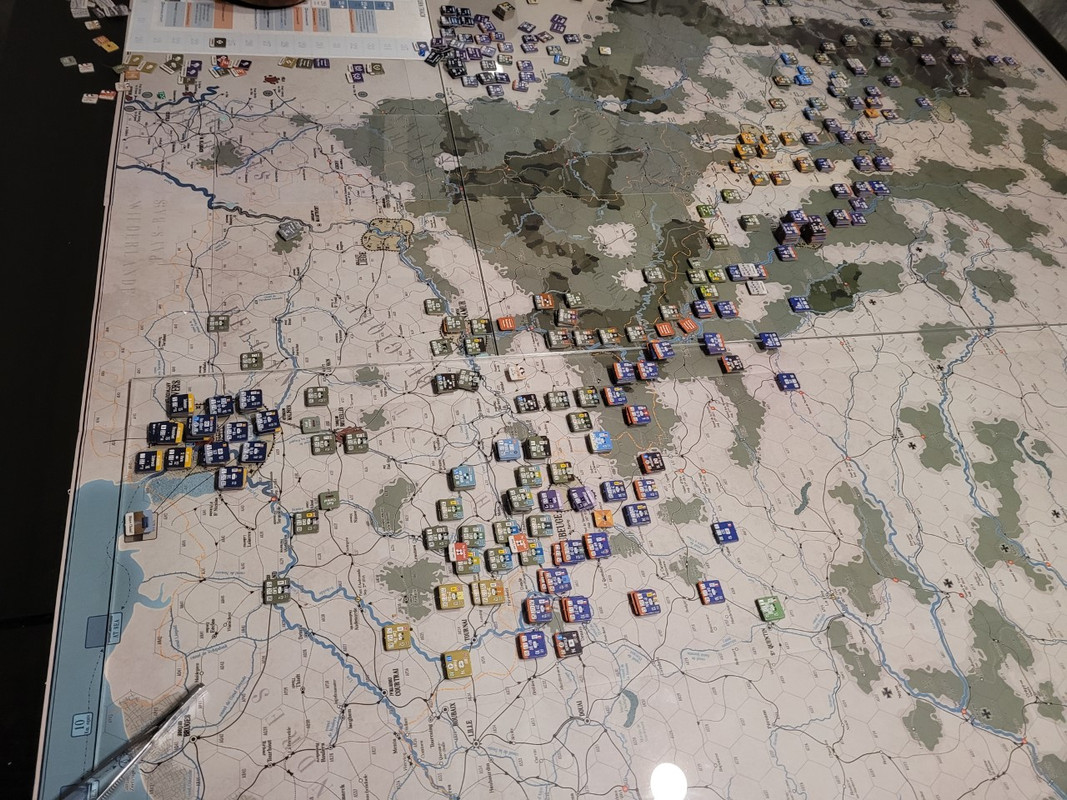Helheten från franskt håll. Om fransmännen lyckas hålla tyskarna vid gränsen skulle det vara en stor framgång, men jag är inte säker på att det kommer att gå. Som alltid (om man inte spelar SCS) så är det nog svårare att göra rätt som anfallare än försvarare första gången man spelar ett spel. Men det är fortsatt roligt och spännande så vi tutar vidare.