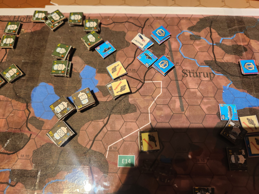 3 bat IB11 har tagit ca 50% förluster och är inte ett spelbart kort för fortsatt offensiv verksamhet. 12 mekbat F har ca 60% av stridsvagnarna rullande och av de 40% som inte är spelbara är hälften mekaniska bortfall. Pansarskyttekompanierna har knappt några förluster alls. Bataljonen lär kunna anfalla dagen efter med ung samma stridsvärde som när dagen började, men mekanikerna kommer vara trötta i morgon.