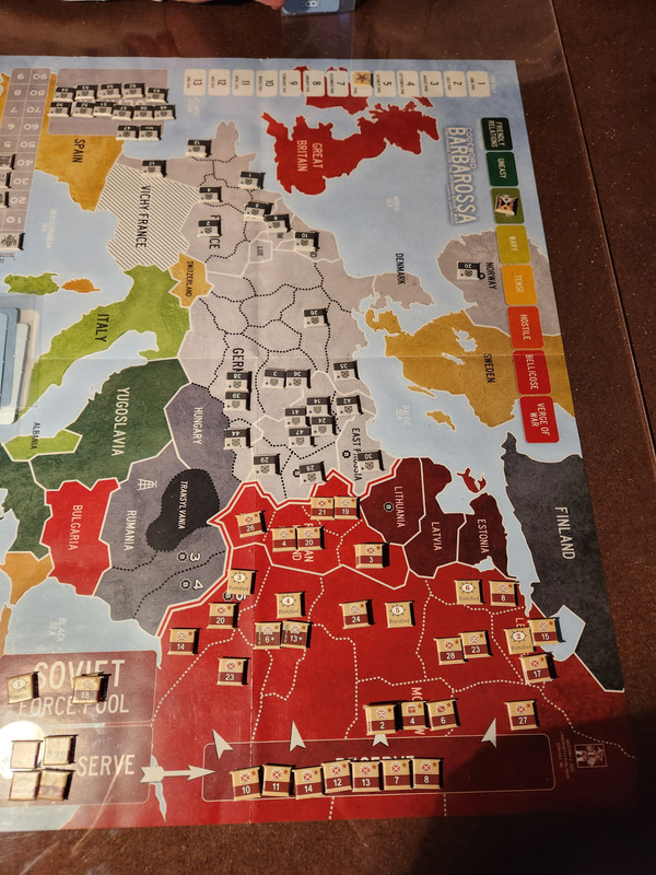 Nu händer lite saker. Den sovjetiska tekniknivån går upp ett steg till 2. Churchill varnar Stalin för Adolf vilket driver upp konfliktnivån ett steg, och det åt fanders för italienarna i Egypten och Libyen så att en pzkår får skickas dit, och för Barbarossa är det en permanent förlust i slagkraft. Och i slutet upphävs höjningen i konfliktnivå när handeln utökas mellan Tyskland och Sovjet i enlighet med Molotov-Ribbentroppakten.