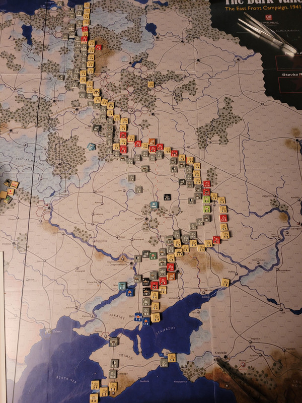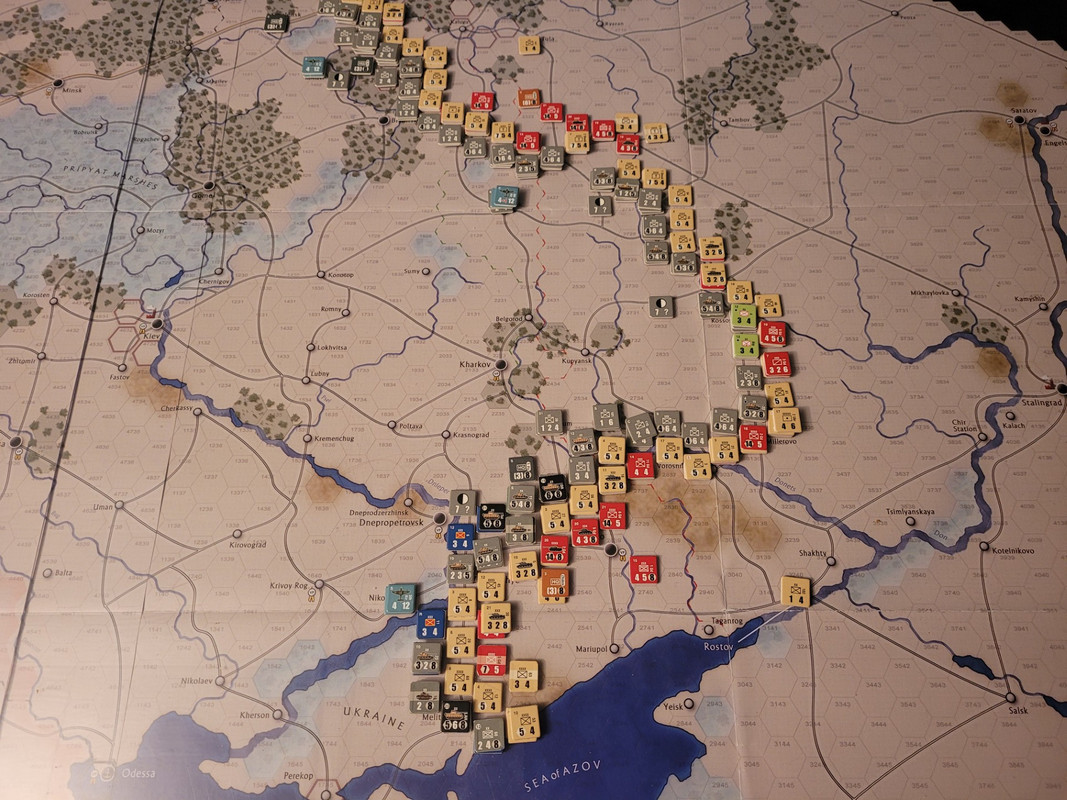 Stalin har även förstärkt längre norrut, kanske för att stöta mot Leningrad. Systemet är dock gjort så att än så länge har sovjeten en eller max två linjer han kan anfalla längs (de mörkbruna brickorna är offensiva högkvarter kan man säga), annars räknas anfallaren som OOS, vilket ger -2 på tärningen. Den modifikationen tillsammans med den sovjetiska stridstabellen genererar i det närmaste inga resultat alls.