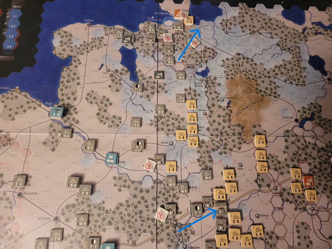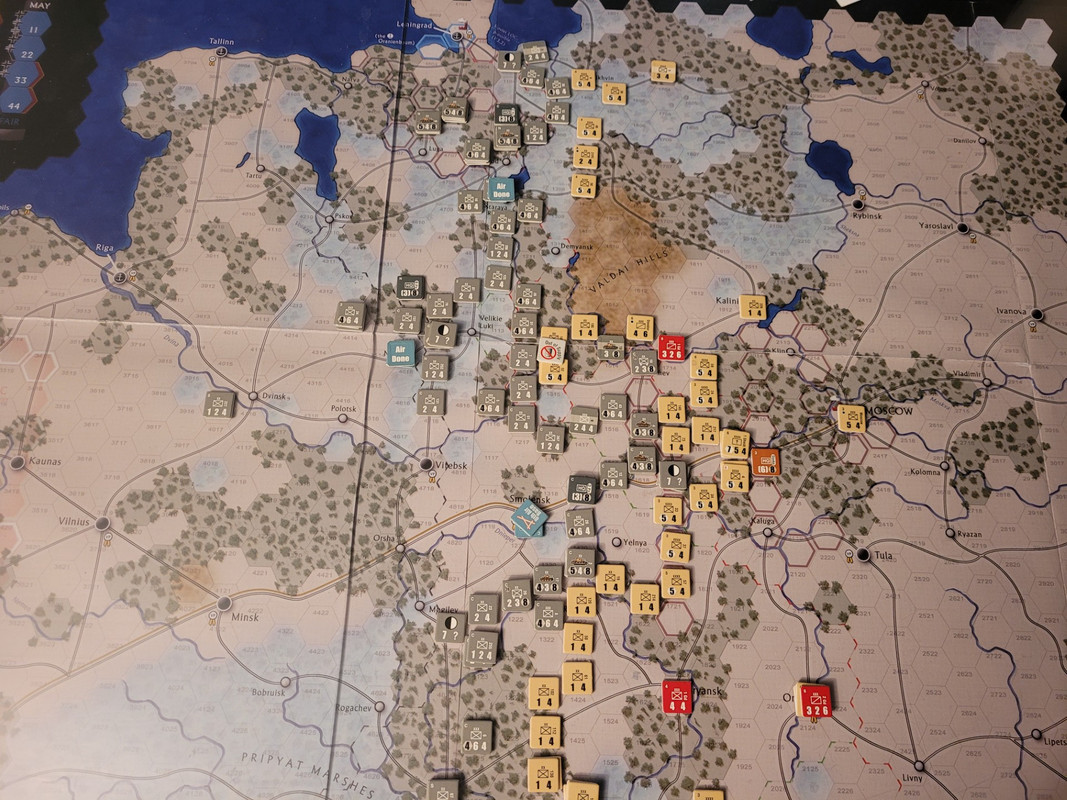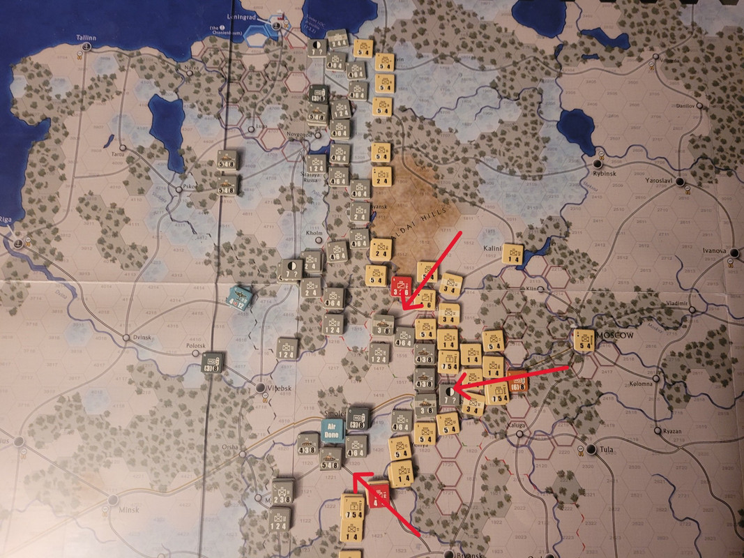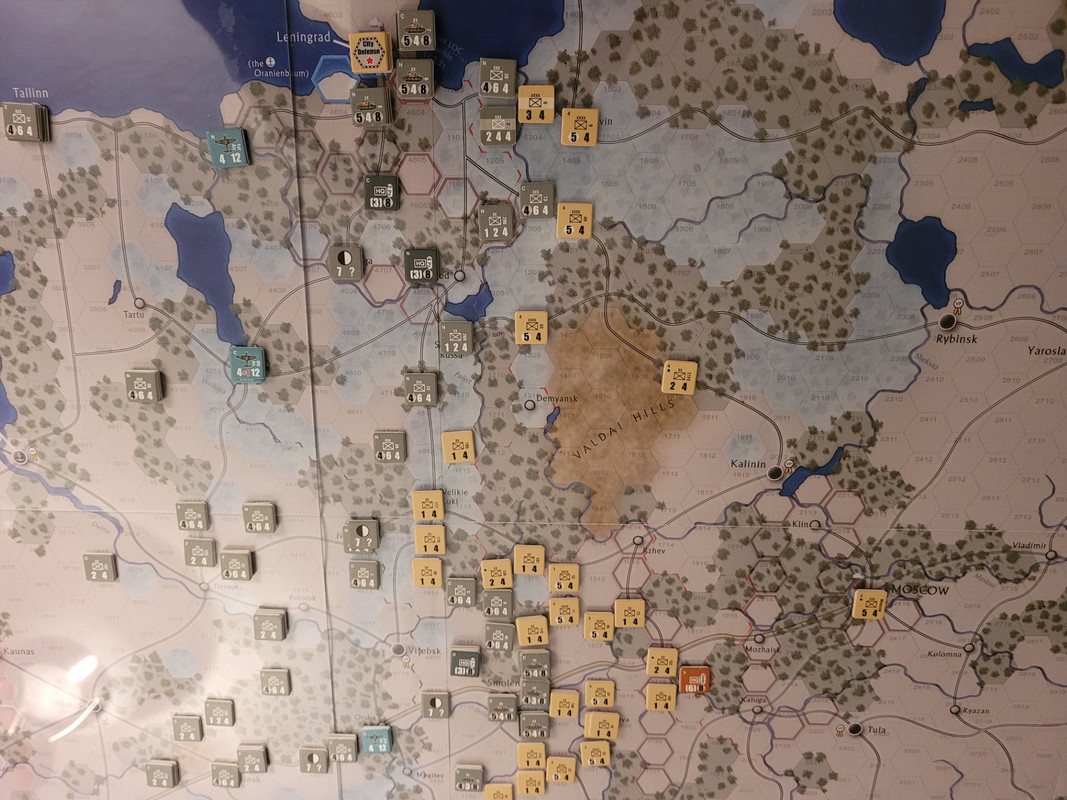 Operationsplanen blir därför Leningrad som huvudmål, Smolensk i centern och Kiev-Kharkov i söder. Spelet ogillar inte idén, Kiev och Leningrad är två städer som varje turn ger 5 RP till sovjeten, tar vi staden berövas Stalin på 11 infanteriarméer per år, inte kattskit ändå. Dessutom finns det ett stort symbolvärde i att ta staden som bär Lenins namn.