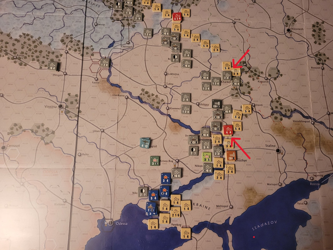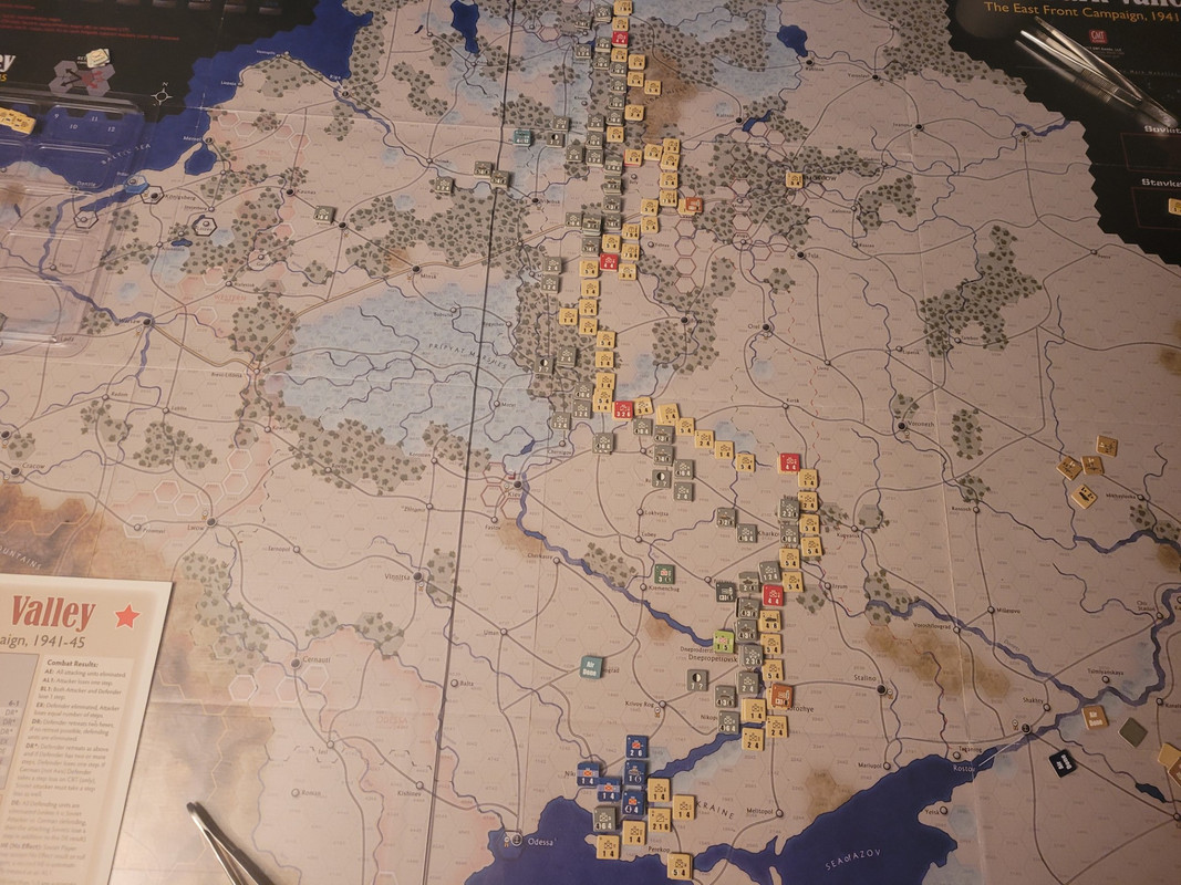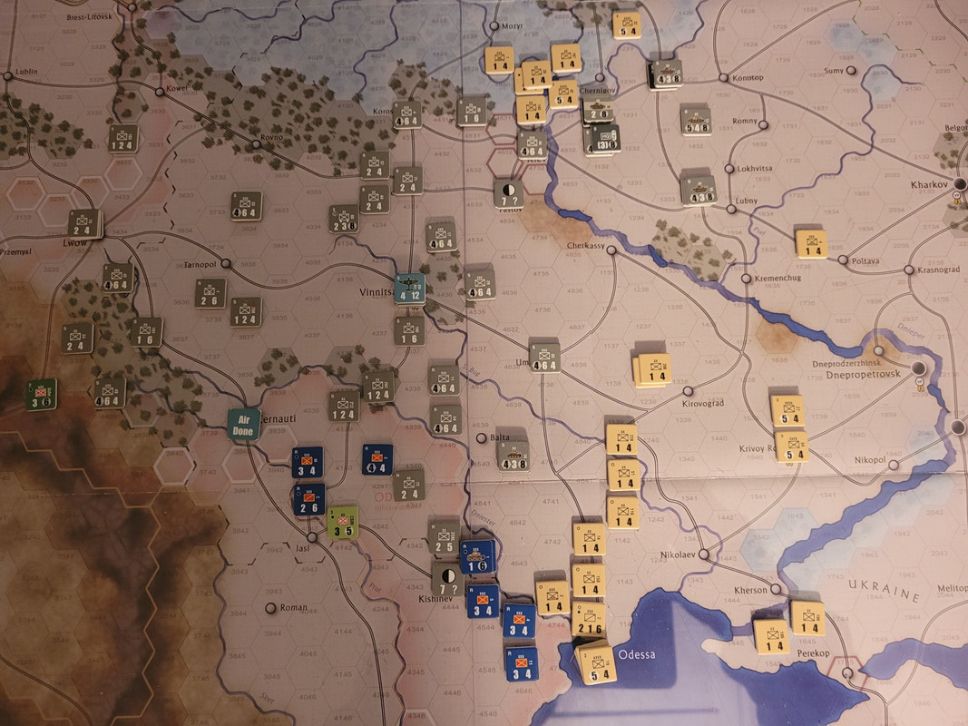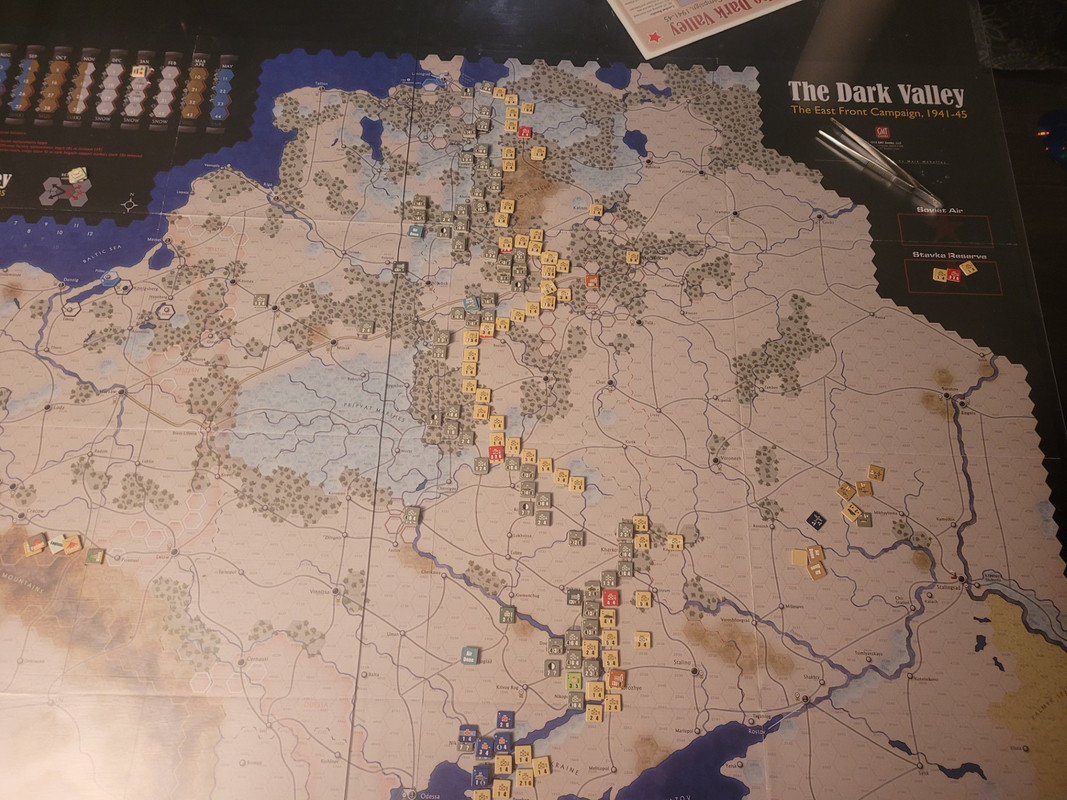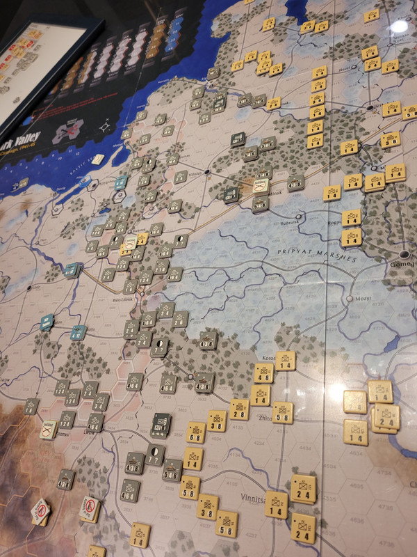Det har gått bra för tysken. Inte på något sätt orimligt, men då sovjetens move kom sent och logistiken allra sist så hade tysken gott om tid till att inringa ett stort antal fientliga förband. Chit-systemet gör att man aldrig vet när logistikbrickan dras, därför vet man inte när man kollar supply. Just den detaljen skapar mycket av spänningen initialt.